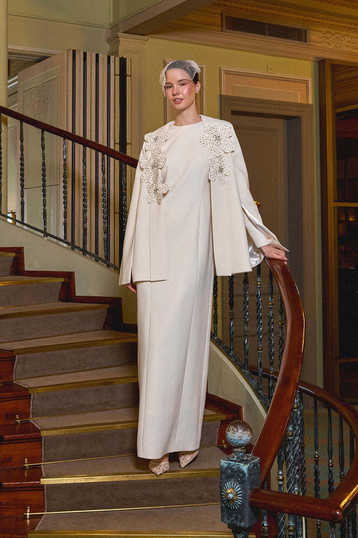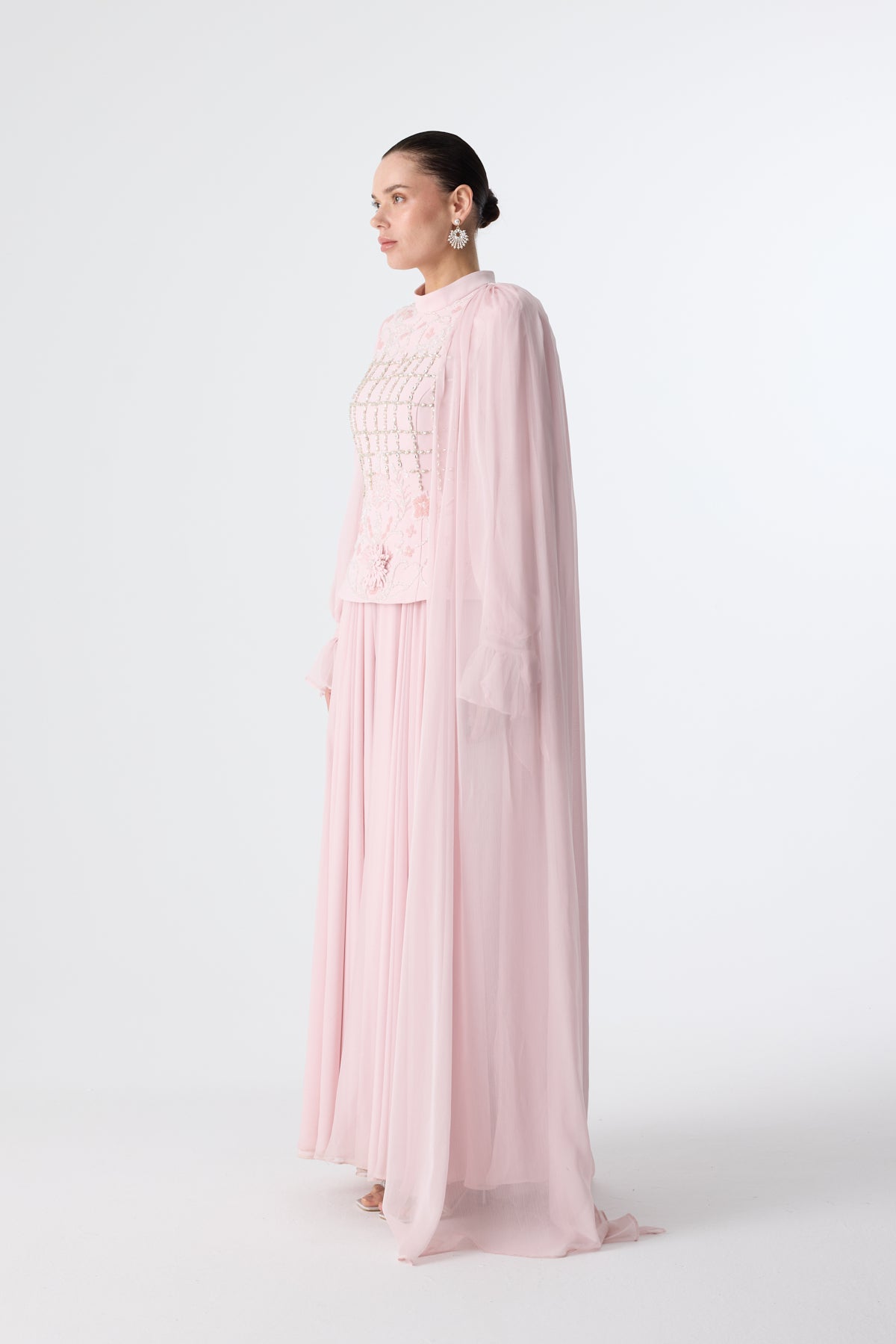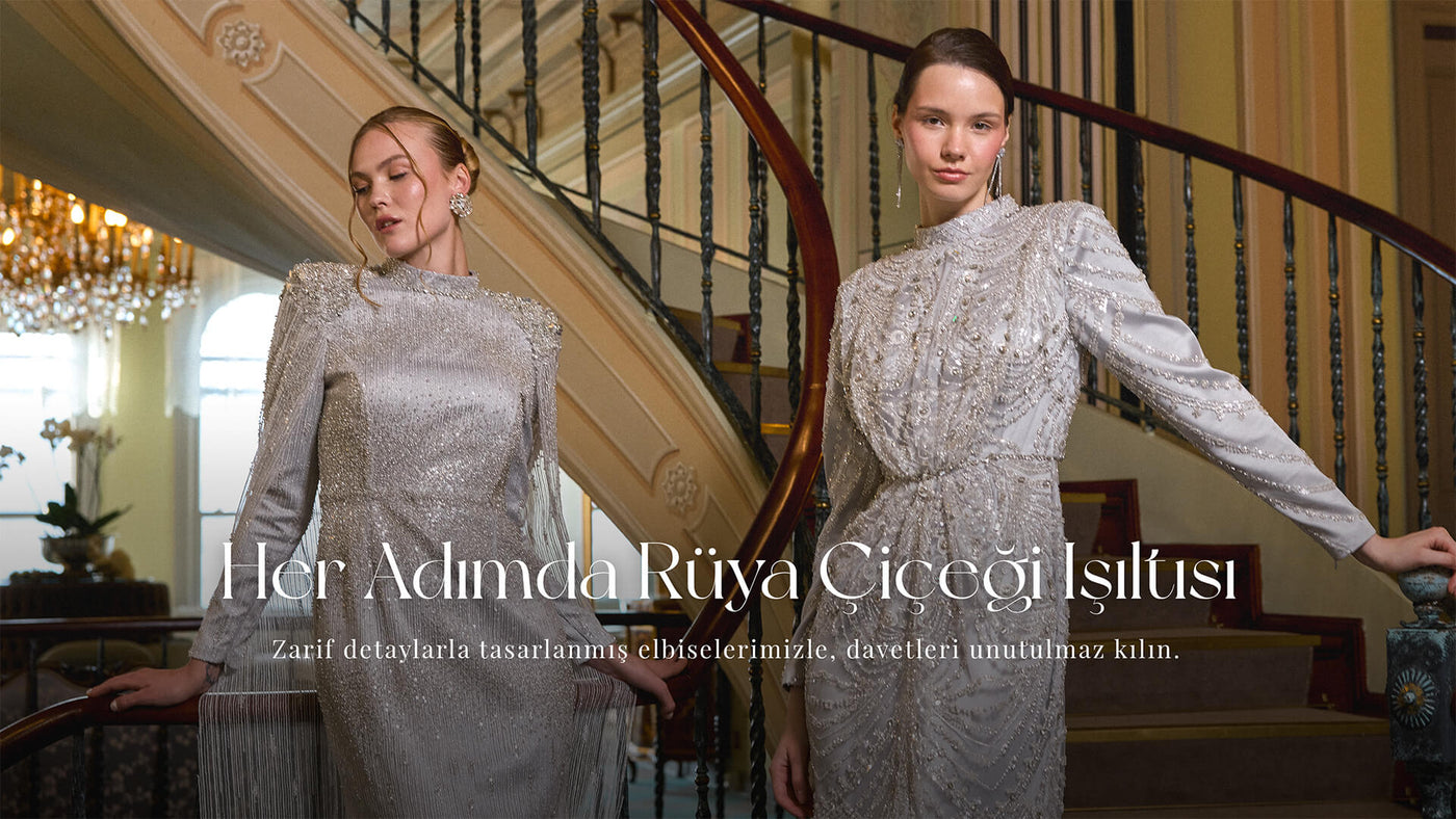 Ürün ortalama 155 cm. Ürünün arkası fermuarlıdır, astarlıdır. Özel üretilmiş ipek kumaş hazırlanmıştır. Sol omuzdan etek ucuna uzanan pelerini mevcuttur. El yapımı çiçekler ile hazırlanmıştır. Özel taşlar kullanılmıştır.