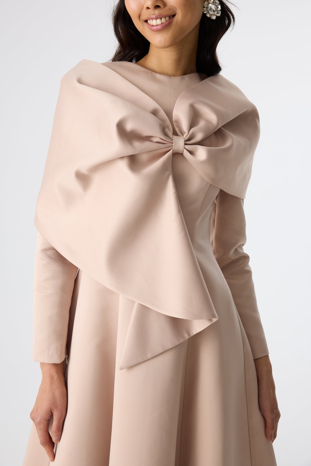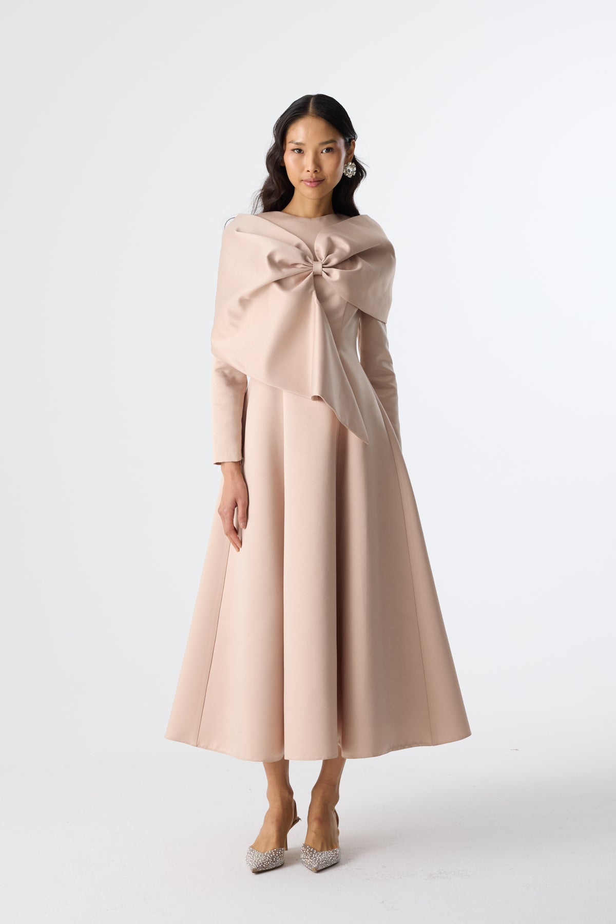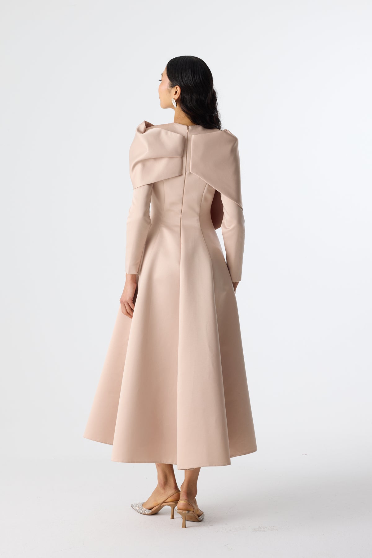 Ürün ortalama 130 cm. Elbisenin arkası fermuarlıdır, astarlıdır. Saten krep kumaştan hazırlanmıştır. Etek kısmı kloş formundadır. Ön görünümü fiyonk şeklinde çalışılmıştır.