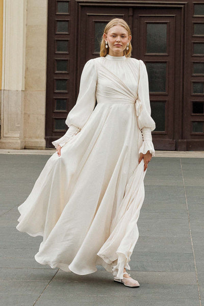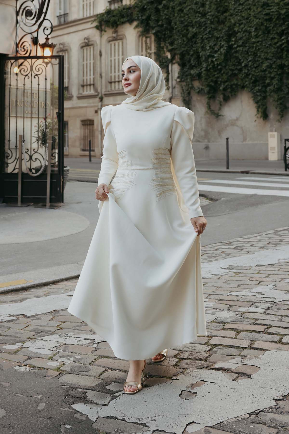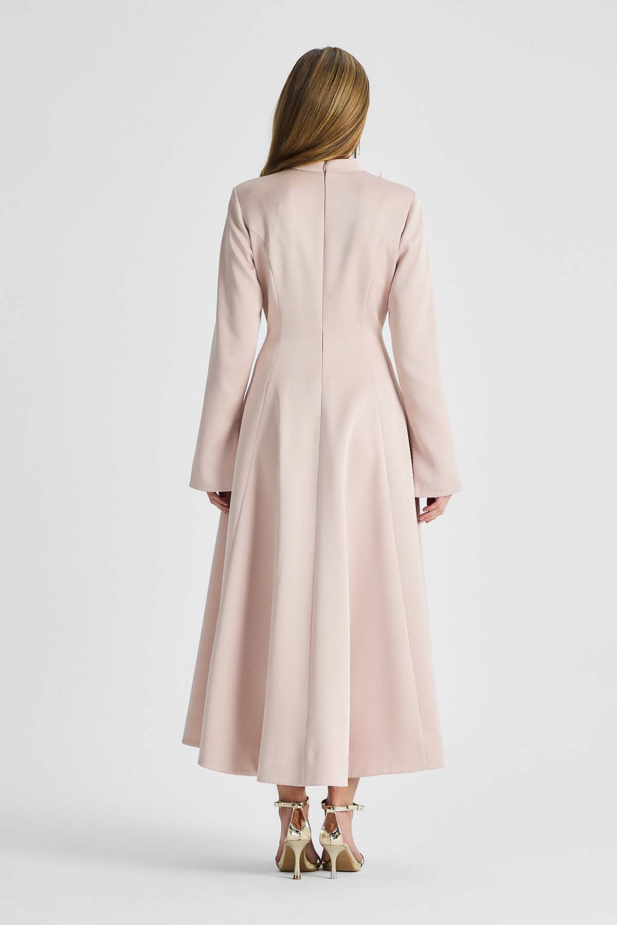 Ürün ortalama 155 cm. Ürünün arkası fermuarlıdır, astarlıdır. Özel üretilmiş ipek kumaş ile hazırlanmıştır. Kolları uzun manşetlidir. Kloş kesimdir.