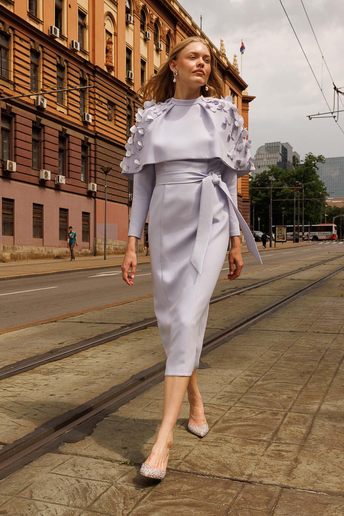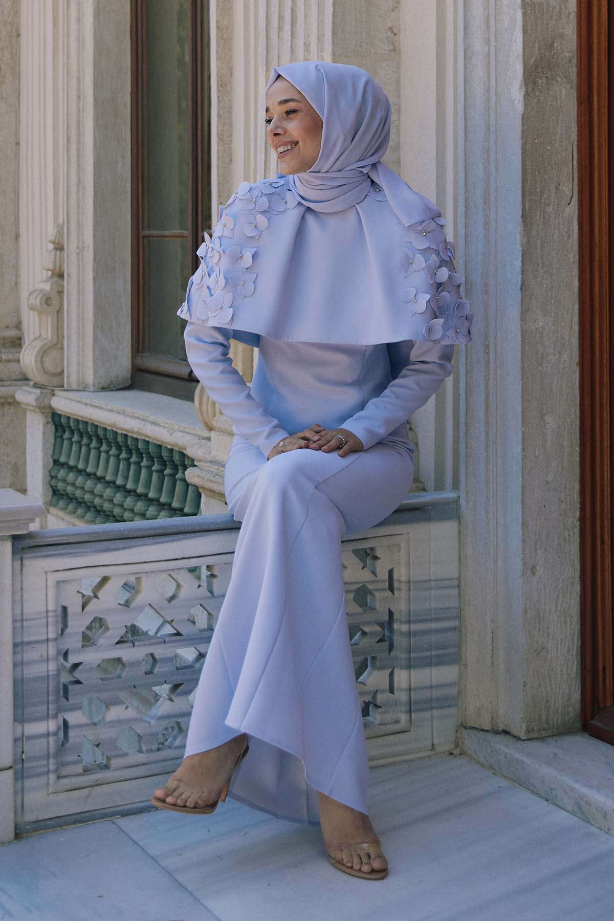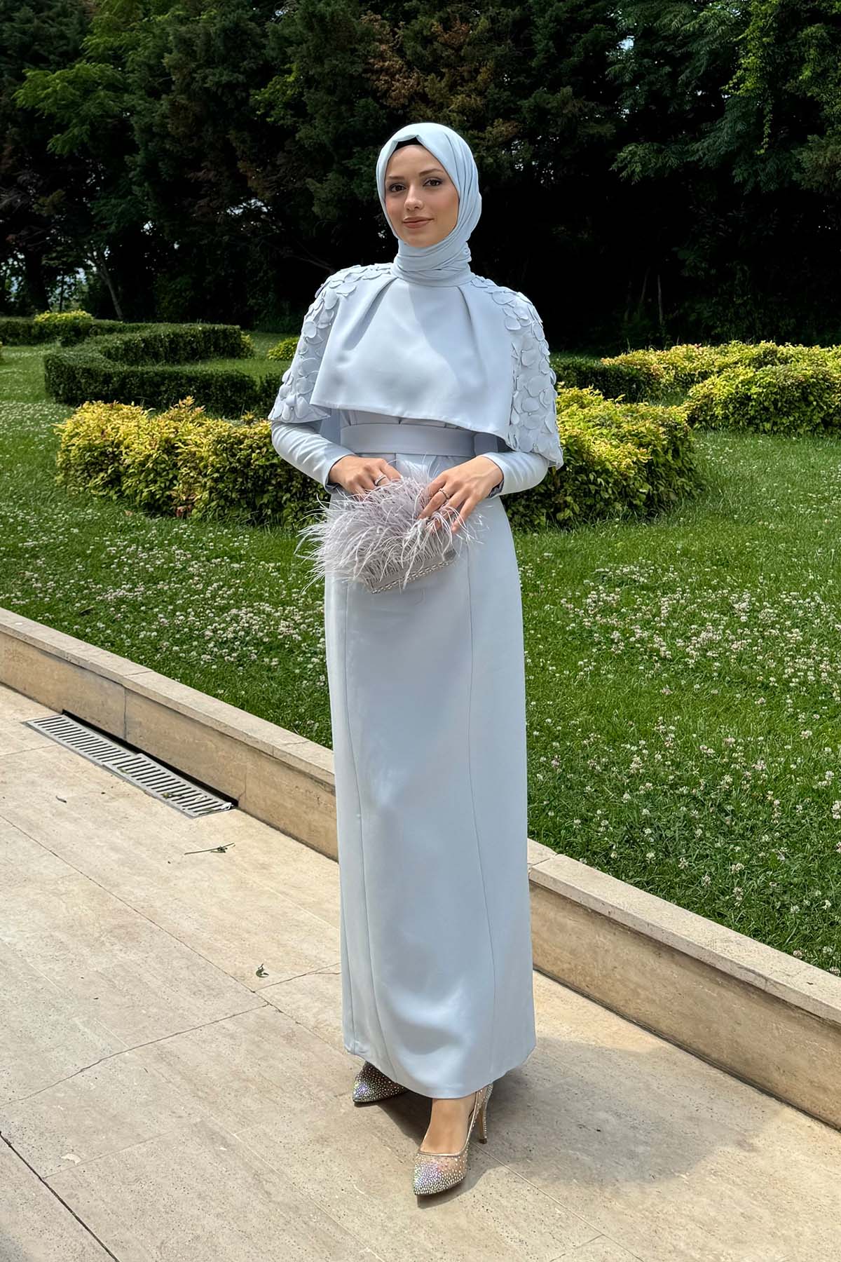 Ürün ortalama 150 cm. Elbisenin arkası fermuarlıdır, astarlıdır. Saten krep kumaştan hazırlanmıştır. Etek gelişi kalem formundadır. Omuz kısmından eteğe uzanan pelerini mevcuttur. Göğüs kısmındaki çiçekler el işçiliği ile özenle hazırlanmıştır.