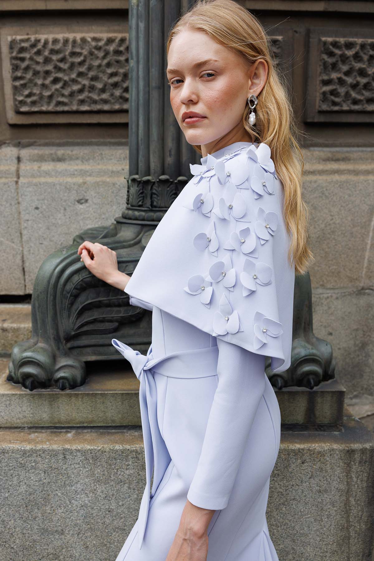 Ürün ortalama 140 cm. Elbisenin arkası fermuarlıdır, astarlıdır. Krep kumaştan hazırlanmıştır. Etek gelişi A kesim formundadır. Ön pelerin kısmı el işçiliği ile tasarlanmış çiçeklerden ve taşlardan hazırlanmıştır.