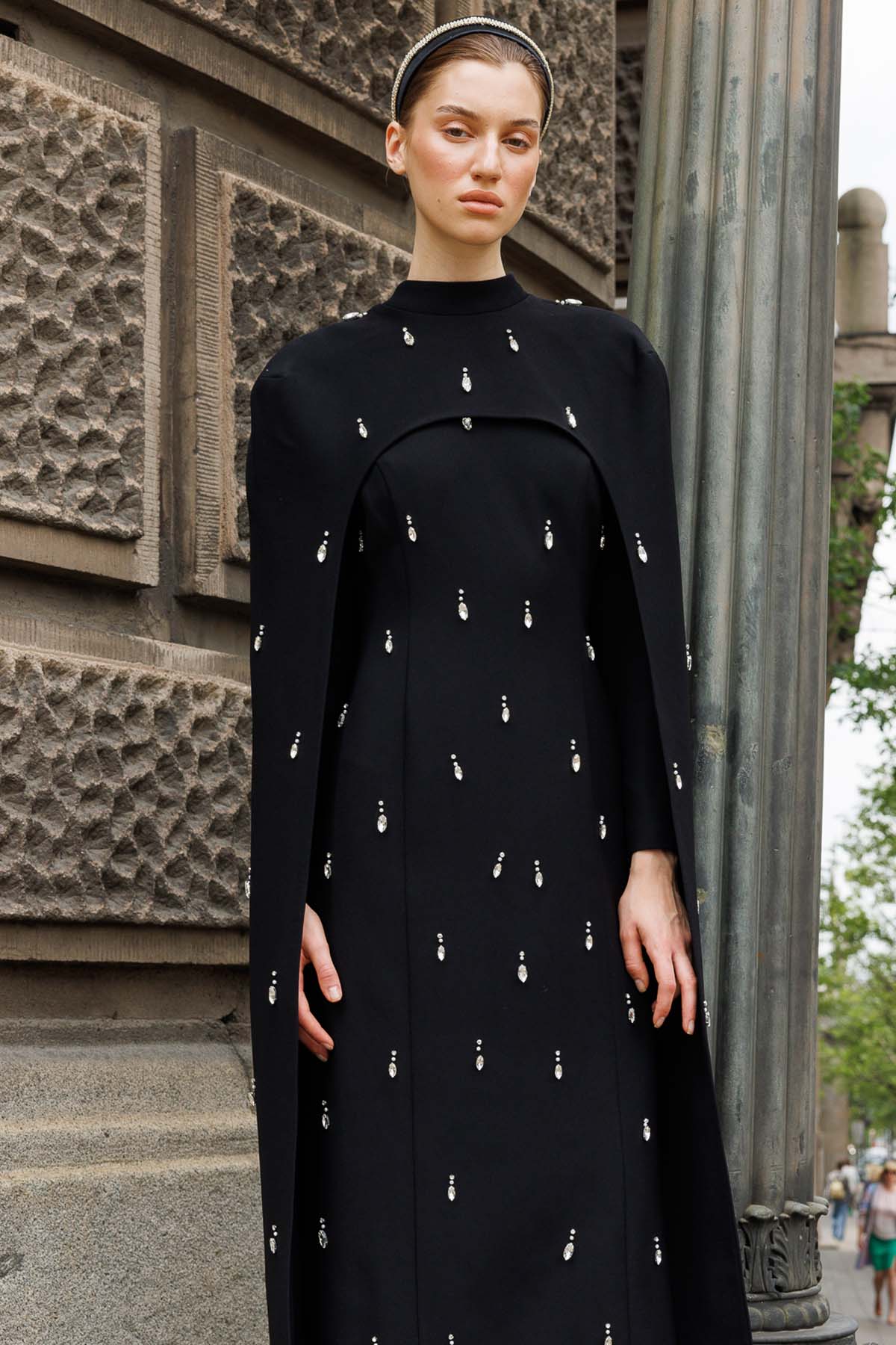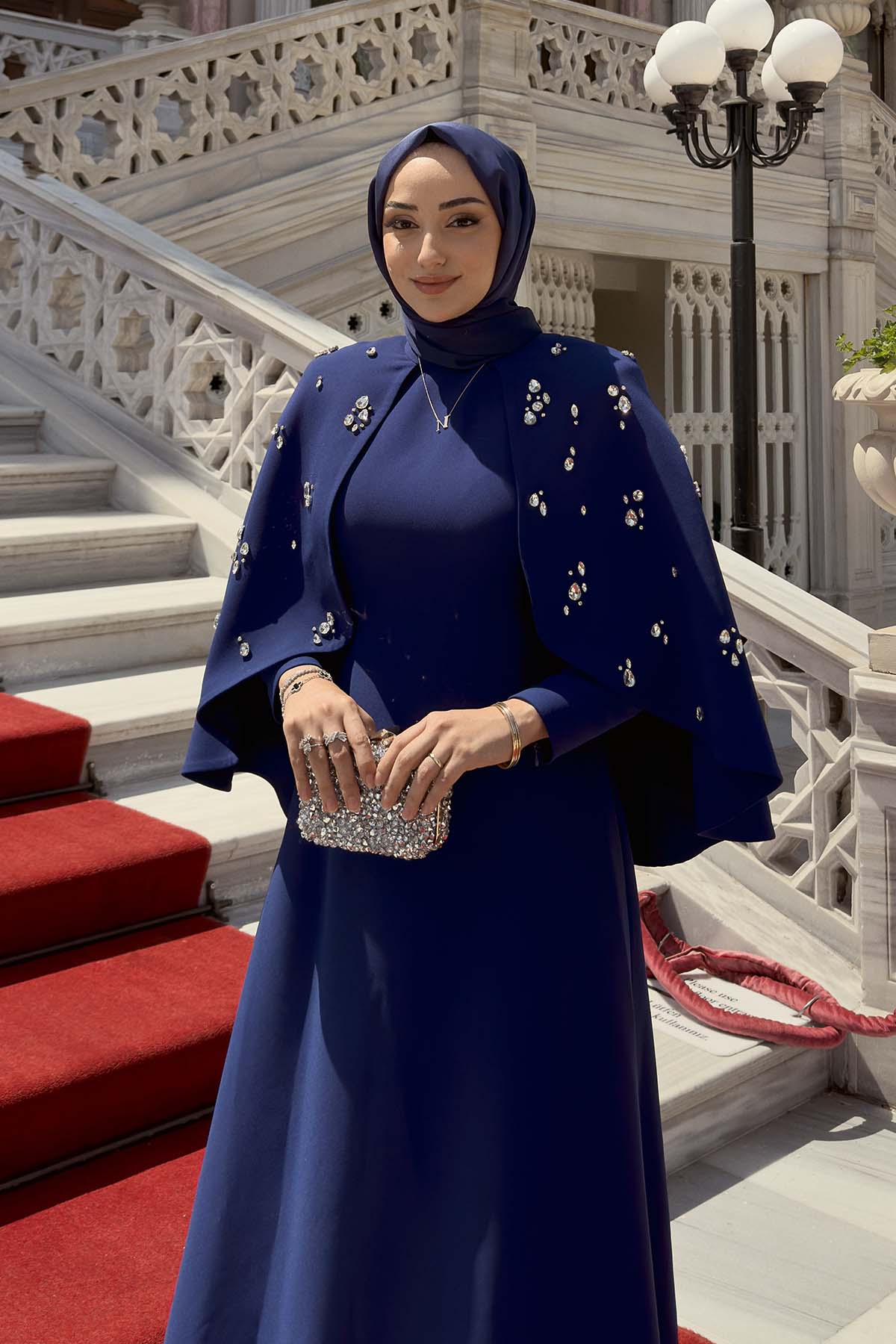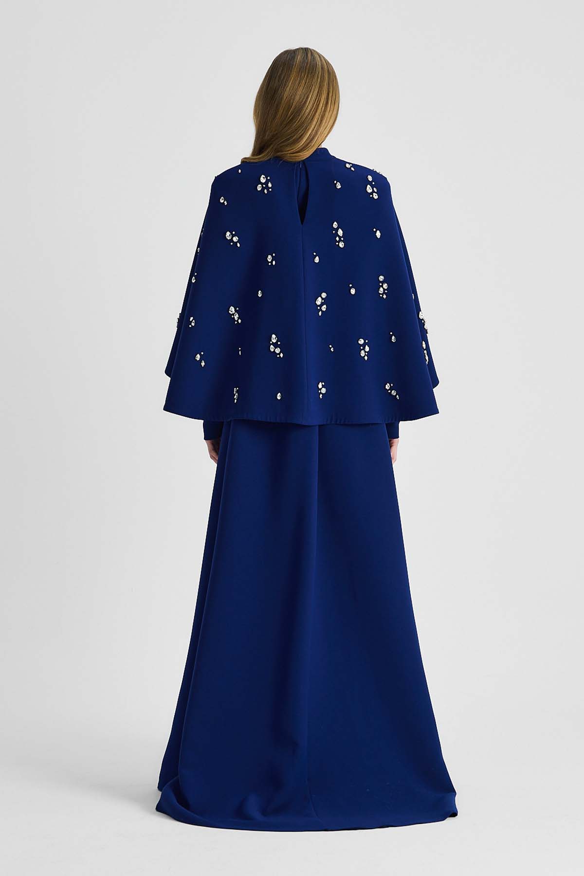 Ürün ortalama 135 cm. Elbisenin arkası fermuarlıdır, astarlıdır. Krep kumaştan hazırlanmıştır. Etek gelişi kalem formundadır. Omuz kısmından eteğe uzanan pelerini mevcuttur. Özel taşlarla özenle el işçiliği ile işlenmiştir.