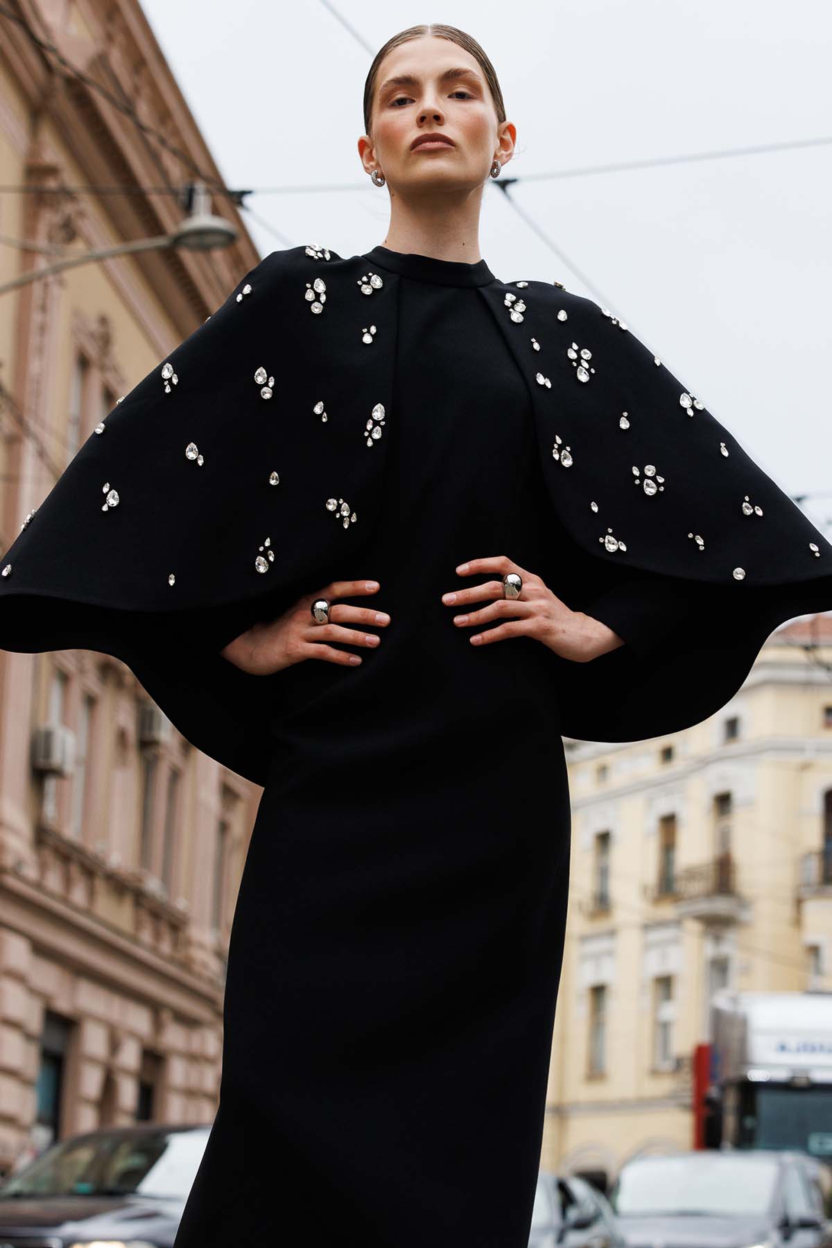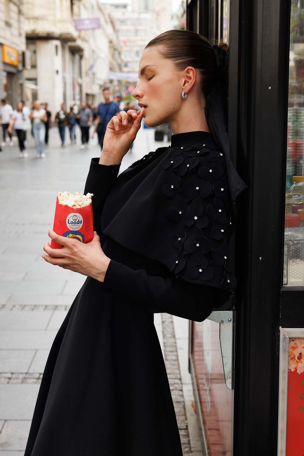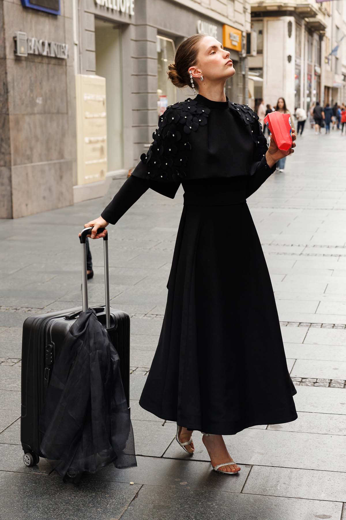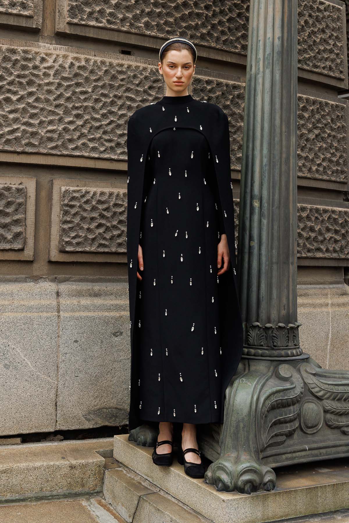 Ürün ortalama 135 cm. Elbisenin arkası fermuarlıdır, astarlıdır. Krep kumaştan hazırlanmıştır. Etek gelişi kalem formundadır. Omuz kısmından eteğe uzanan pelerini mevcuttur. Özel taşlarla özenle el işçiliği ile işlenmiştir.