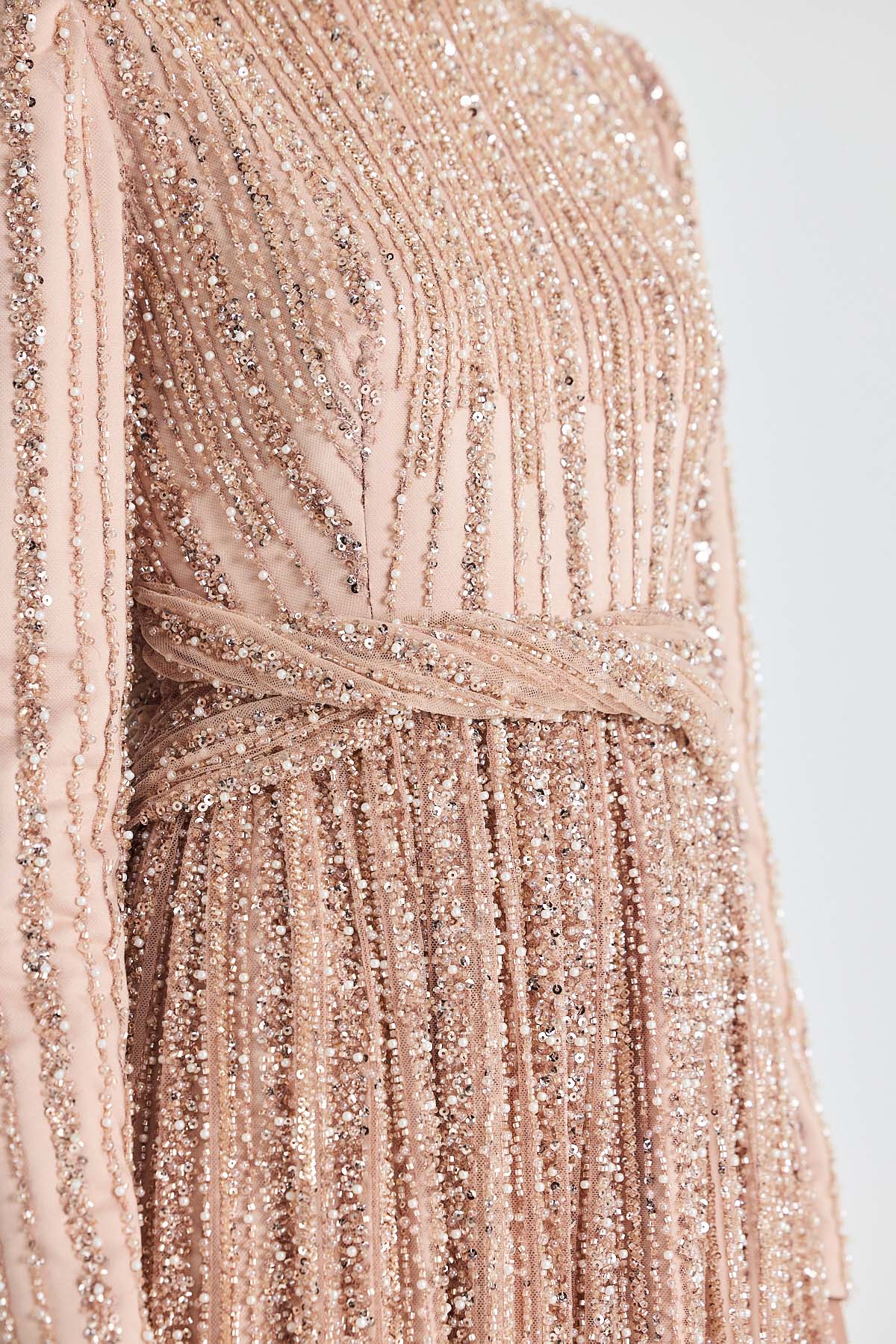 Ürün ortalama 135 cm. Elbisenin arkası fermuarlıdır, astarlıdır. Krep kumaştan hazırlanmıştır. Bel kısmındaki detaylar özel taşlarla özenle el işçiliği ile işlenmiştir.