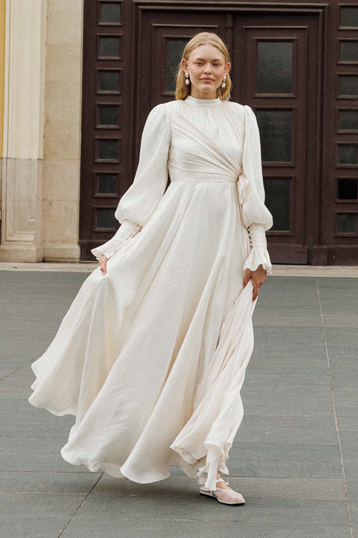 Ürün ortalama 155 cm. Ürünün arkası fermuarlıdır, astarlıdır. Özel üretilmiş ipek kumaş ile hazırlanmıştır. Kolları volanlıdır. Kloş kesimdir.