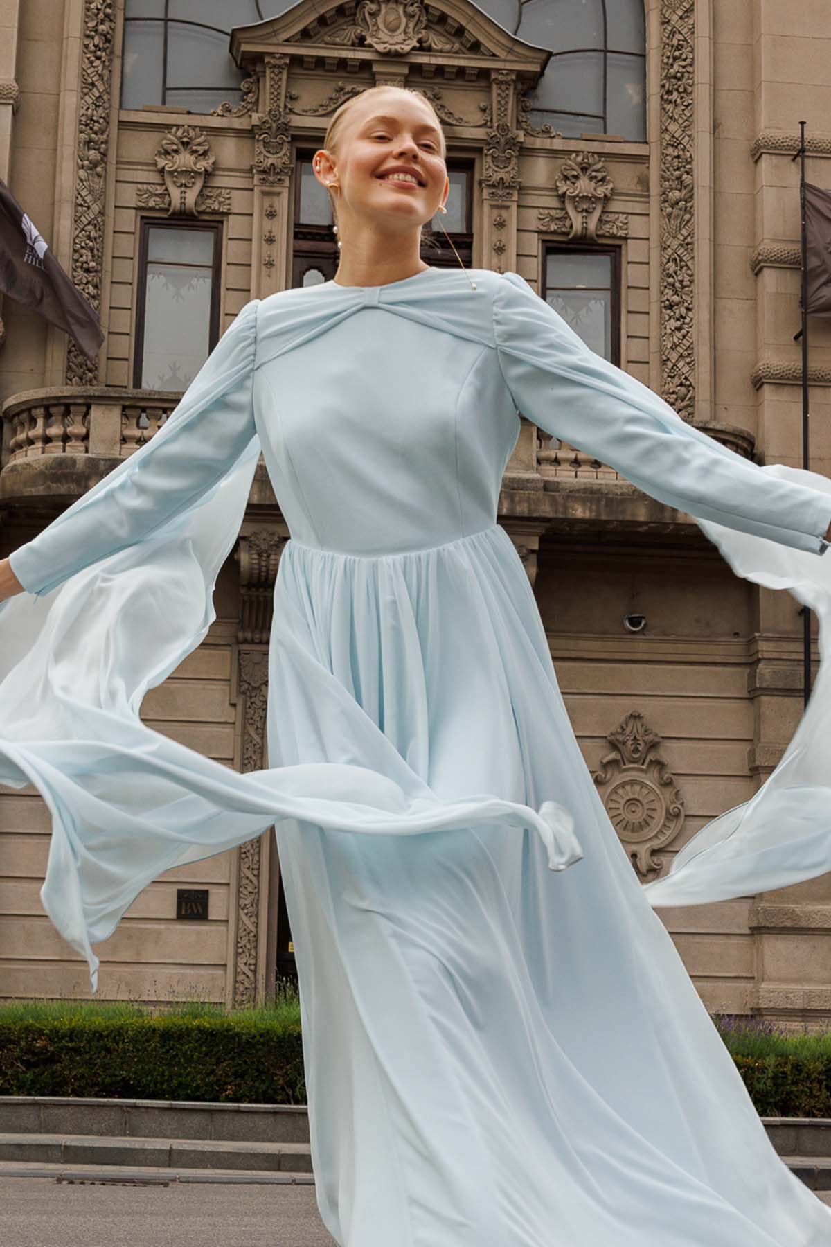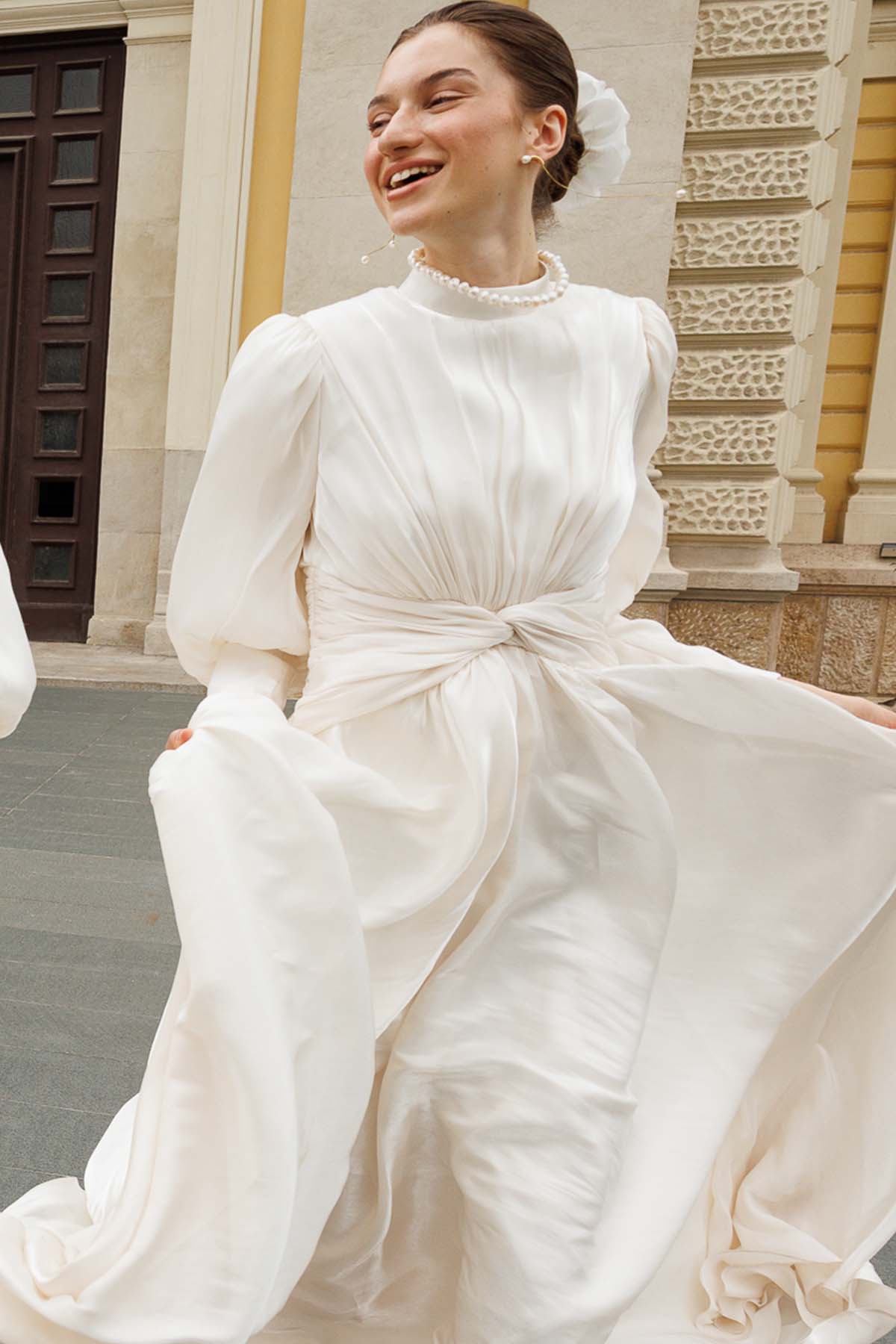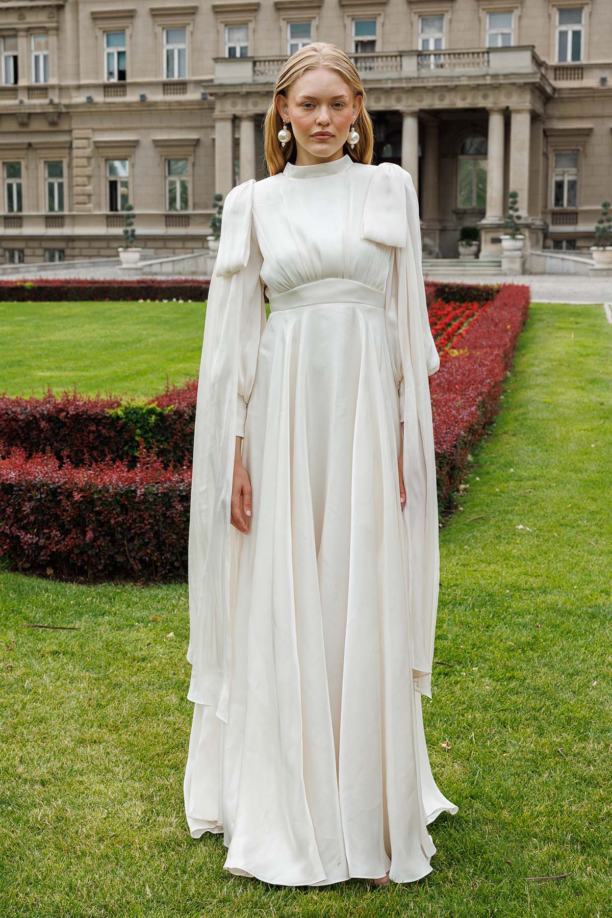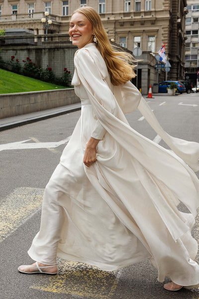 Ürün ortalama 155 cm. Ürünün arkası fermuarlıdır, astarlıdır ve arkası kuyrukludur. Özel üretilmiş ipek kumaş ile hazırlanmıştır. Kollarında bağlama detayı mevcuttur.