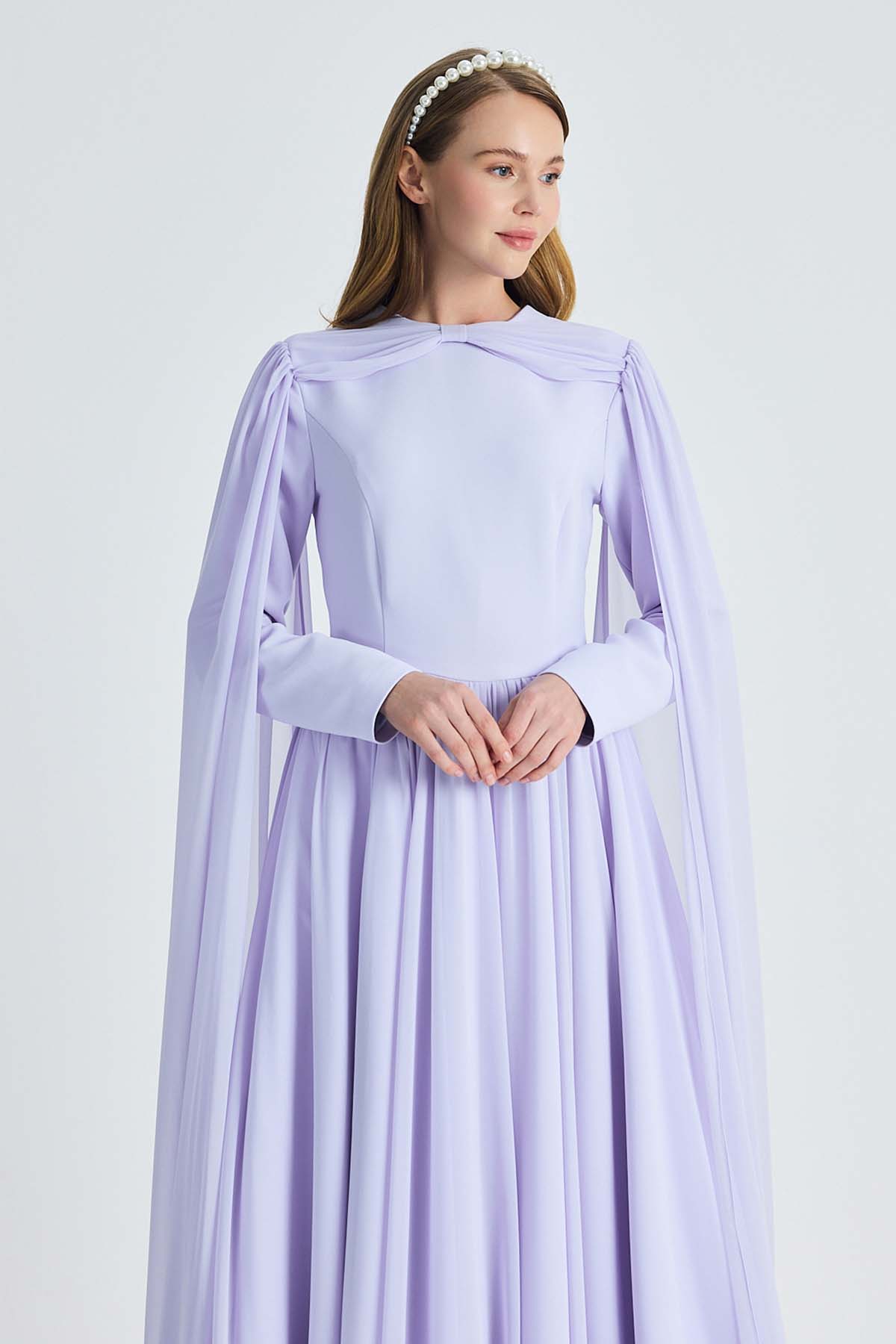 Ürün ortalama 130 cm. Ürünün arkası fermuarlıdır, astarlıdır. Şifon kumaşa pilise işlem uygulanmıştır. Omuzlarından yere doğru inen şifon pelerin detayı mevcuttur.