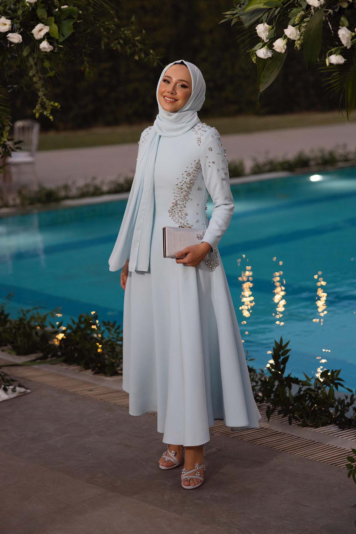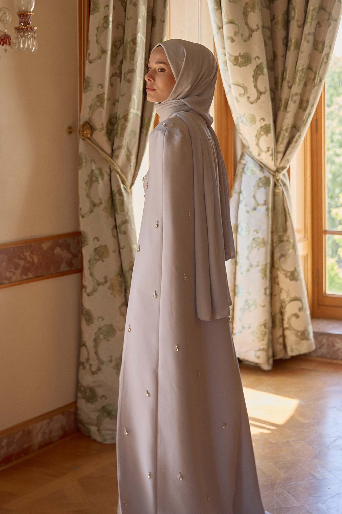 Ürünün iç elbisesi ortalama 135 cm. Adriana kumaştan üretilmiştir. Abaya kısmı ortalama 130 cm. Kollarında ve yaka ksımında inci işlemeleri mevcuttur.