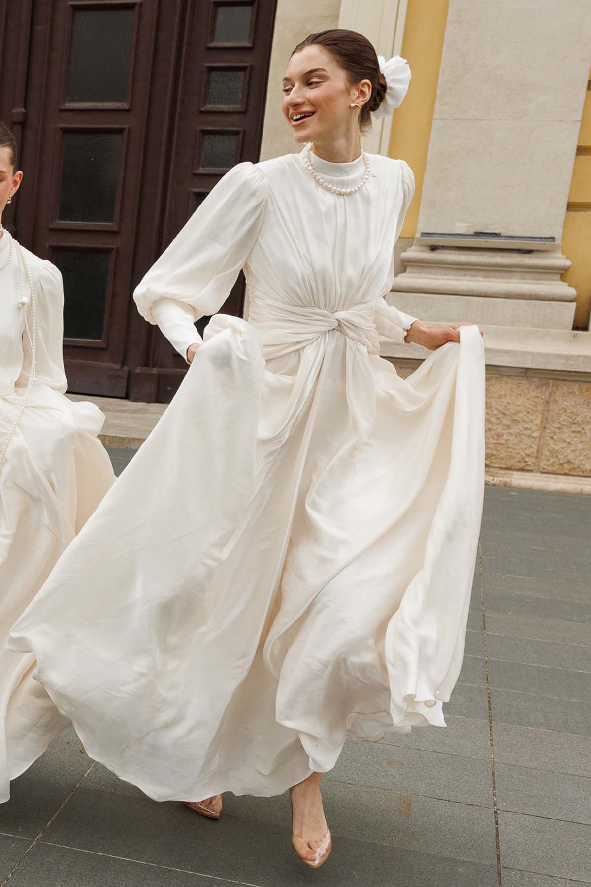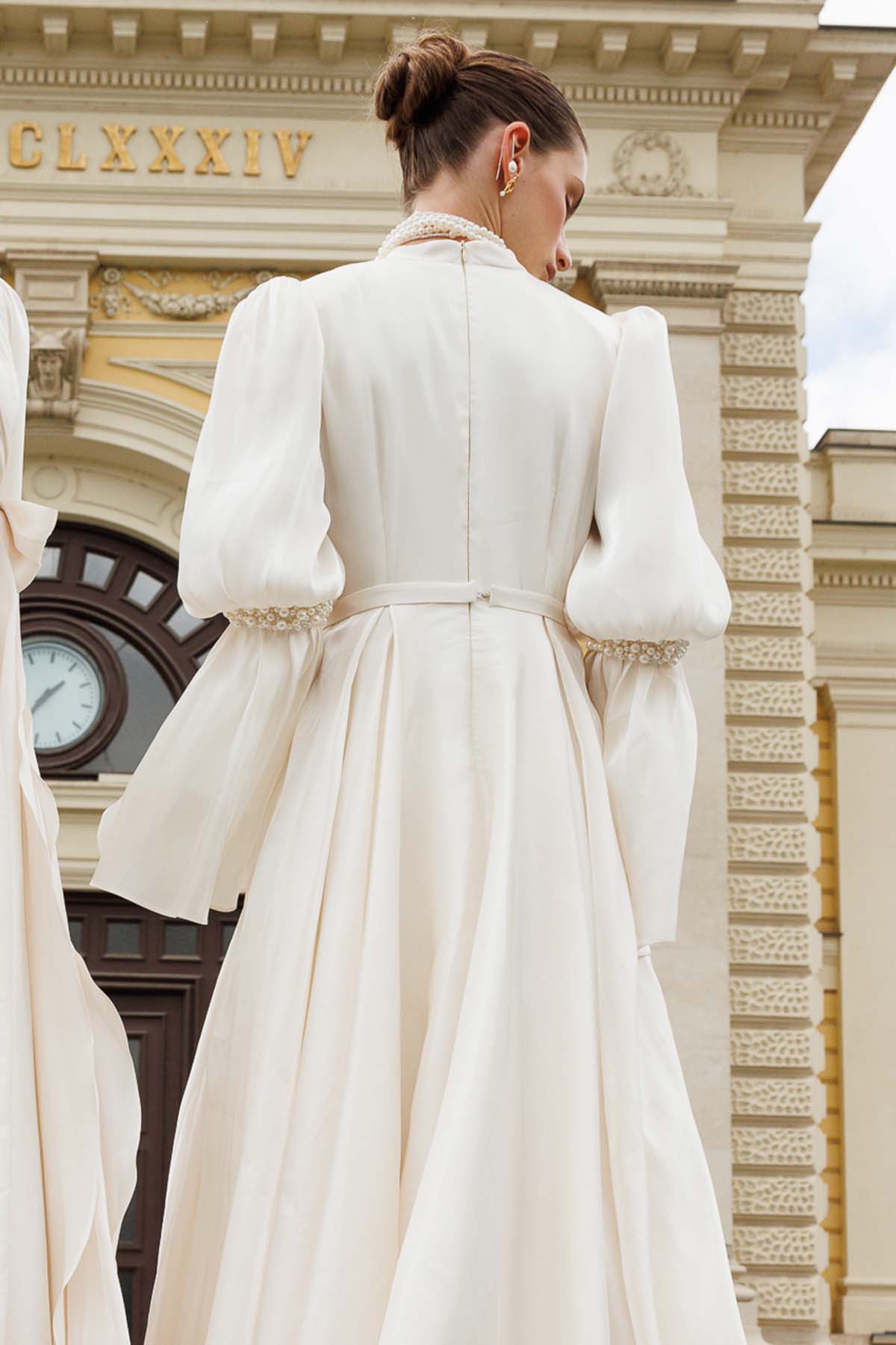 Ürün ortalama 155 cm. Ürünün arkası fermuarlıdır, astarlıdır. Özel üretilmiş ipek kumaş ile hazırlanmıştır. Kollarında volanlıdır. İnci işlemeleri mevcuttur. Kloş kesimdir.