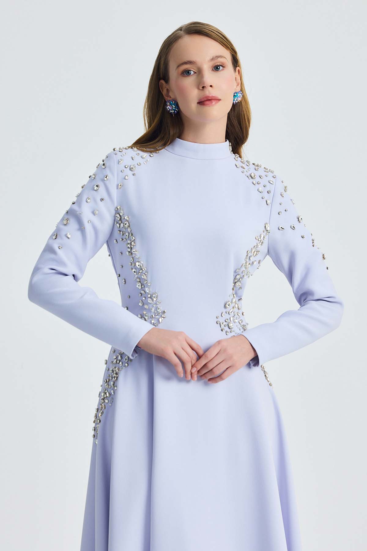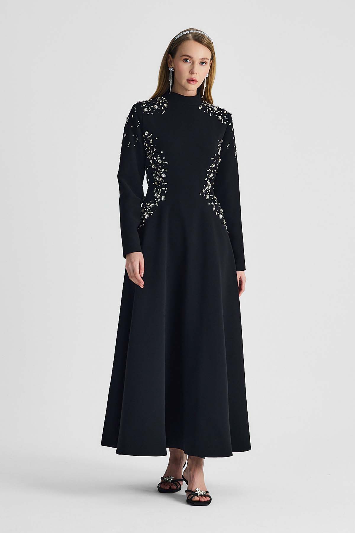 Ürünün iç elbisesi ortalama 115cm. Adriana kumaştan üretilmiştir. Abaya kısmı ortalama 125 cm. Kollarında ve yaka ksımında kristal taş işlemeleri mevcuttur.