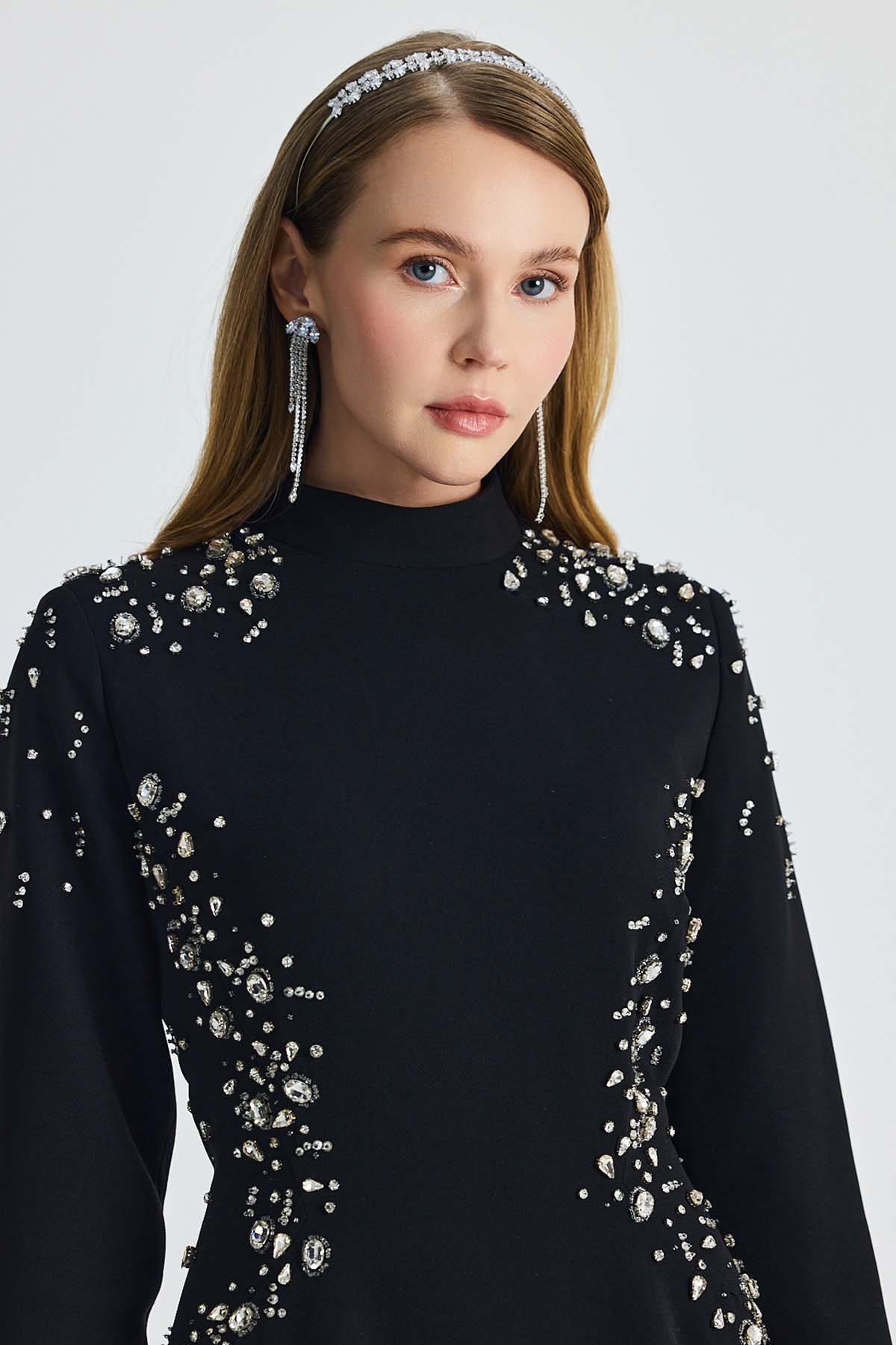 Ürün ortalama 155 cm. Ürünün arkası fermuarlıdır, astarlıdır. Saten krep kumaştan hazırlanmıştır. Kollarında özel taşlarla özenle el işçiliği ile işlenmiş taşlar mevcuttur.