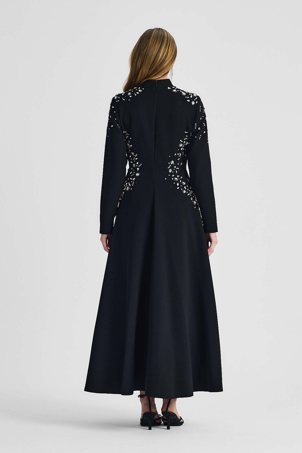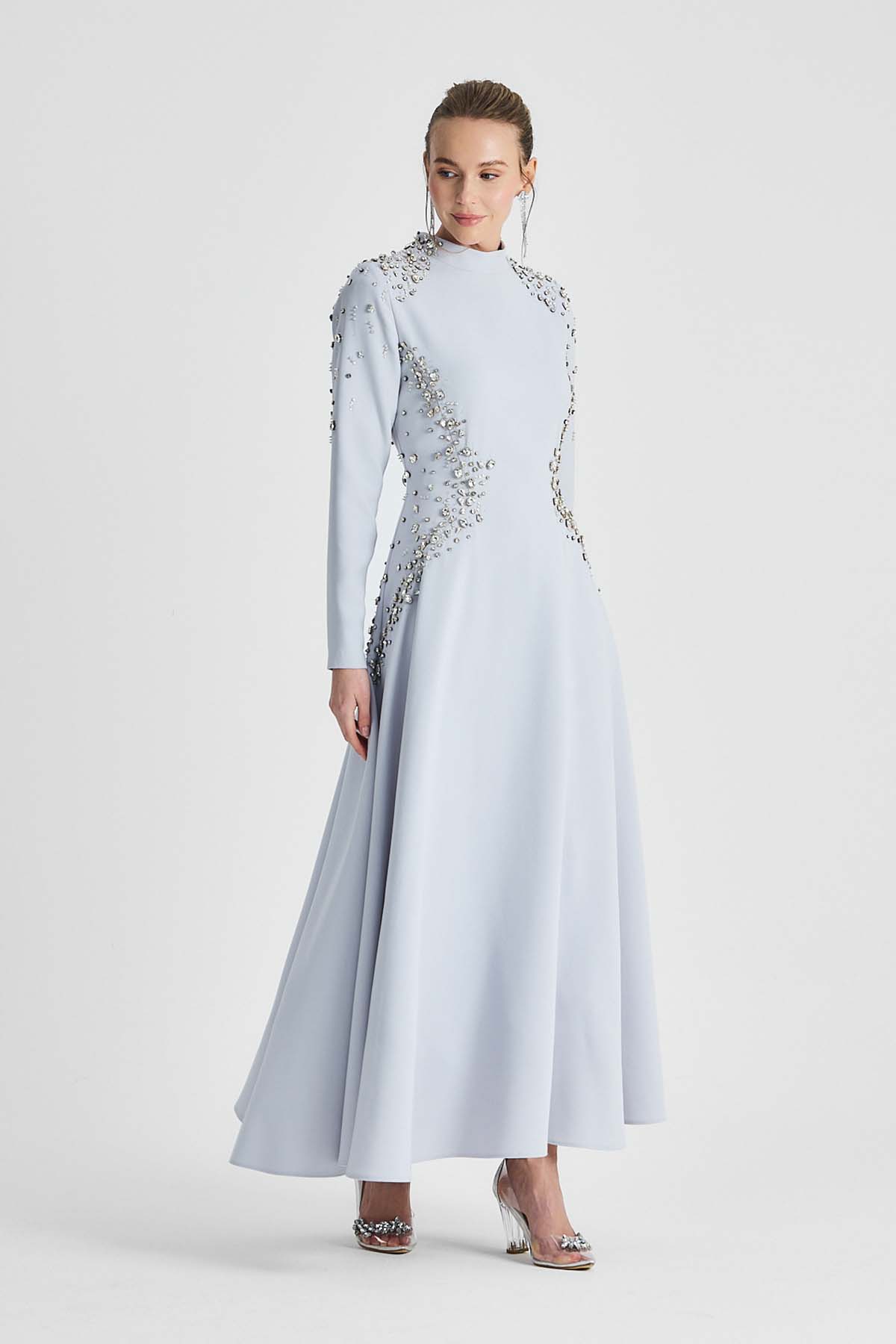 Ürün ortalama 135cm. Elbisenin arkası fermuarlıdır, astarlıdır. Krep kumaştan hazırlanmıştır. Özel taşlarla özenle el işçiliği ile işlenmiştir.