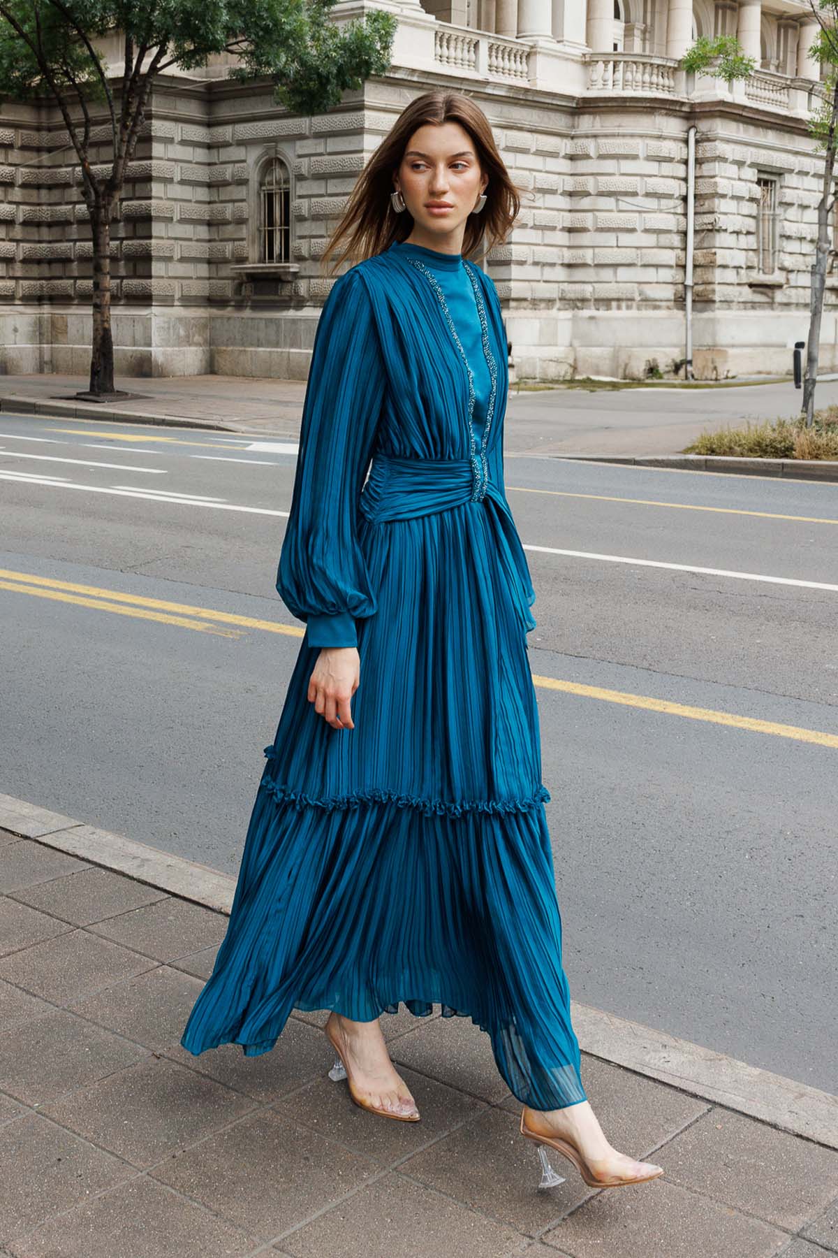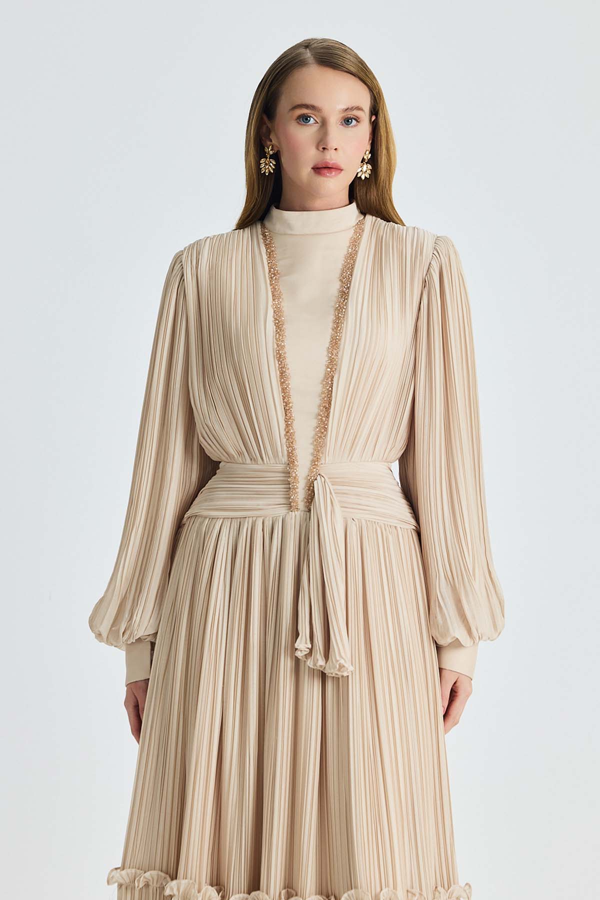 Ürün ortalama 135 cm. Ürünün arkası fermuarlıdır, astarlıdır. Şifon kumaşa pilise işlem uygulanmıştır. İşleme detayları el işçiliği ile tamamlanmıştır.