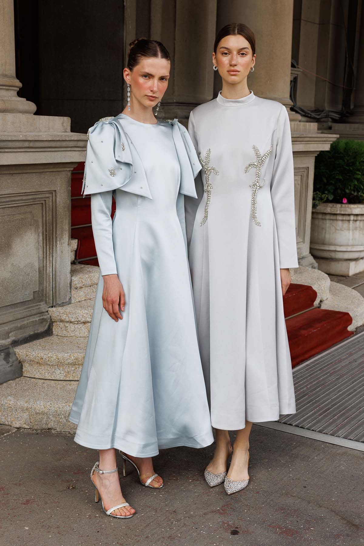 Ürün ortalama 150 cm. Ürünün arkası fermuarlıdır, astarlıdır. Şifon kumaştan hazırlanmıştır. Omuz kısmında şifon pelerin mevcuttur. Kloş etek formuna sahiptir. Özel kristal taşlarla el işçiliği ile işlenmiştir.