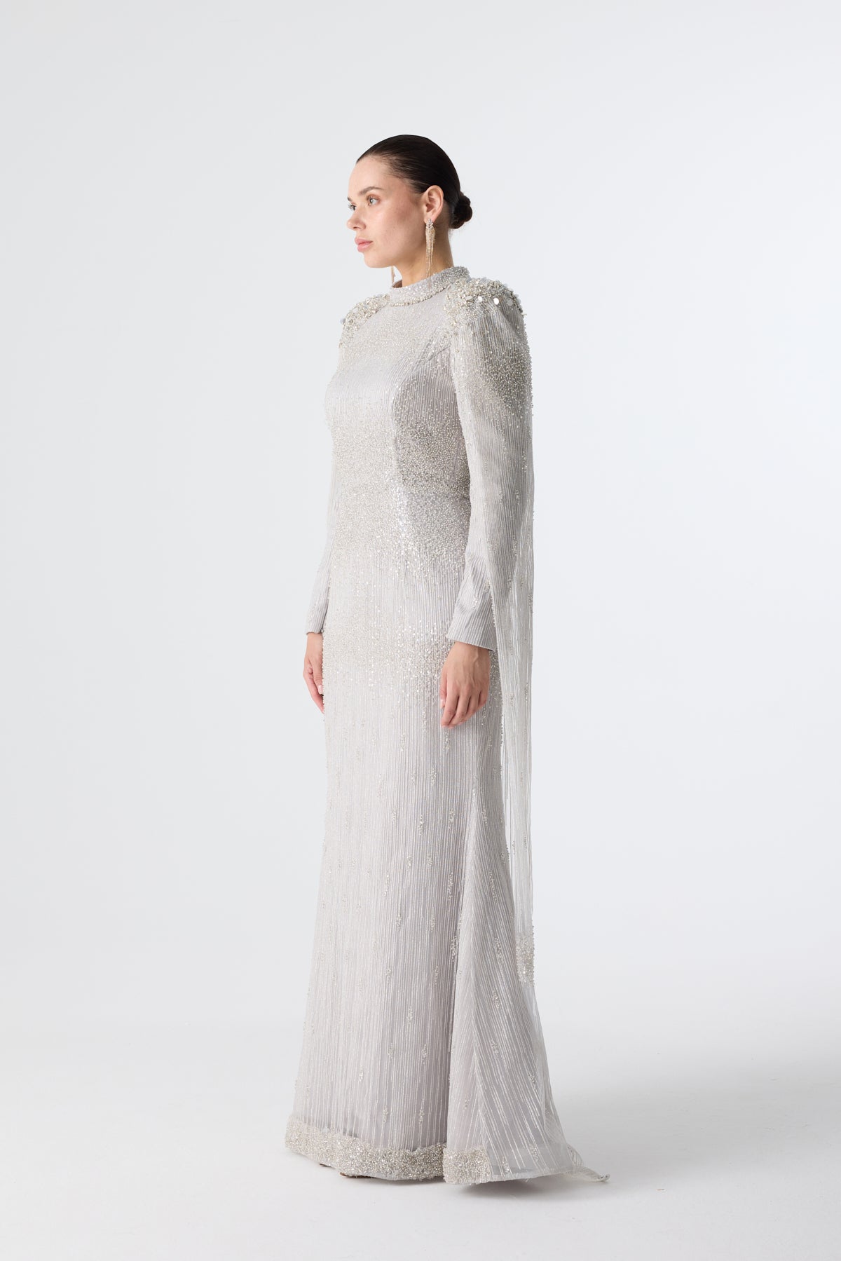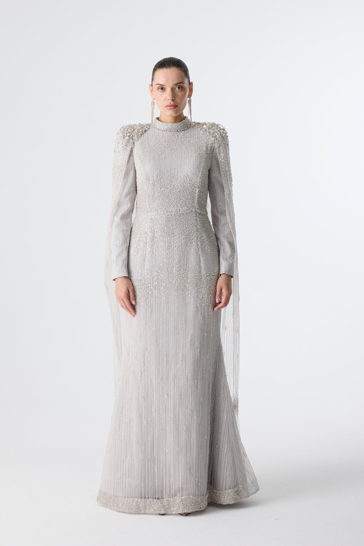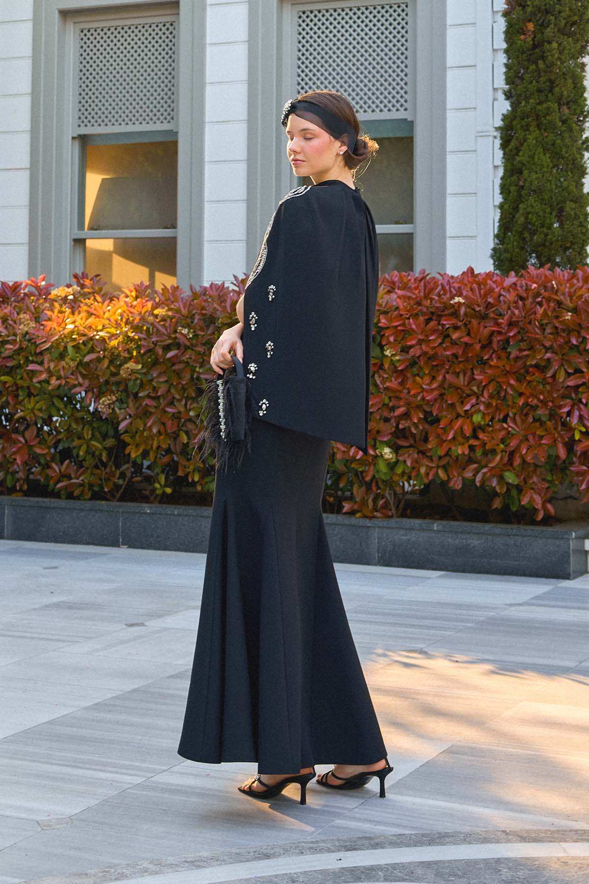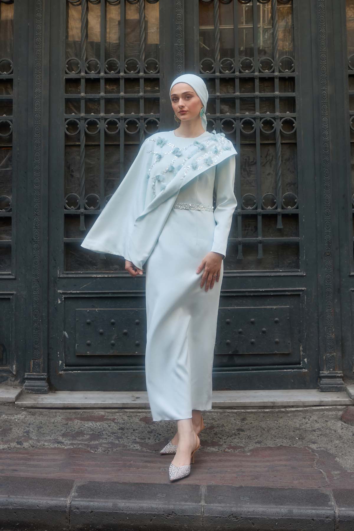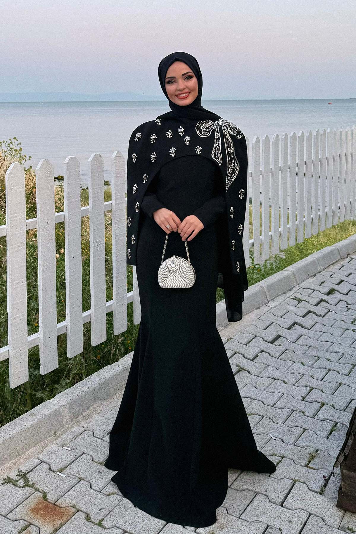 Ürün ortalama 135 cm. Elbisenin arkası fermuarlıdır, astarlıdır. Krep kumaştan hazırlanmıştır. Etek gelişi kalem formundadır. Omuz kısmından eteğe uzanan pelerini mevcuttur. Özel taşlarla özenle el işçiliği ile işlenmiştir.