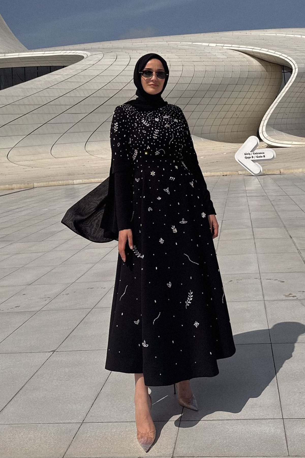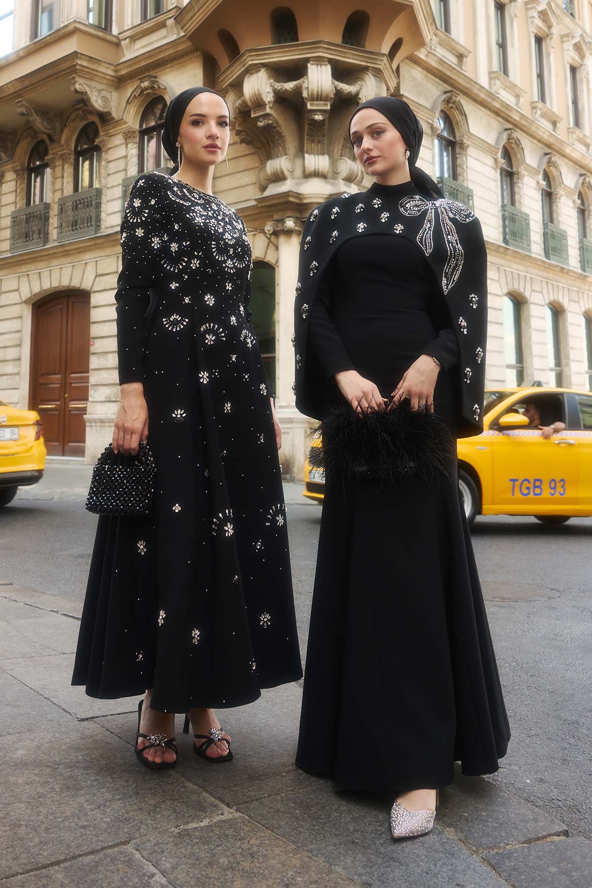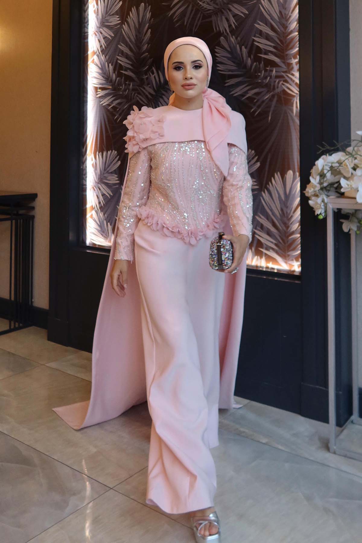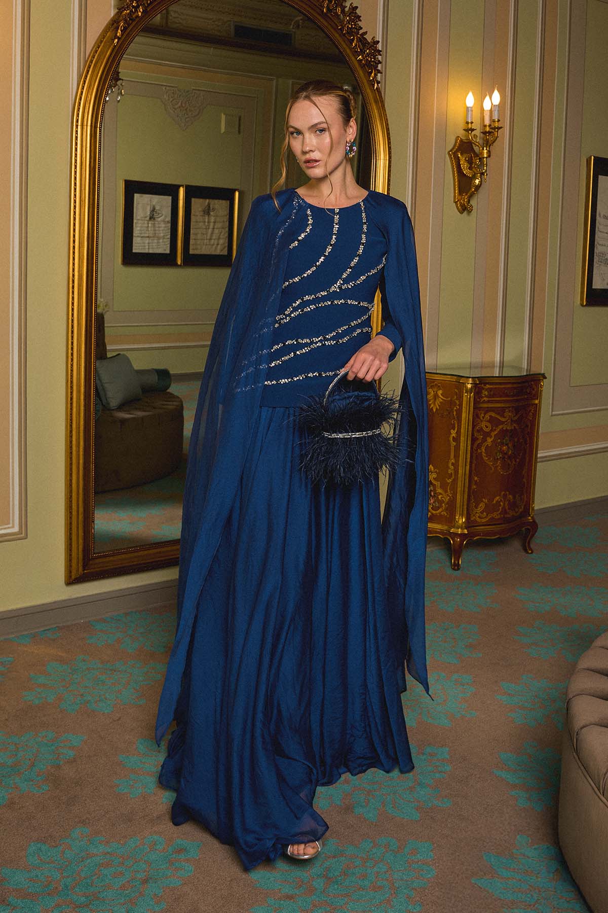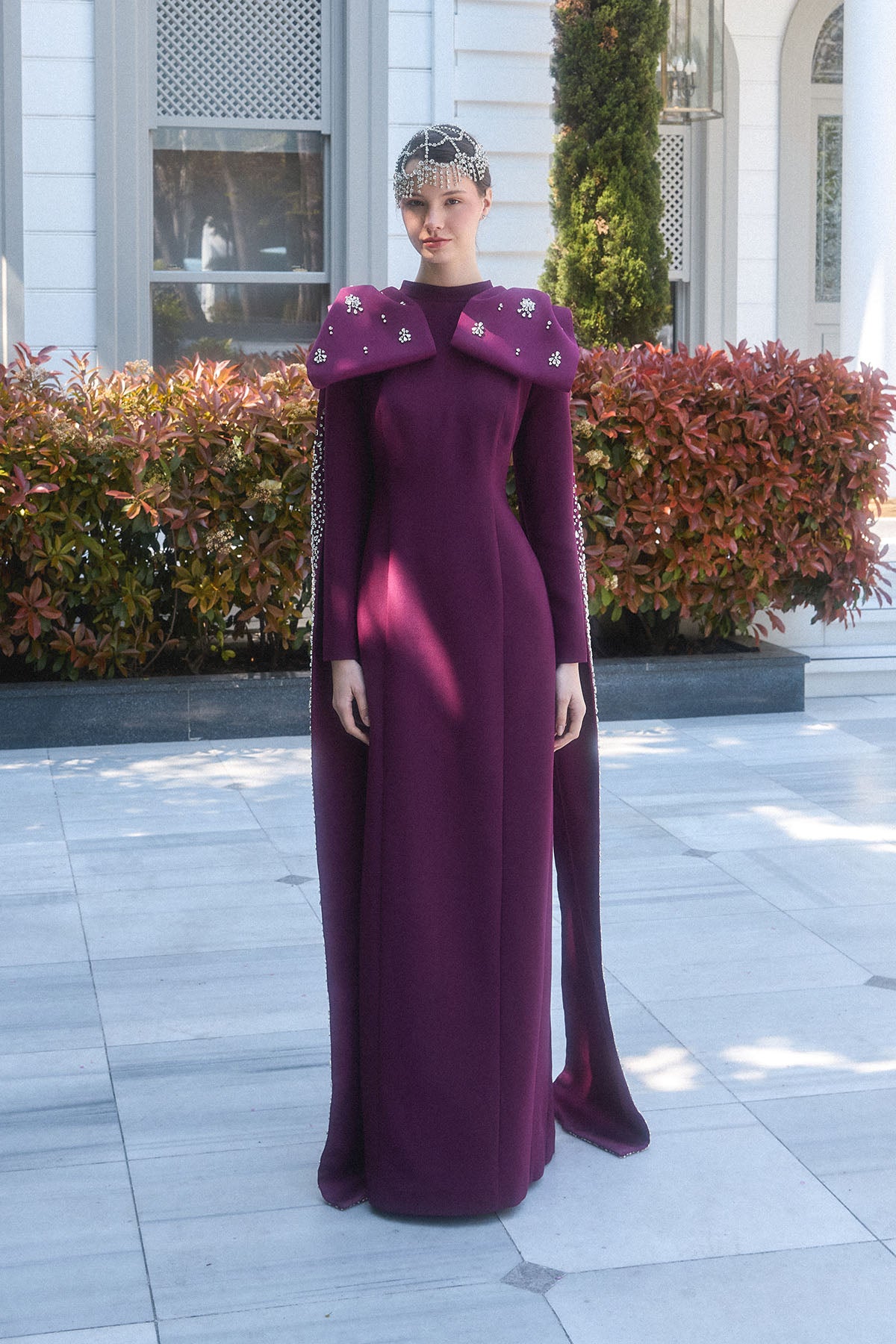 Ürün ortalama 135 cm. Elbisenin arkası fermuarlıdır, astarlıdır. Krep kumaştan hazırlanmıştır. Etek gelişi kalem formundadır. Omuz kısmından eteğe uzanan pelerini mevcuttur. Özel taşlarla özenle el işçiliği ile işlenmiştir.