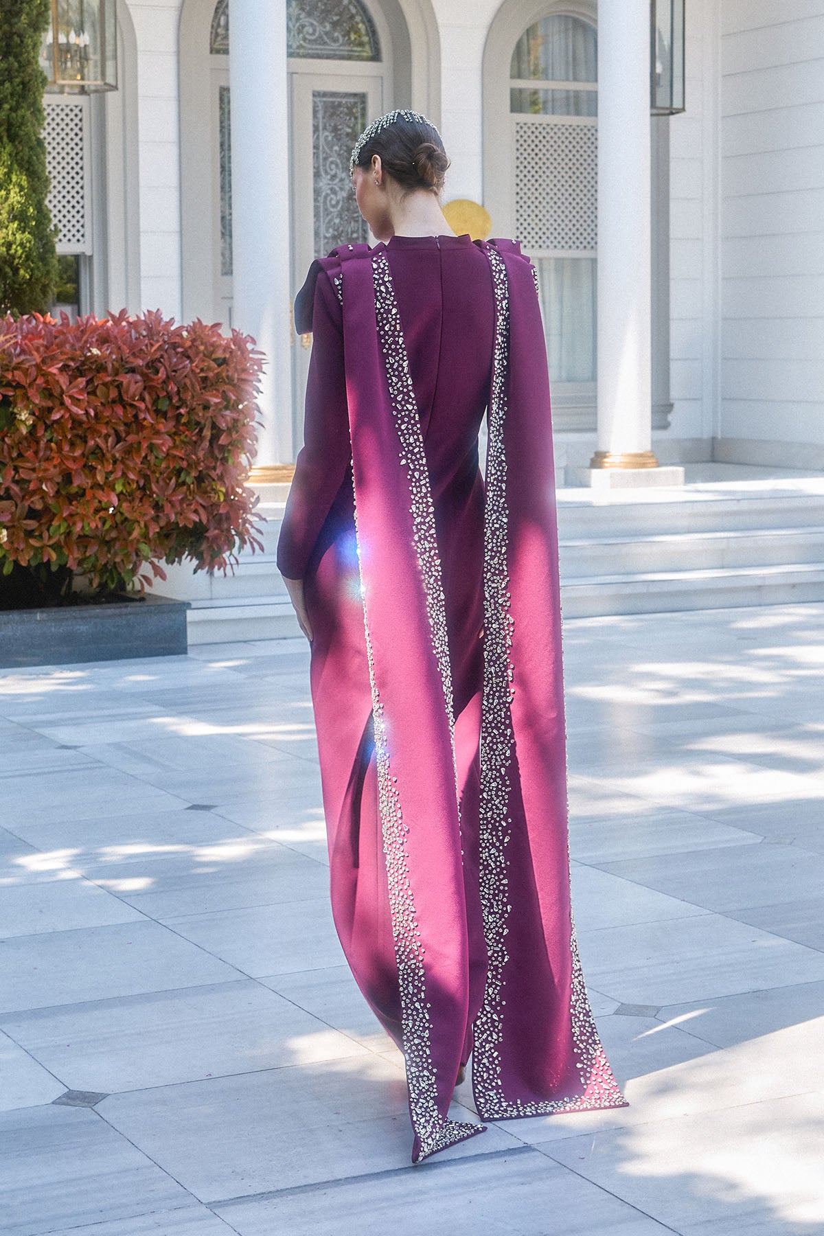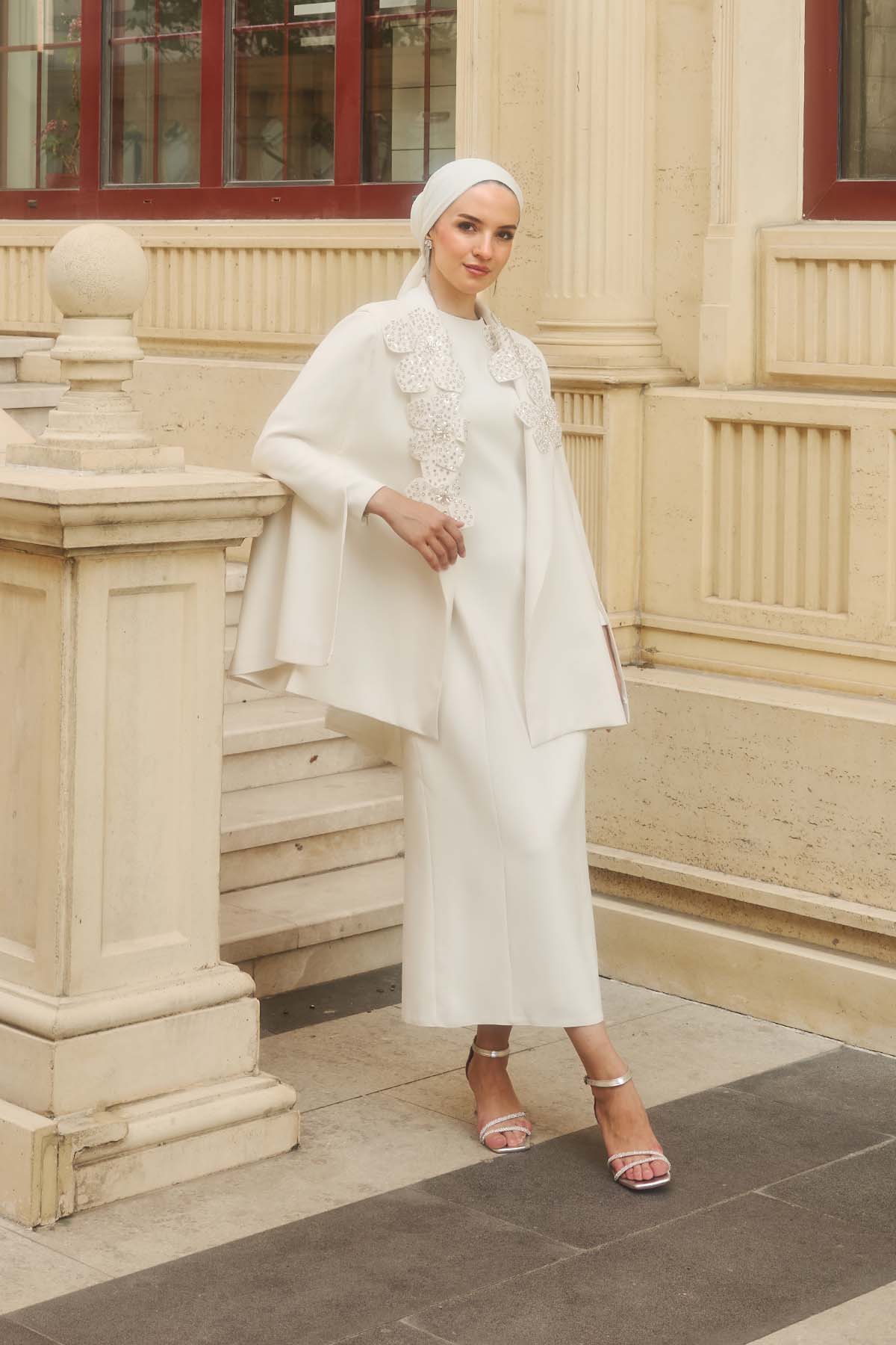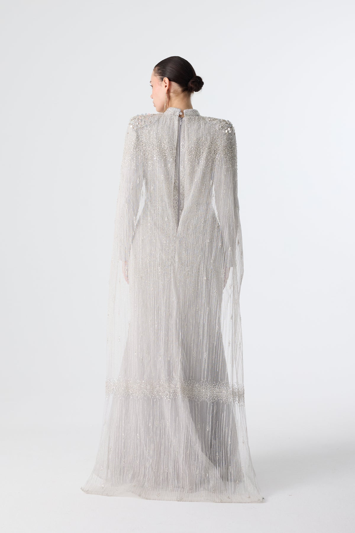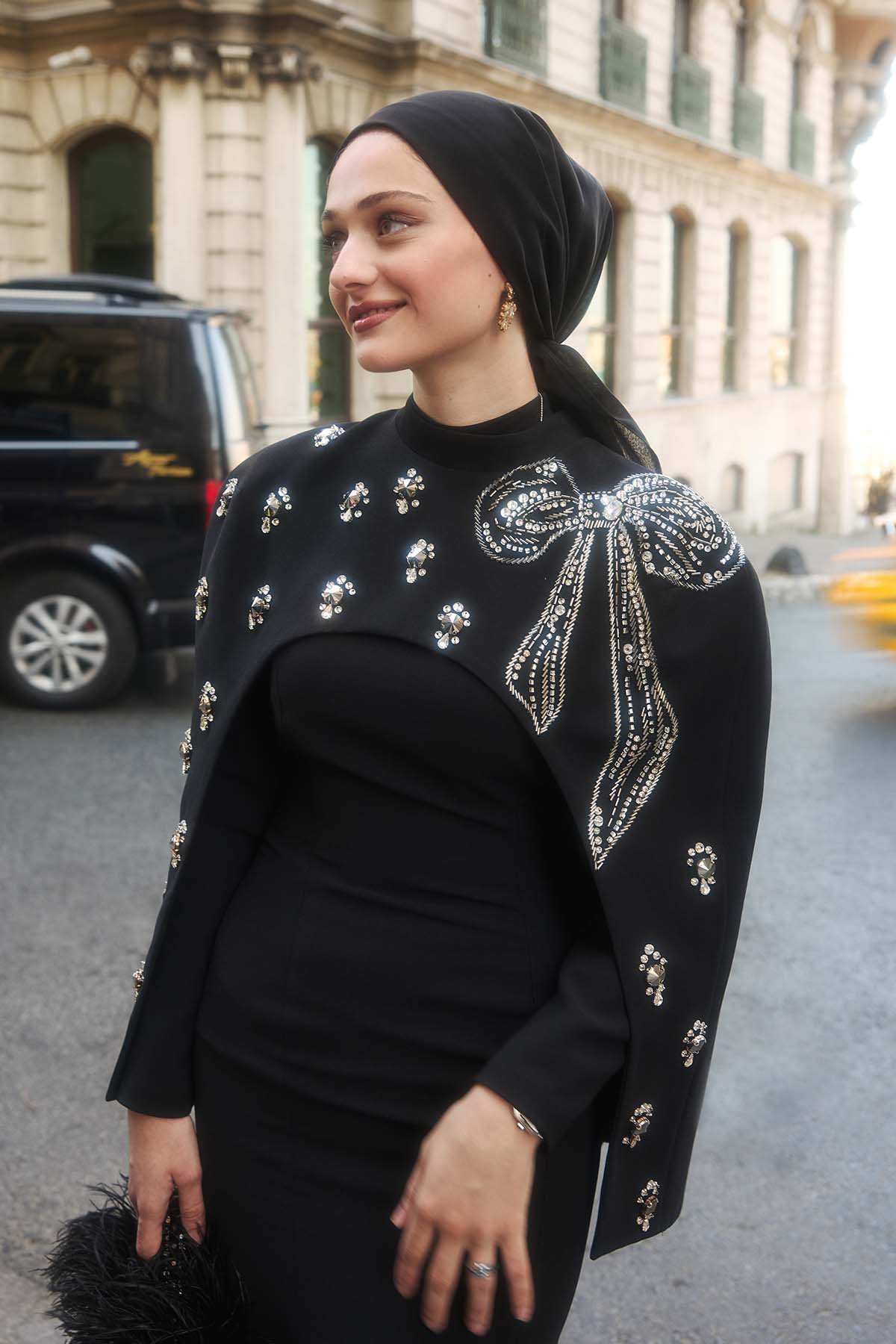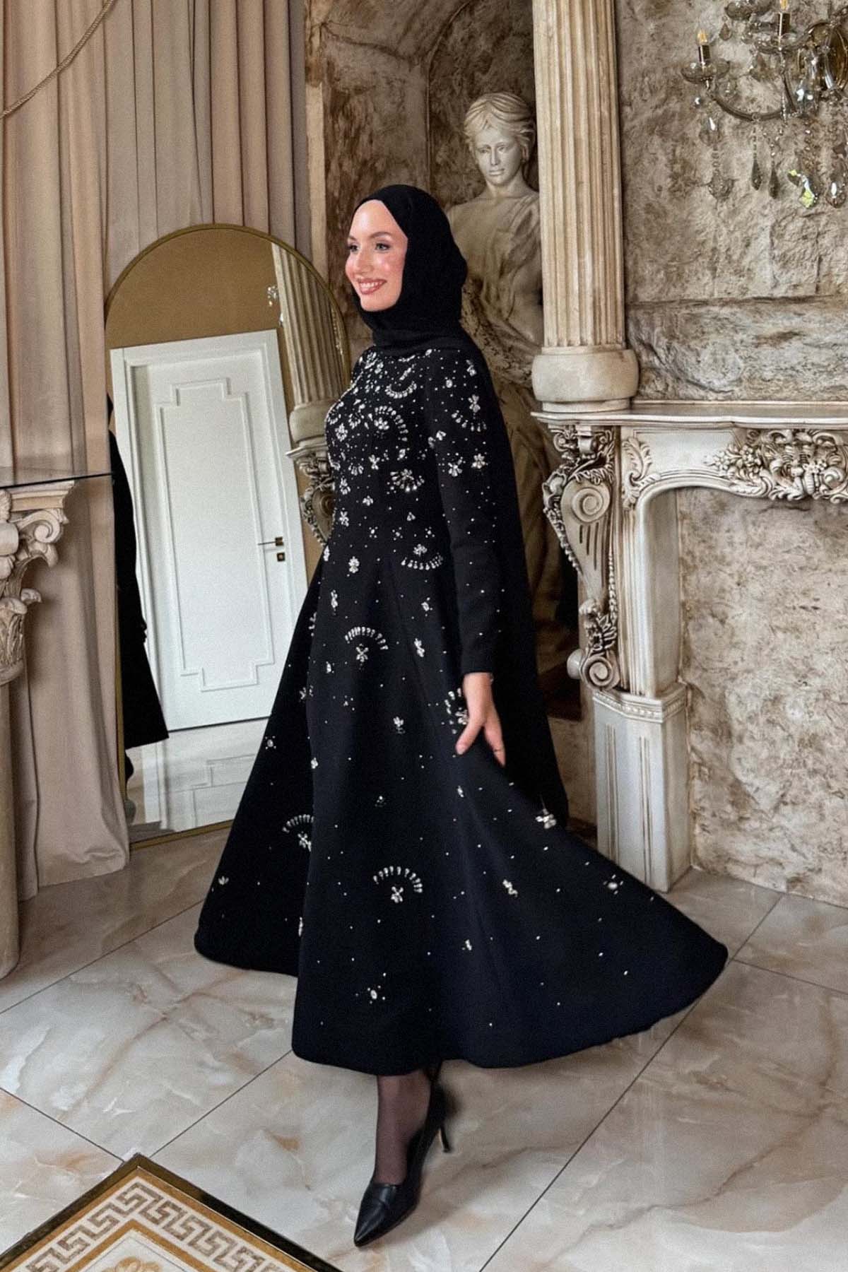 Ürün ortalama 135 cm. Elbisenin arkası fermuarlıdır, astarlıdır. Krep kumaştan hazırlanmıştır. Etek gelişi kalem formundadır. Omuz kısmından eteğe uzanan pelerini mevcuttur. Özel taşlarla özenle el işçiliği ile işlenmiştir.