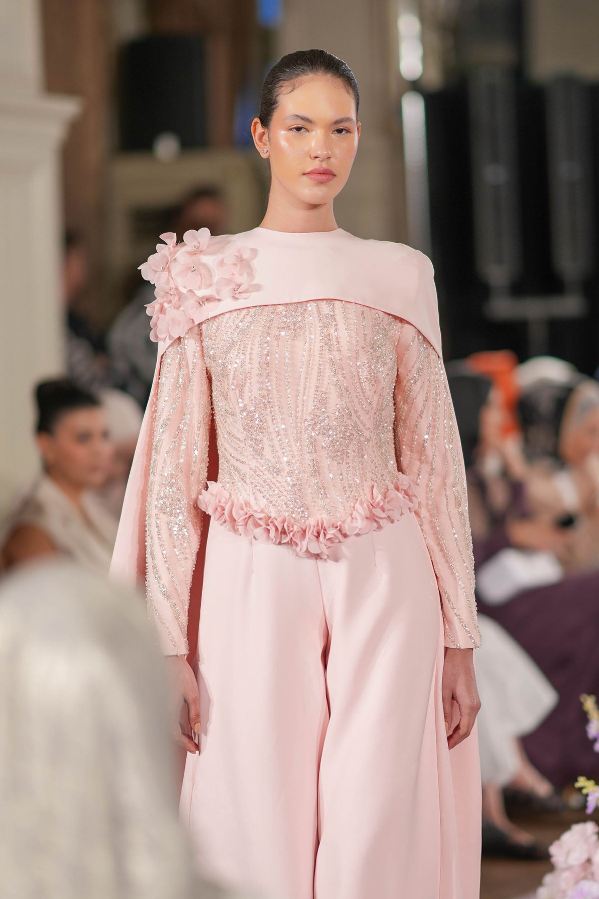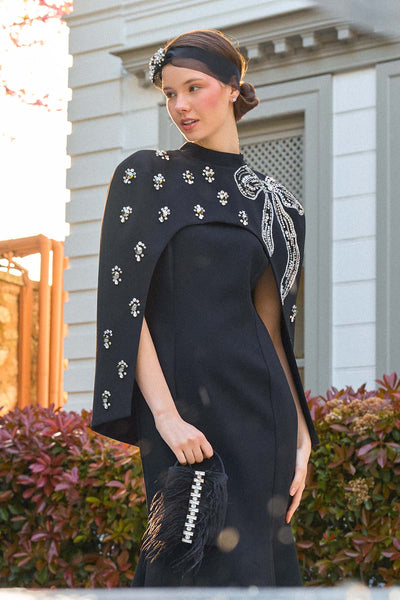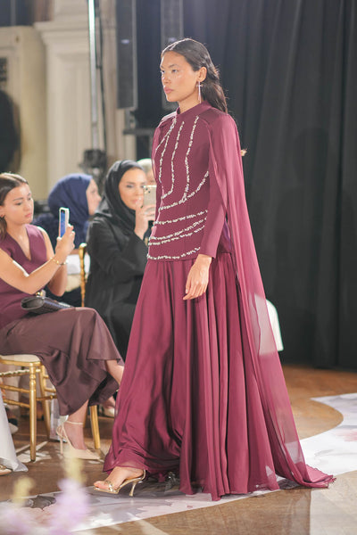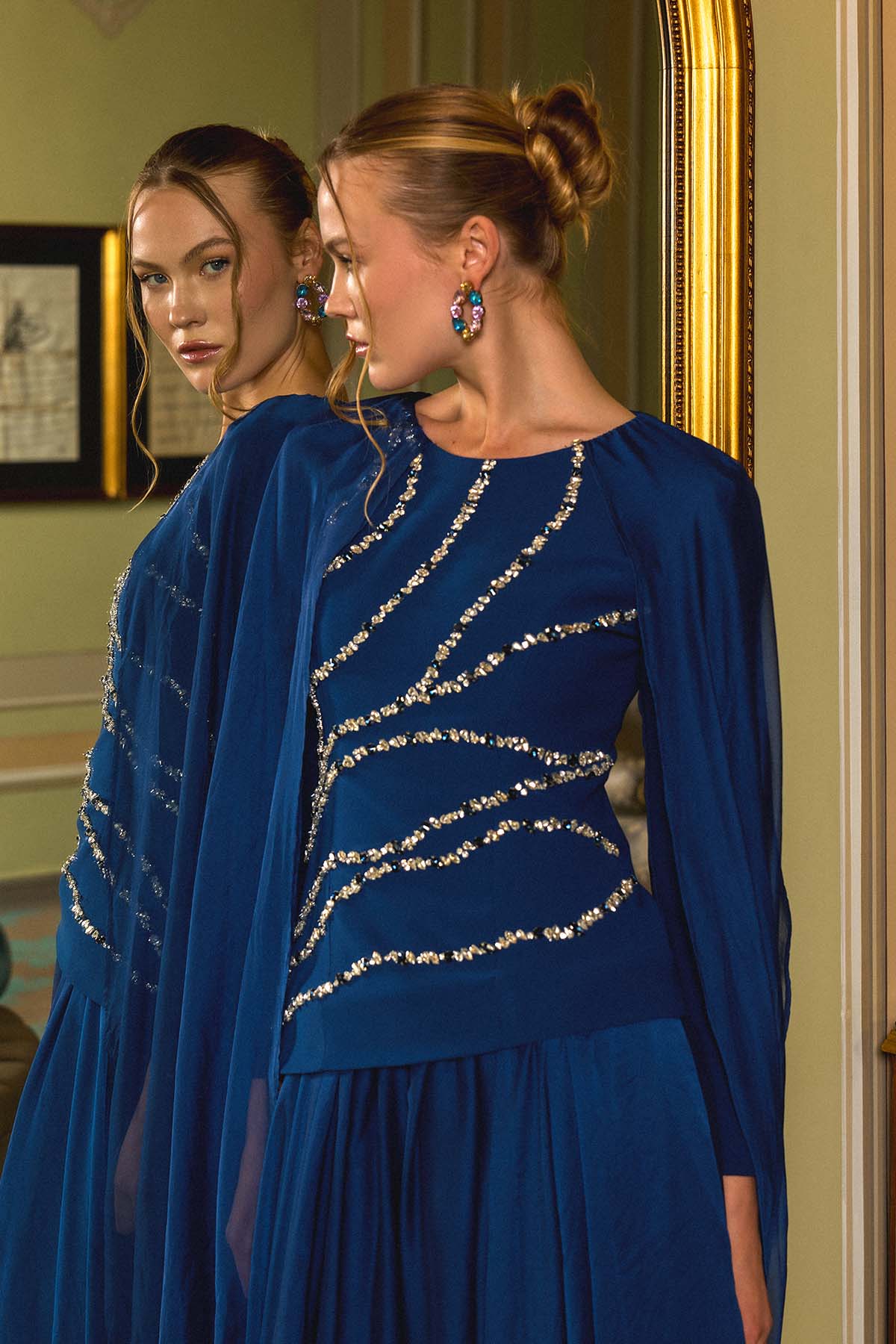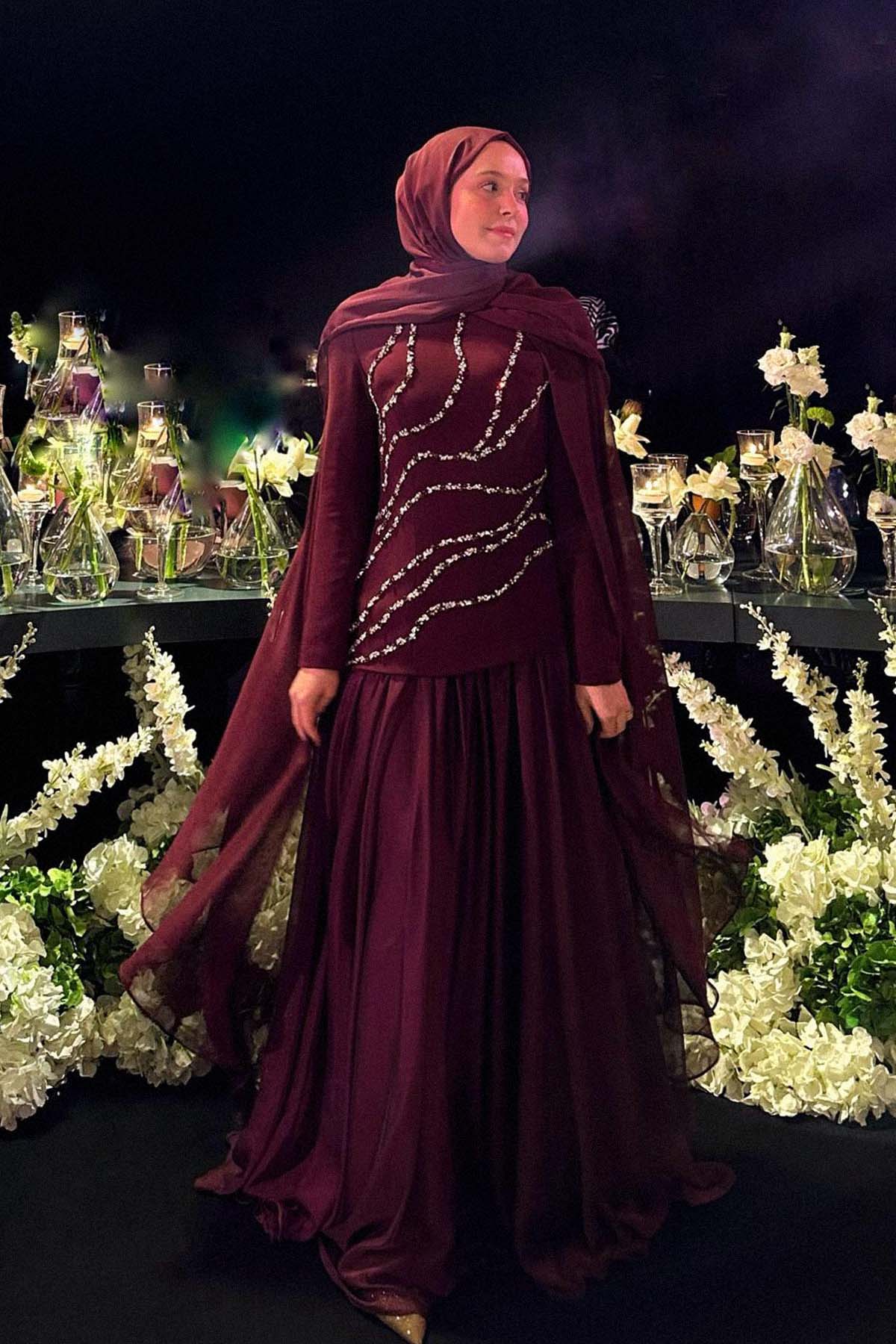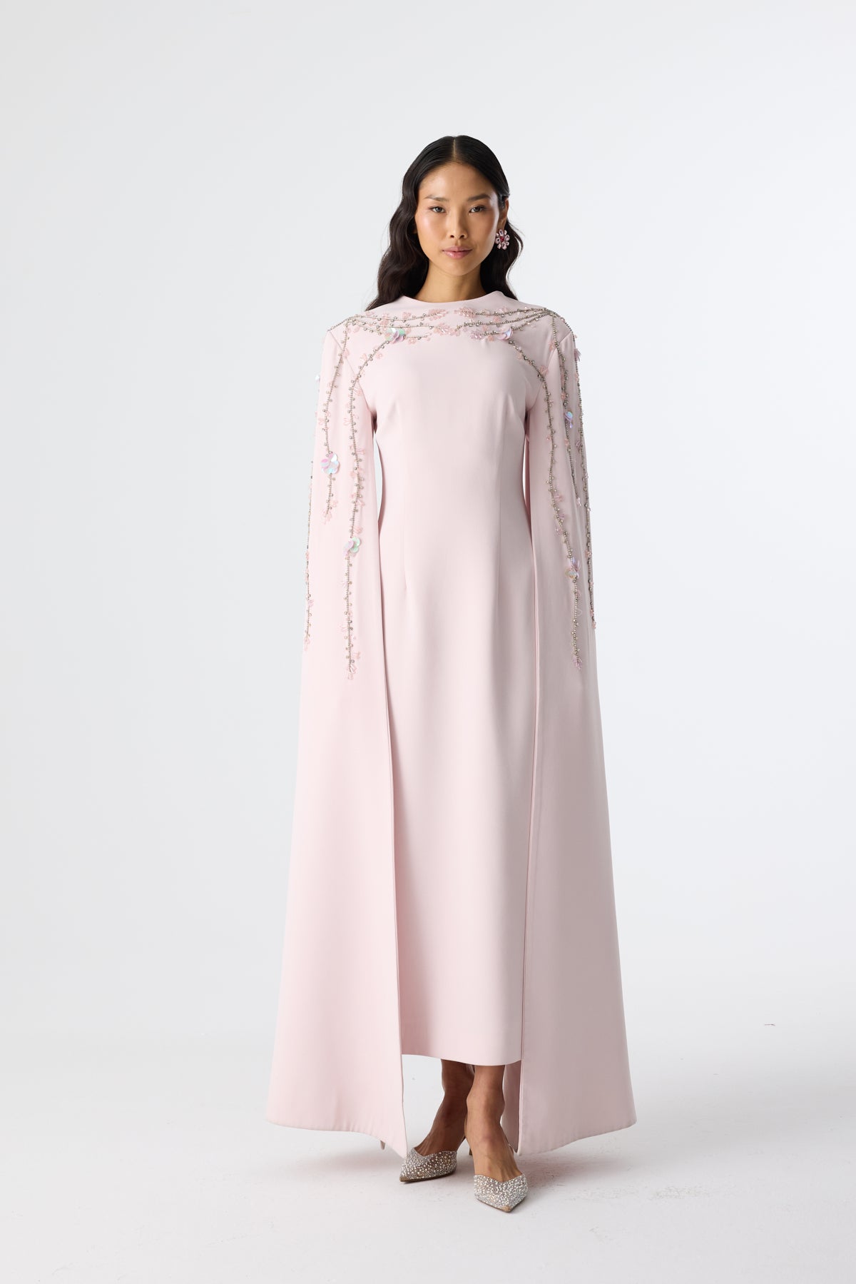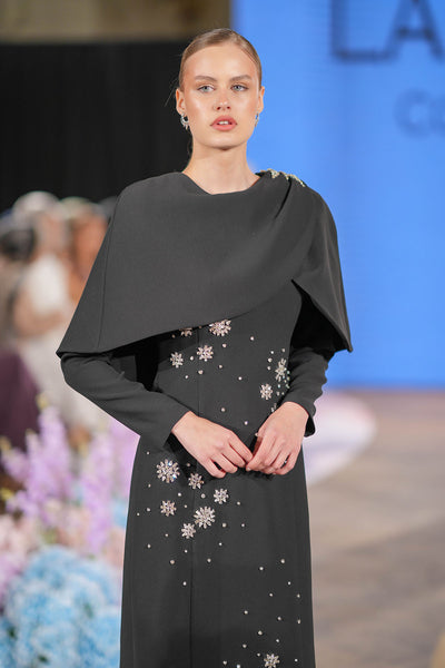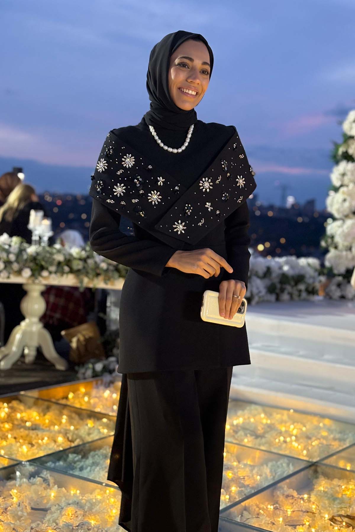 Ürün ortalama 135 cm. Elbisenin arkası fermuarlıdır, astarlıdır. Krep kumaştan hazırlanmıştır. Etek gelişi kalem formundadır. Omuz kısmından eteğe uzanan pelerini mevcuttur. Özel taşlarla özenle el işçiliği ile işlenmiştir.