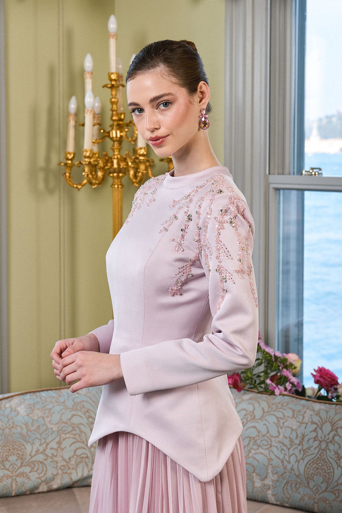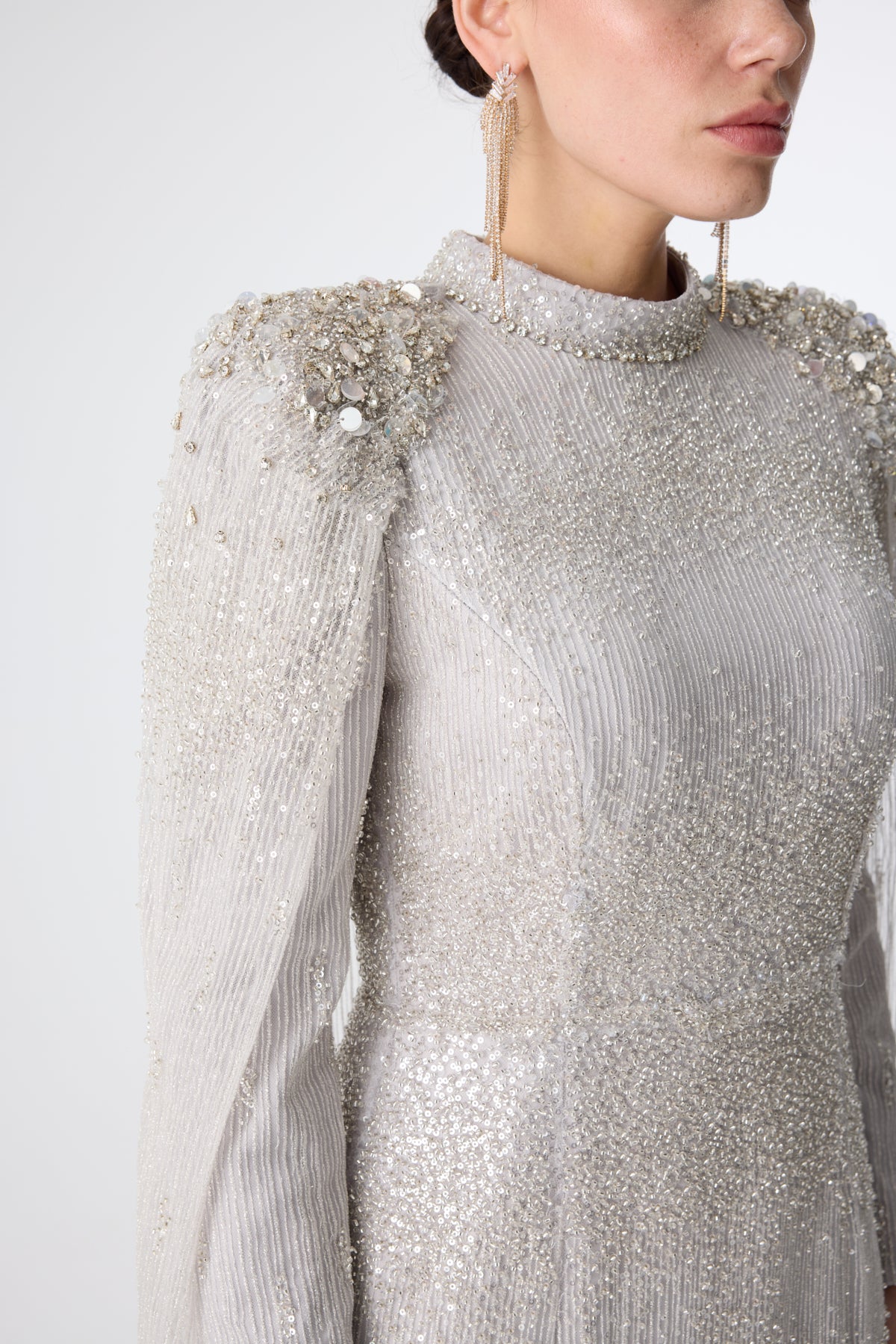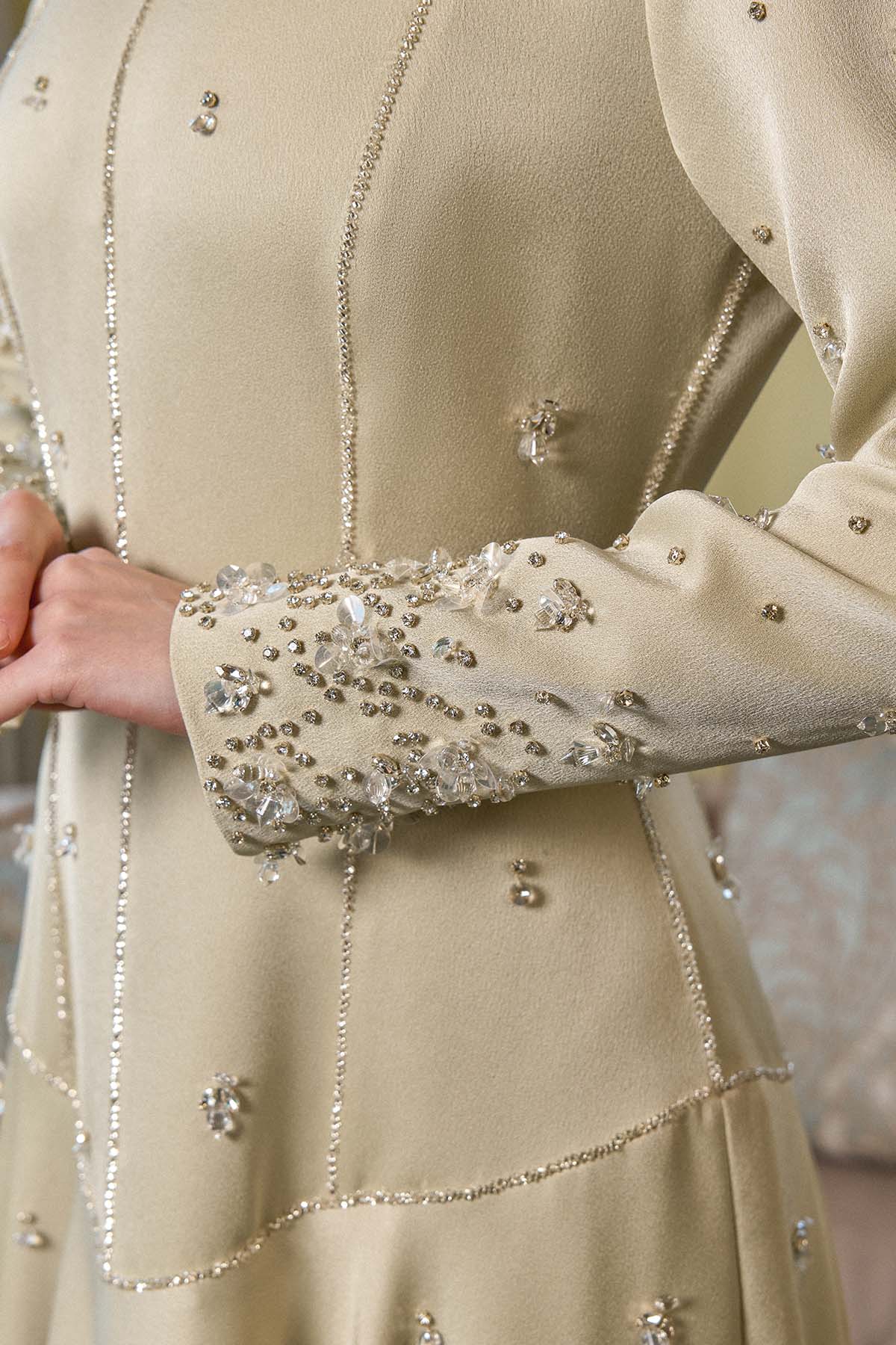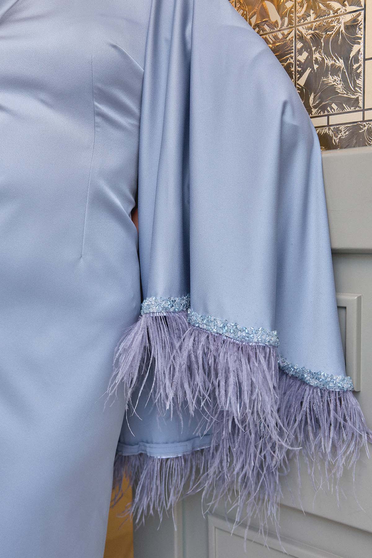 Ürün ortalama 145 cm. Ürünün arkası fermuarlıdır, astarlıdır. Saten krep kumaştan hazırlanmıştır. Kollarında otriş ve kristal işleme detayları bulunmaktadır.