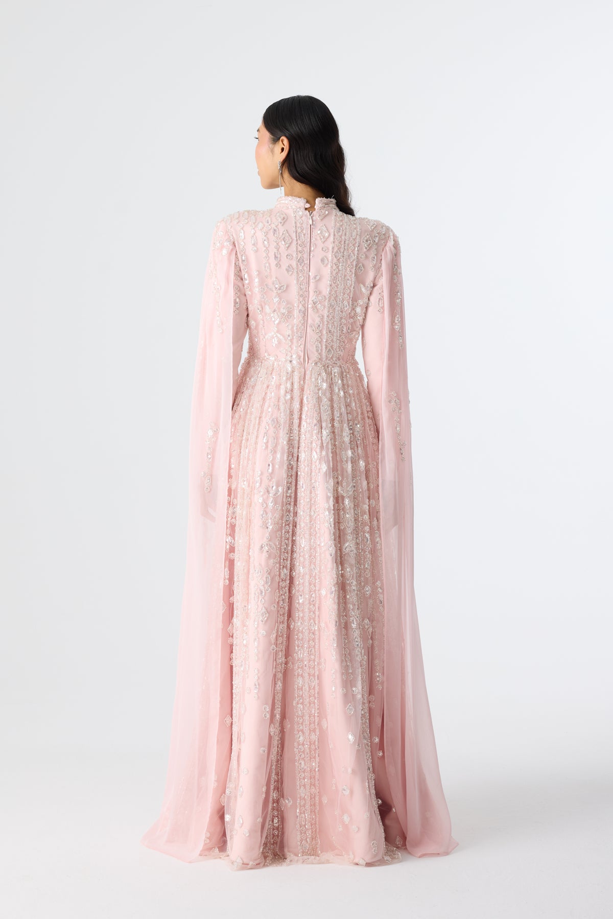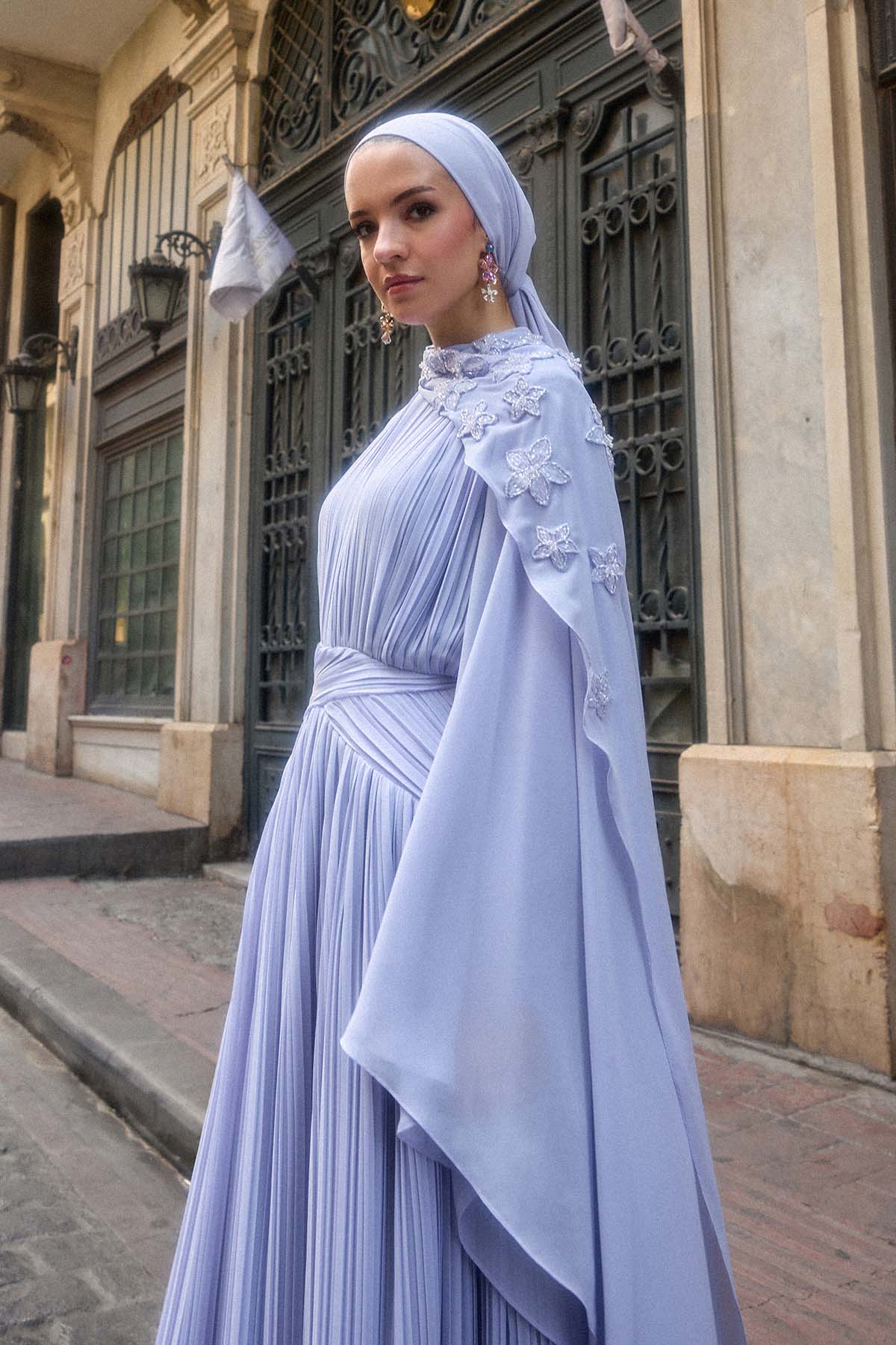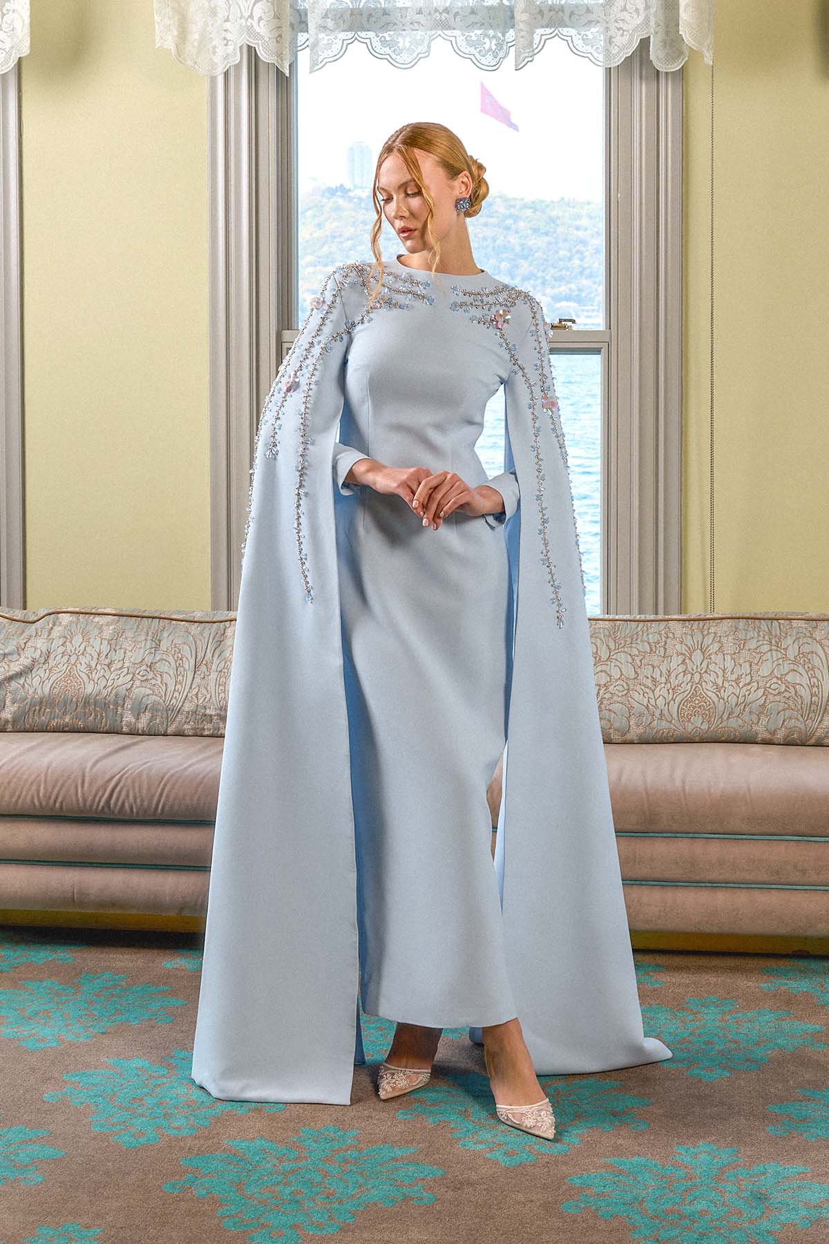Ürün ortalama 165cm. Elbisenin arkası fermuarlıdır, astarlıdır. İşlemeli özel kumaştan hazırlanmıştır. Etek gelişi kloş formdadır. Kollardan etek ucuna uzanan iki ayrı pelerini mevcuttur. Özel taşlarla özenle el işçiliği ile işlenmiştir.