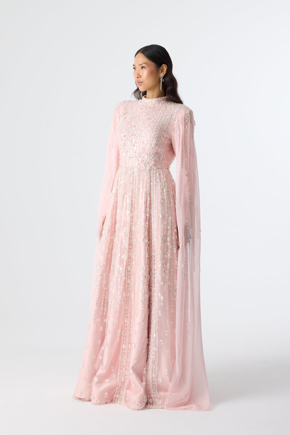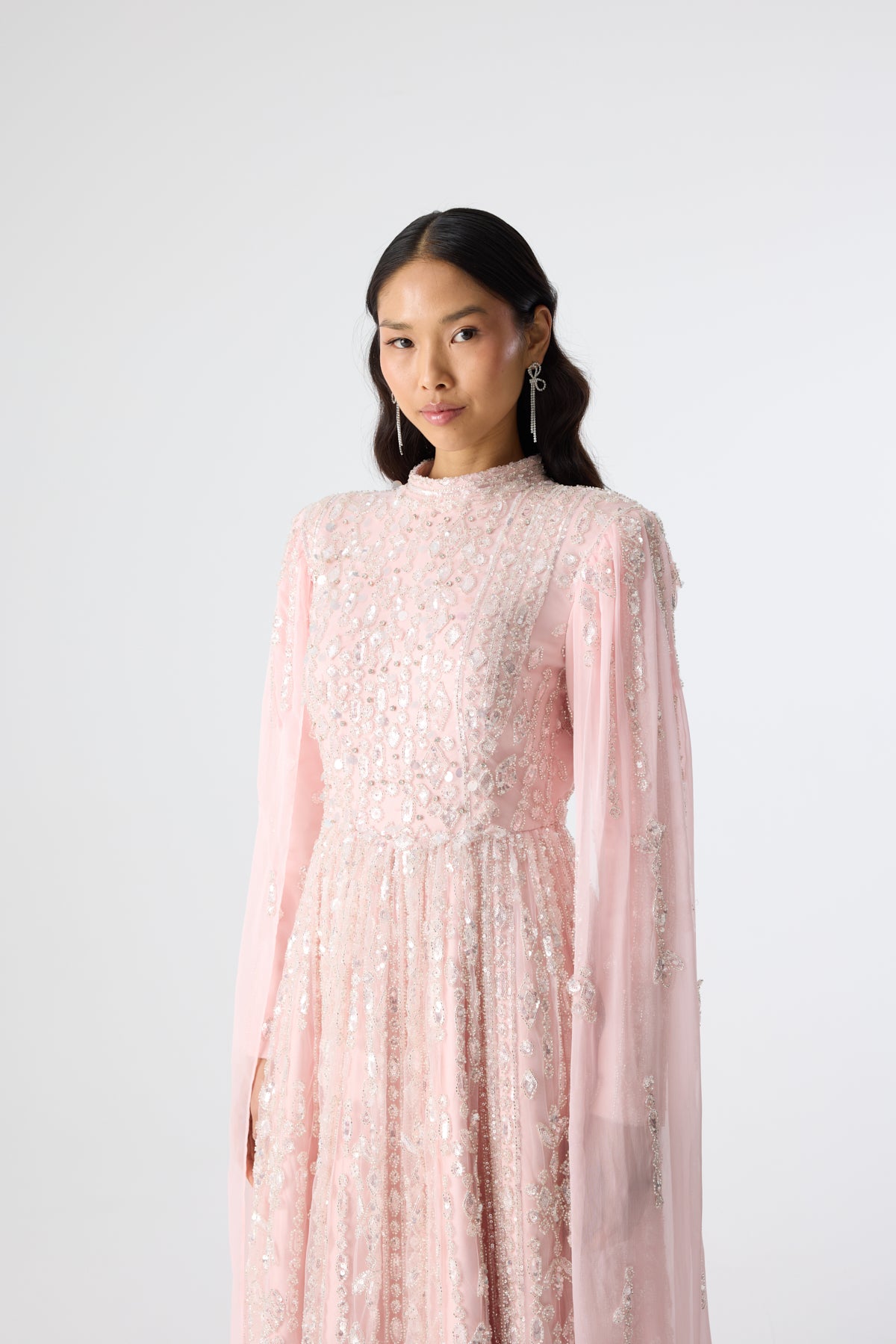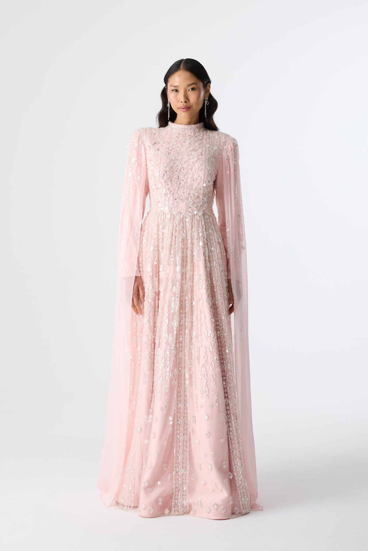 Ürün ortalama 165cm. Elbisenin arkası fermuarlıdır, astarlıdır. İşlemeli özel kumaştan hazırlanmıştır. Etek gelişi kloş formdadır. Kollardan etek ucuna uzanan iki ayrı pelerini mevcuttur. Özel taşlarla özenle el işçiliği ile işlenmiştir.