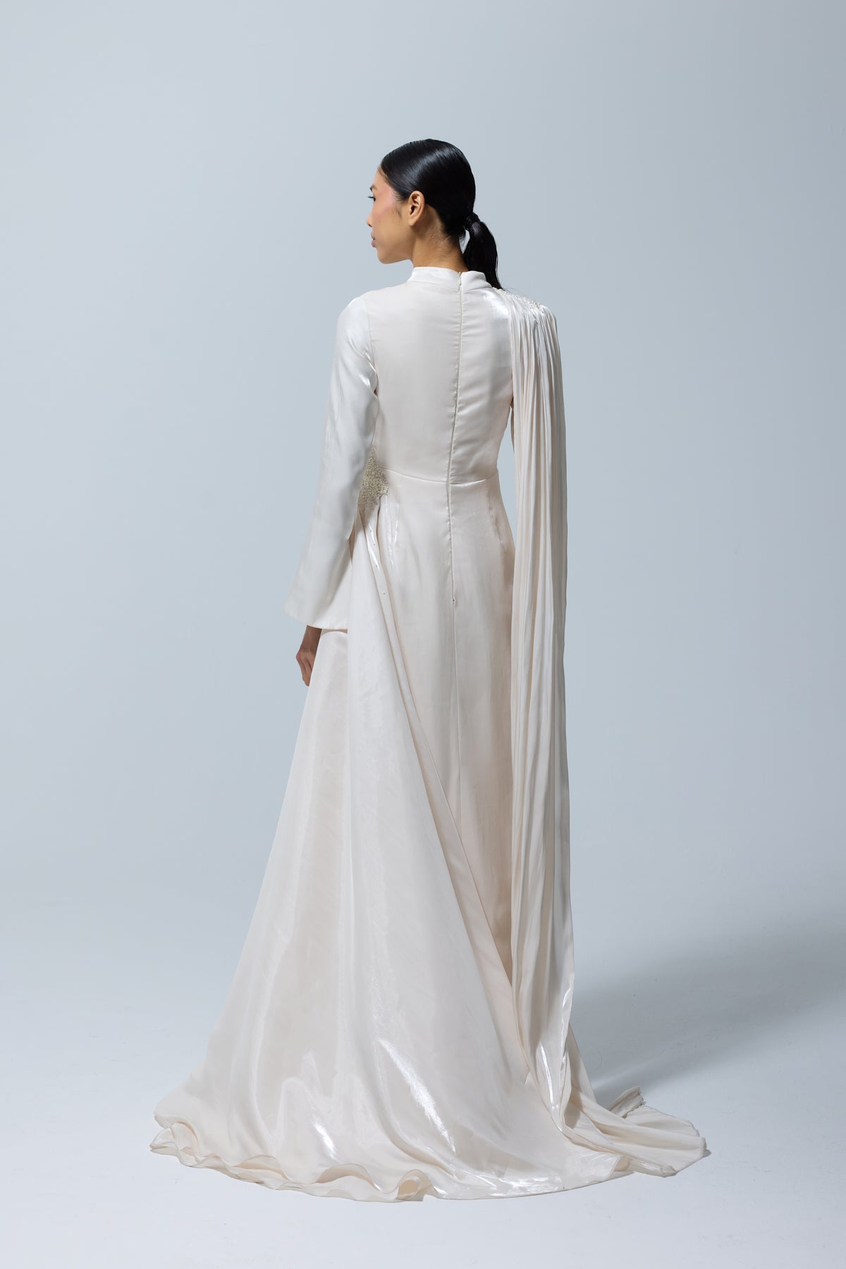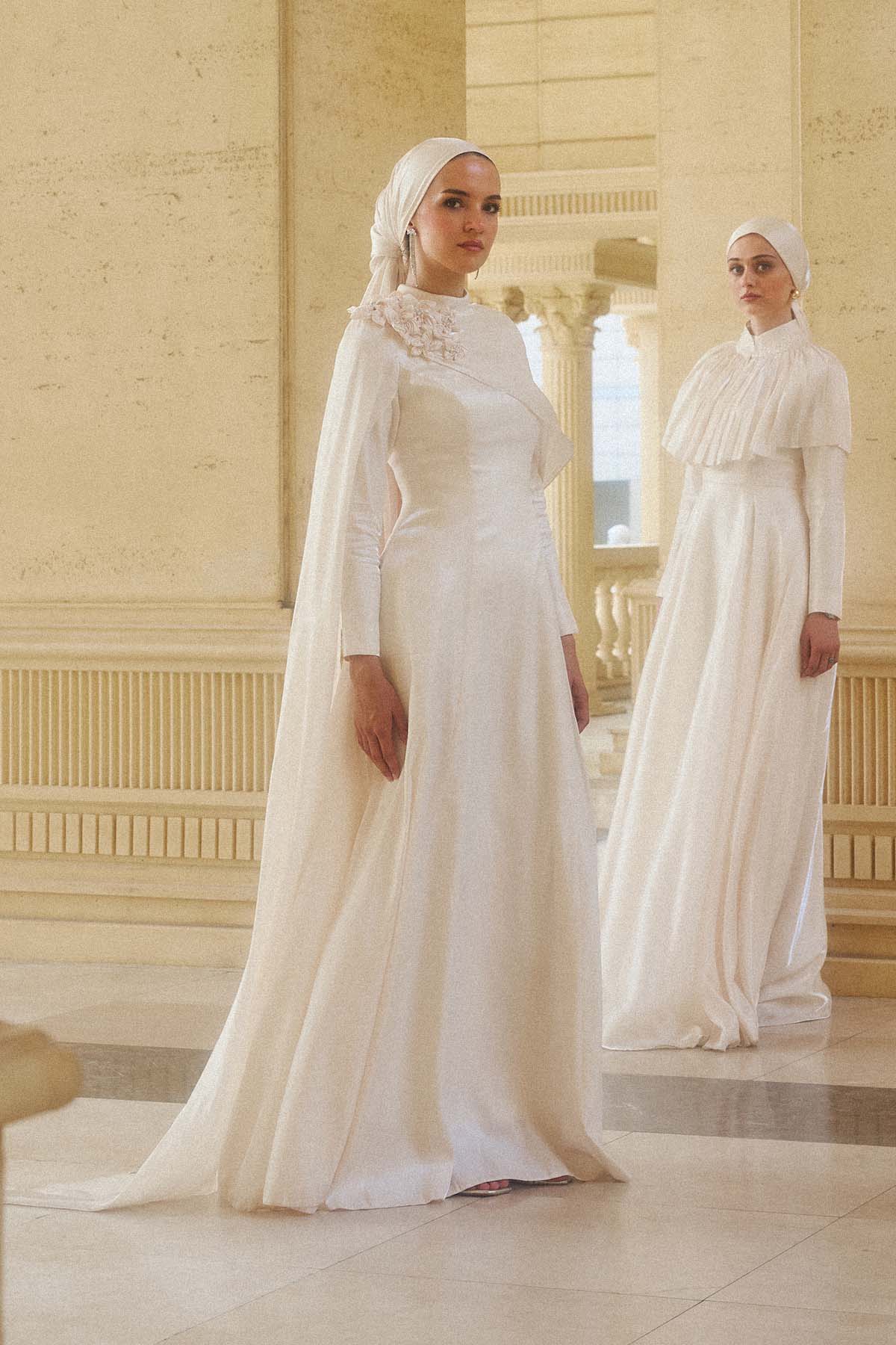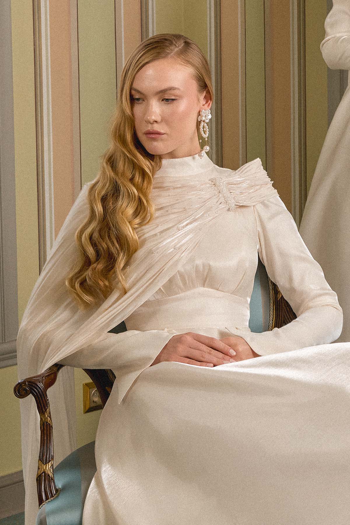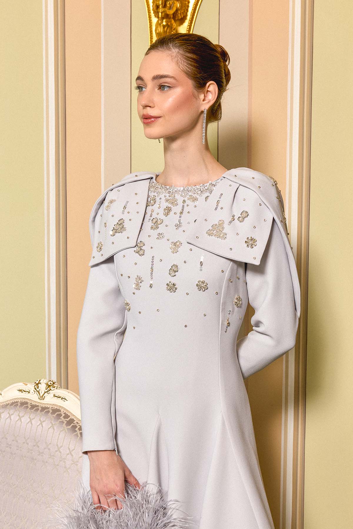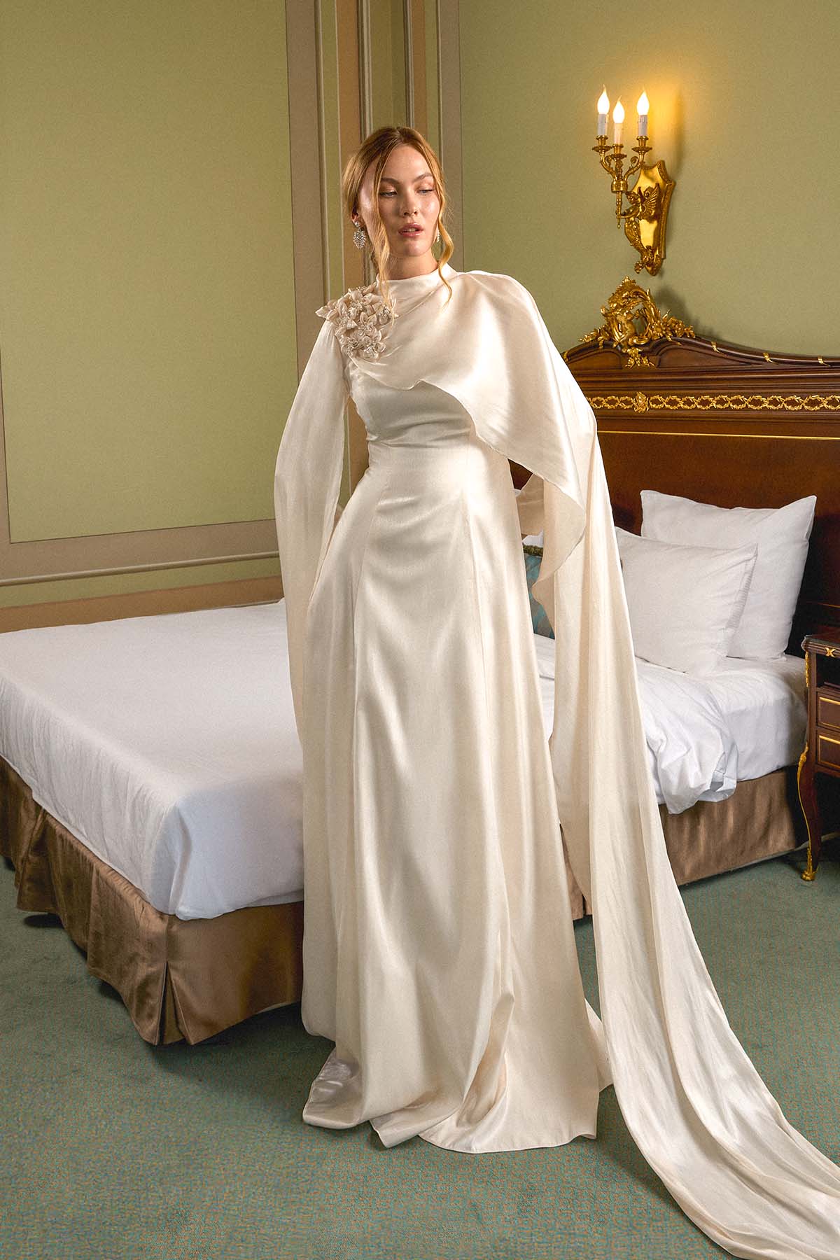 Ürün ortalama 150 cm. Ürünün arkası fermuarlıdır, astarlıdır. Özel üretilmiş ipek kumaş hazırlanmıştır. Sol omuzdan sağ omuza doğru etek ucuna inen pelerin detayı mevcuttur. Kloş etek formuna sahiptir, kuyrukludur. Kristal işlemeler el işçiliği ile tamamlanmıştır.