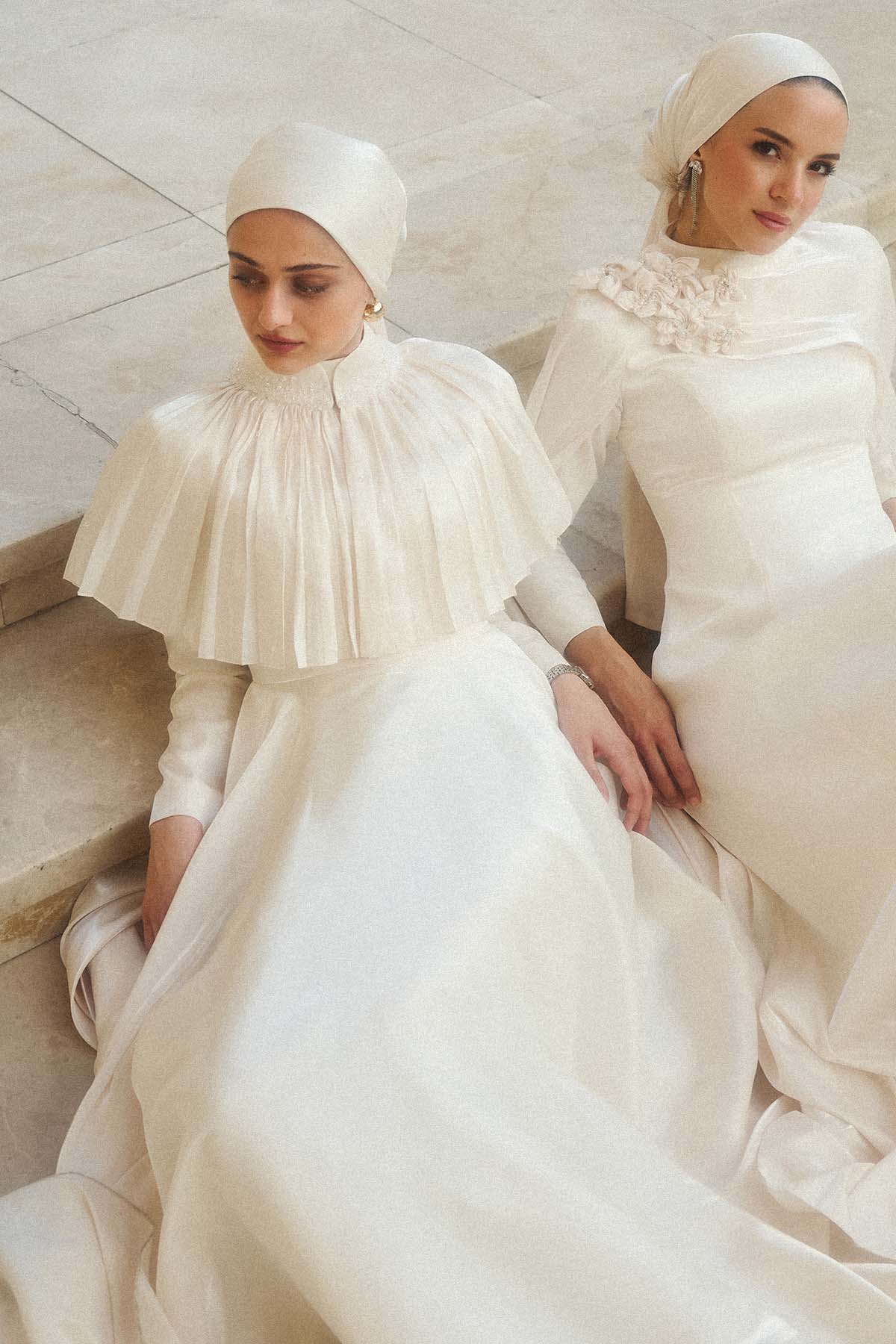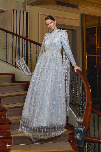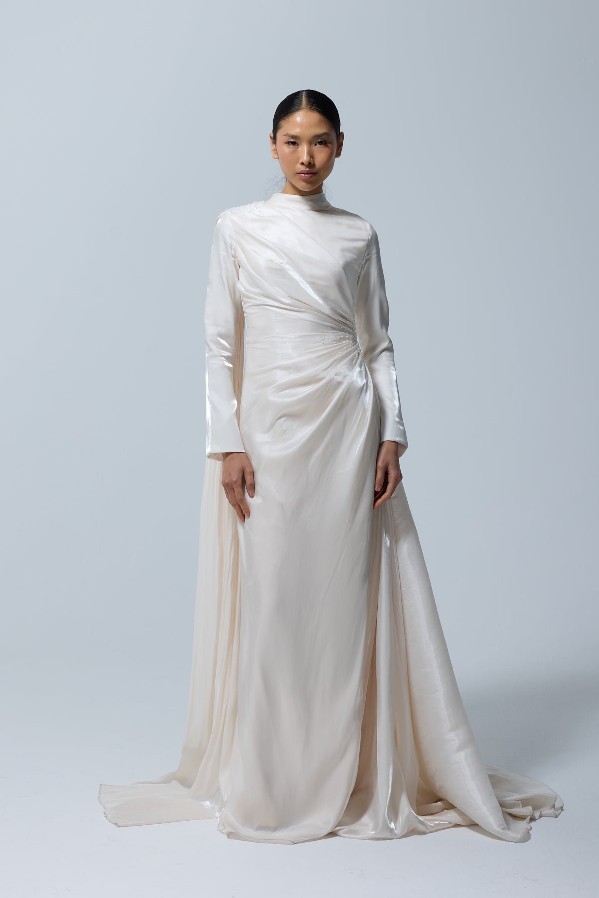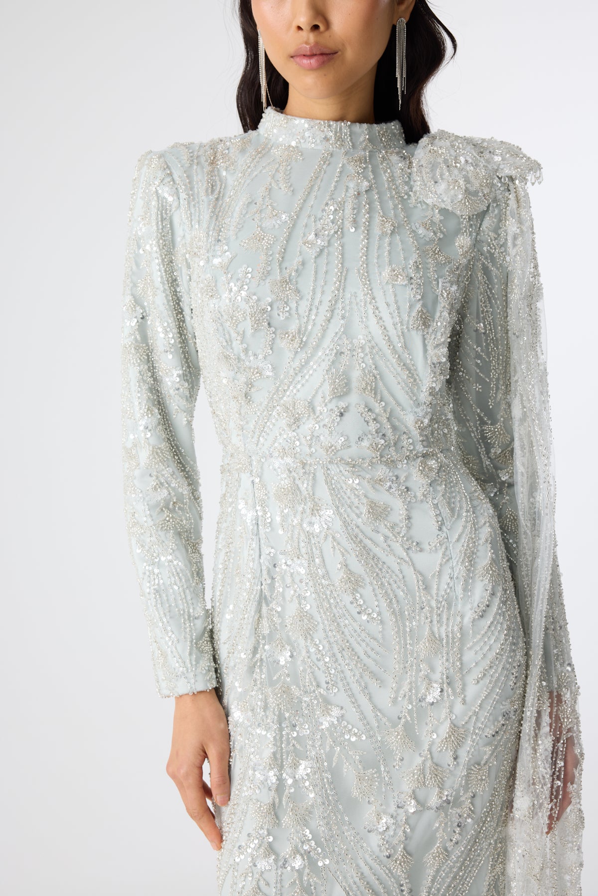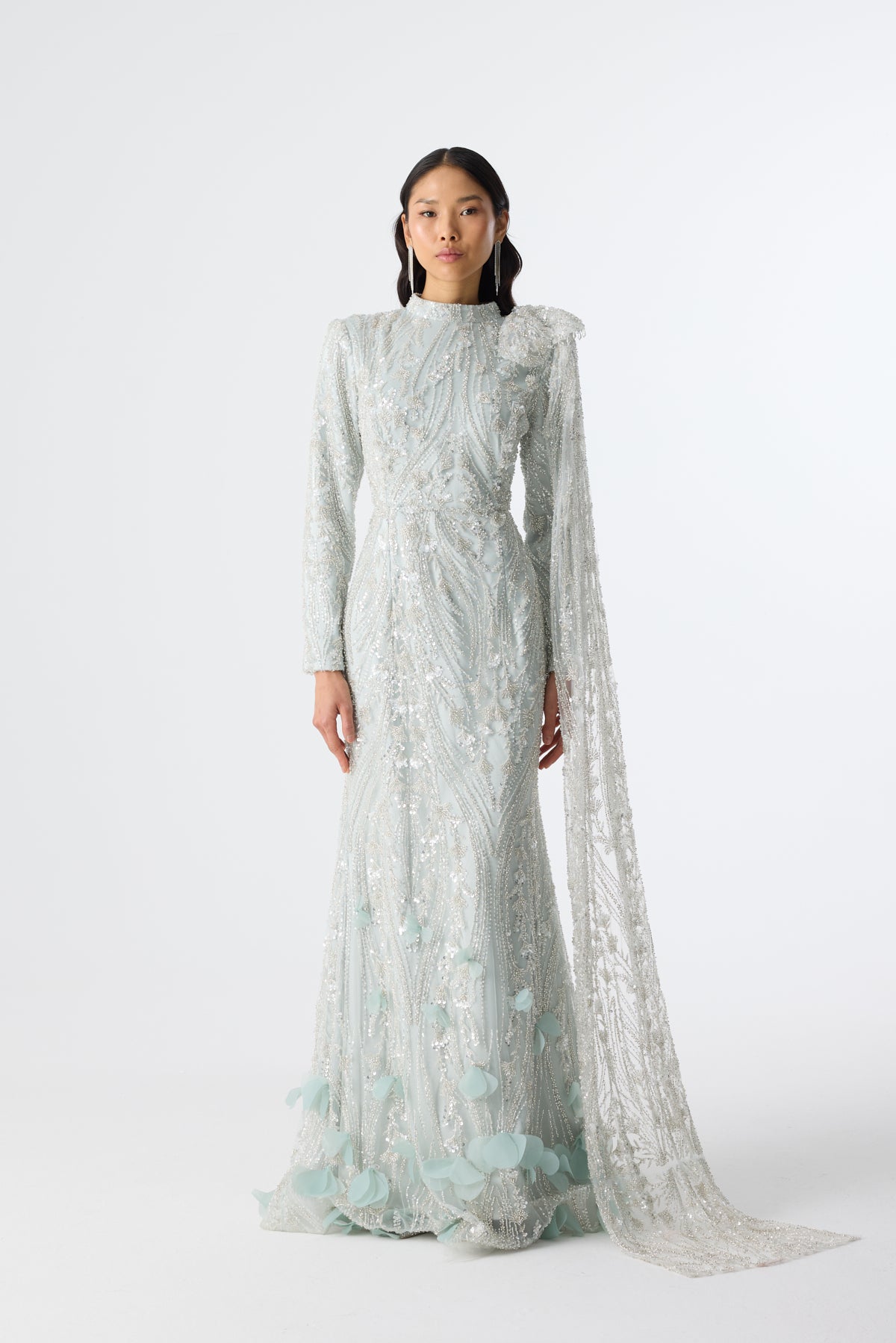 Ürün ortalama 150 cm. Ürünün arkası fermuarlıdır, astarlıdır. Özel üretilmiş ipek kumaş hazırlanmıştır. Sol omuzdan sağ omuza doğru etek ucuna inen pelerin detayı mevcuttur. Kloş etek formuna sahiptir, kuyrukludur. Kristal işlemeler el işçiliği ile tamamlanmıştır.