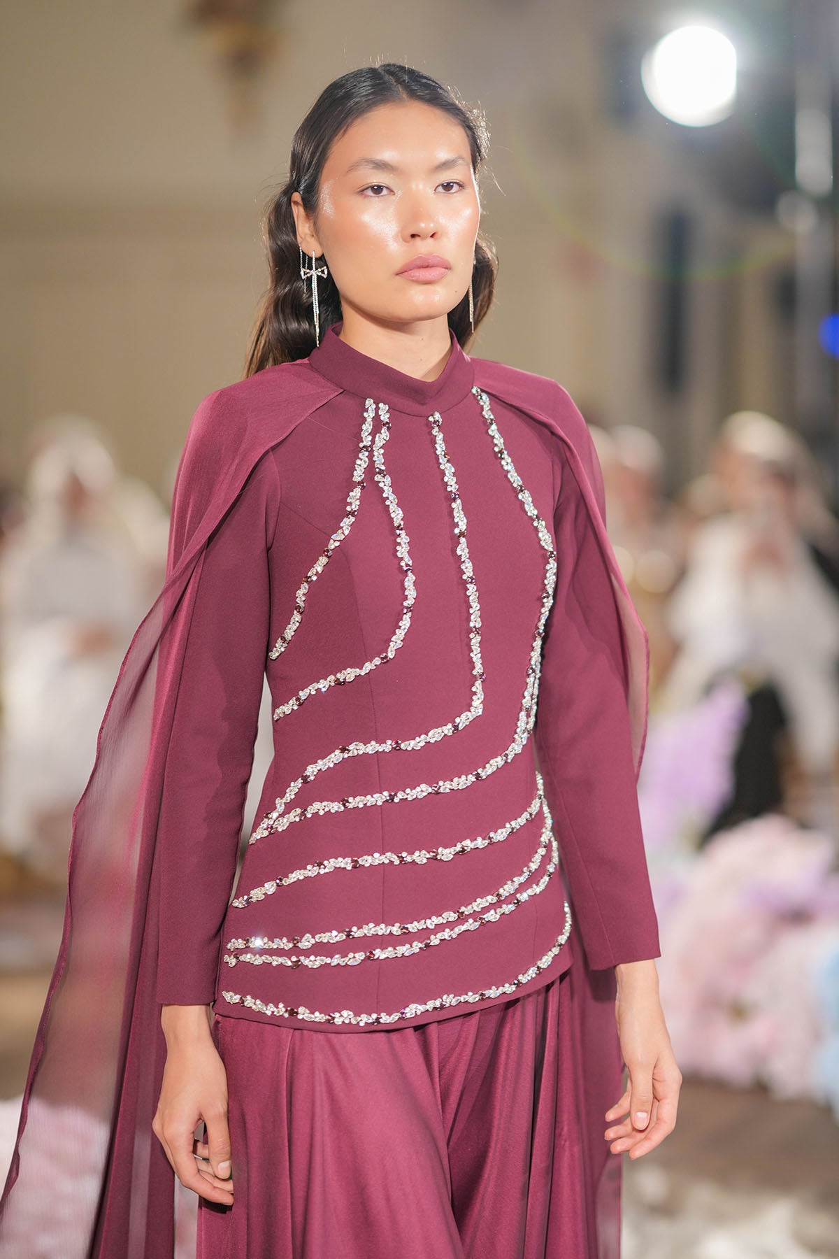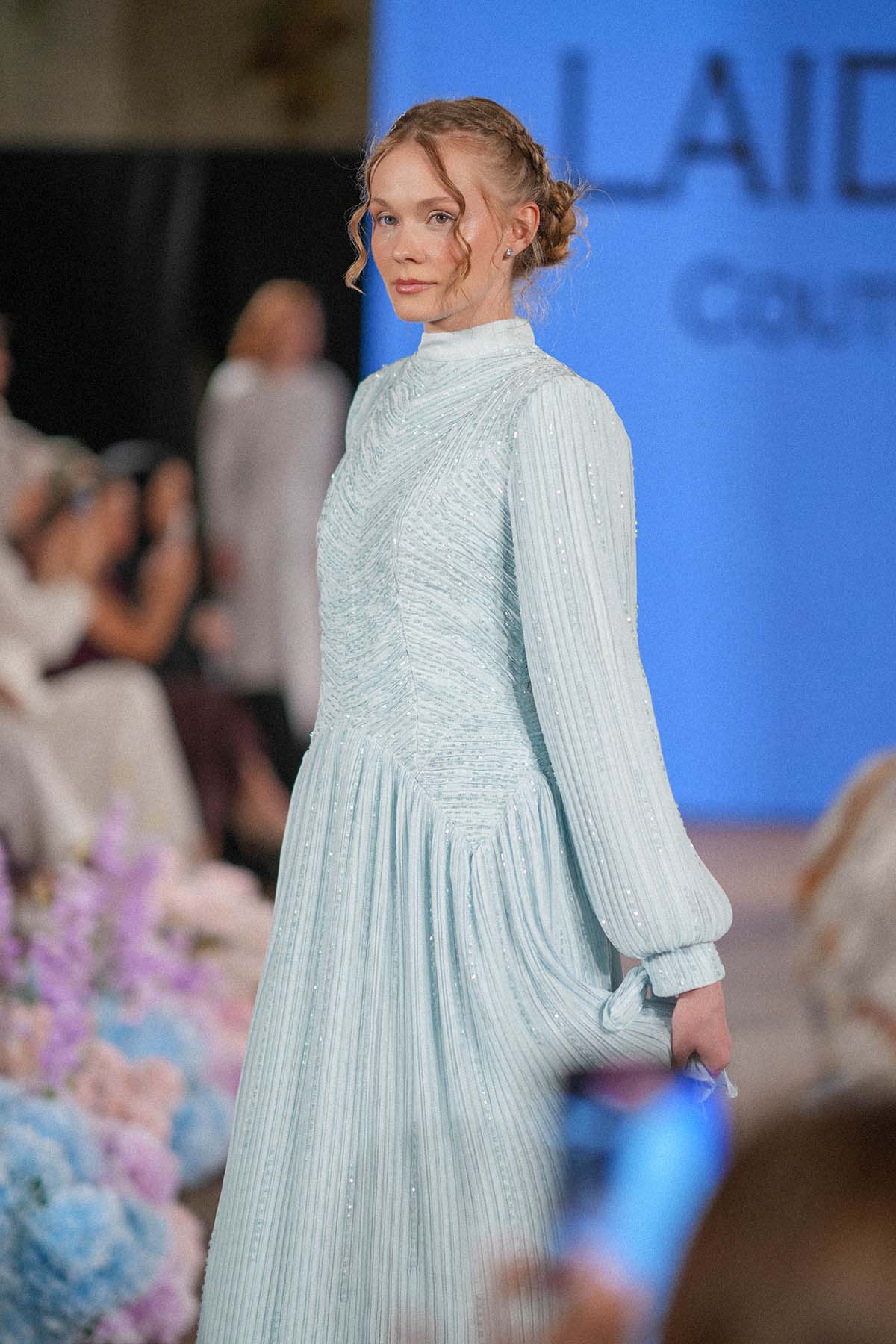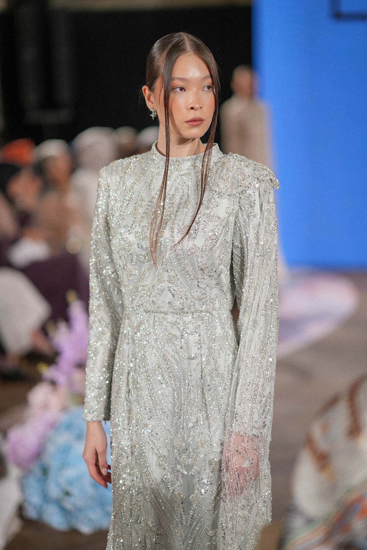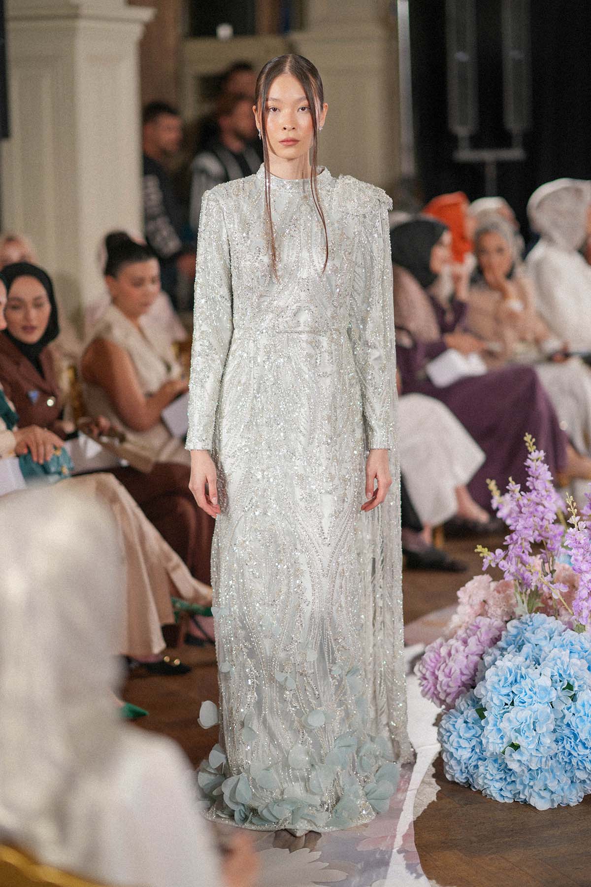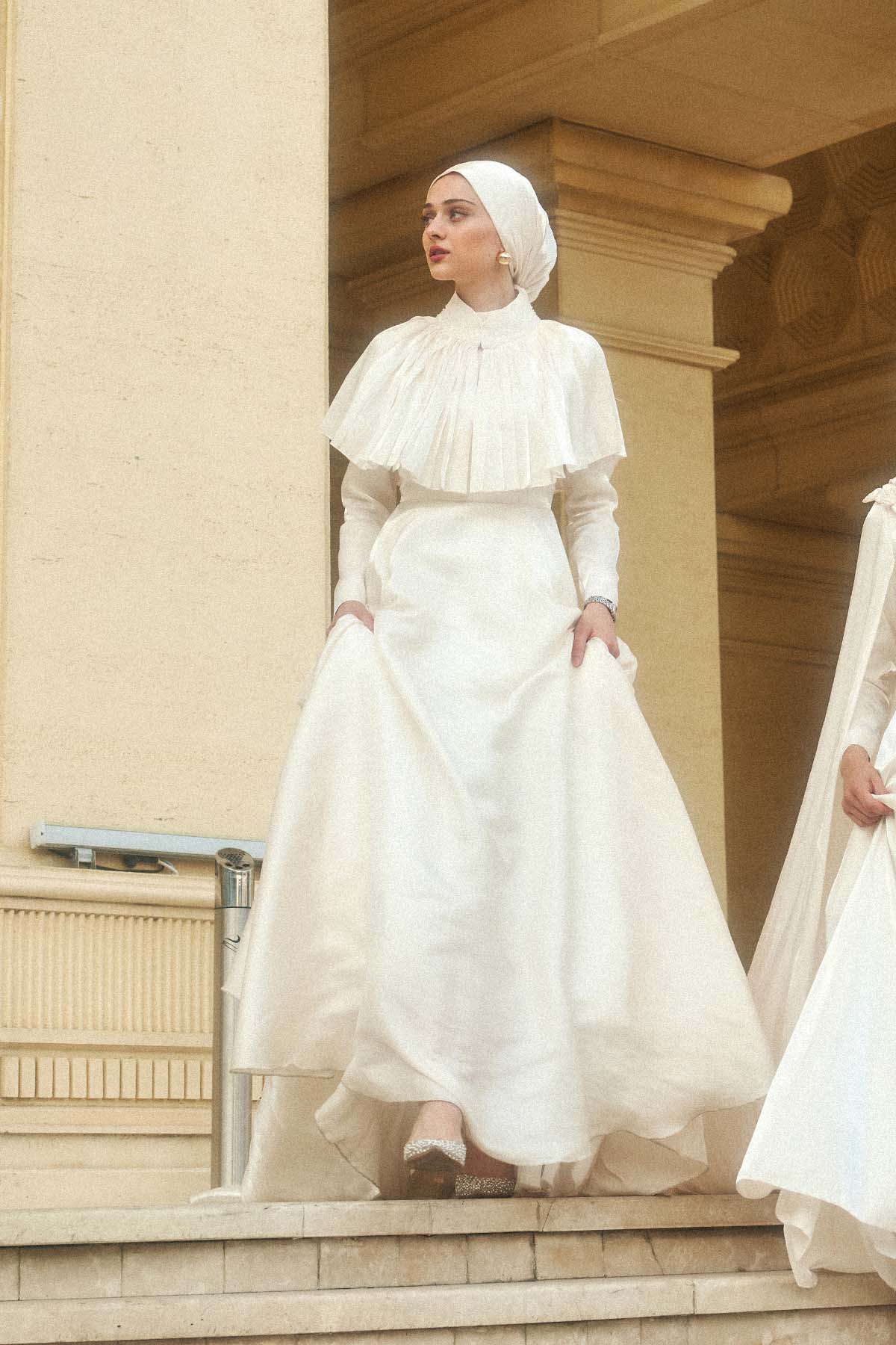 Ürün ortalama 150 cm. Ürünün arkası fermuarlıdır, astarlıdır. Özel üretilmiş ipek kumaş hazırlanmıştır. Sol omuzdan sağ omuza doğru etek ucuna inen pelerin detayı mevcuttur. Kloş etek formuna sahiptir, kuyrukludur. Kristal işlemeler el işçiliği ile tamamlanmıştır.