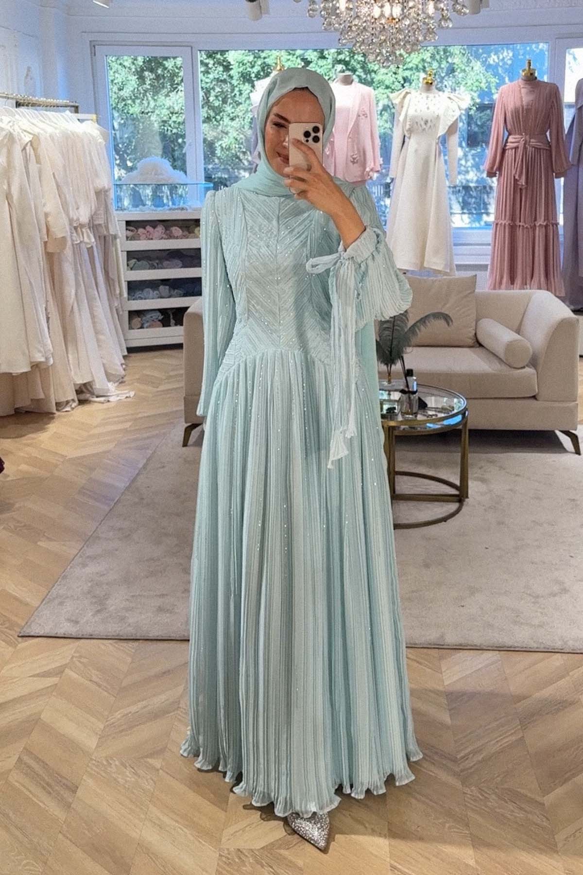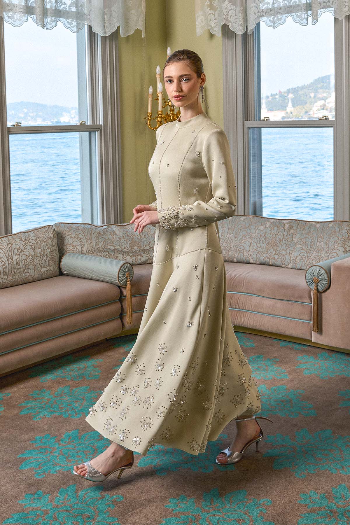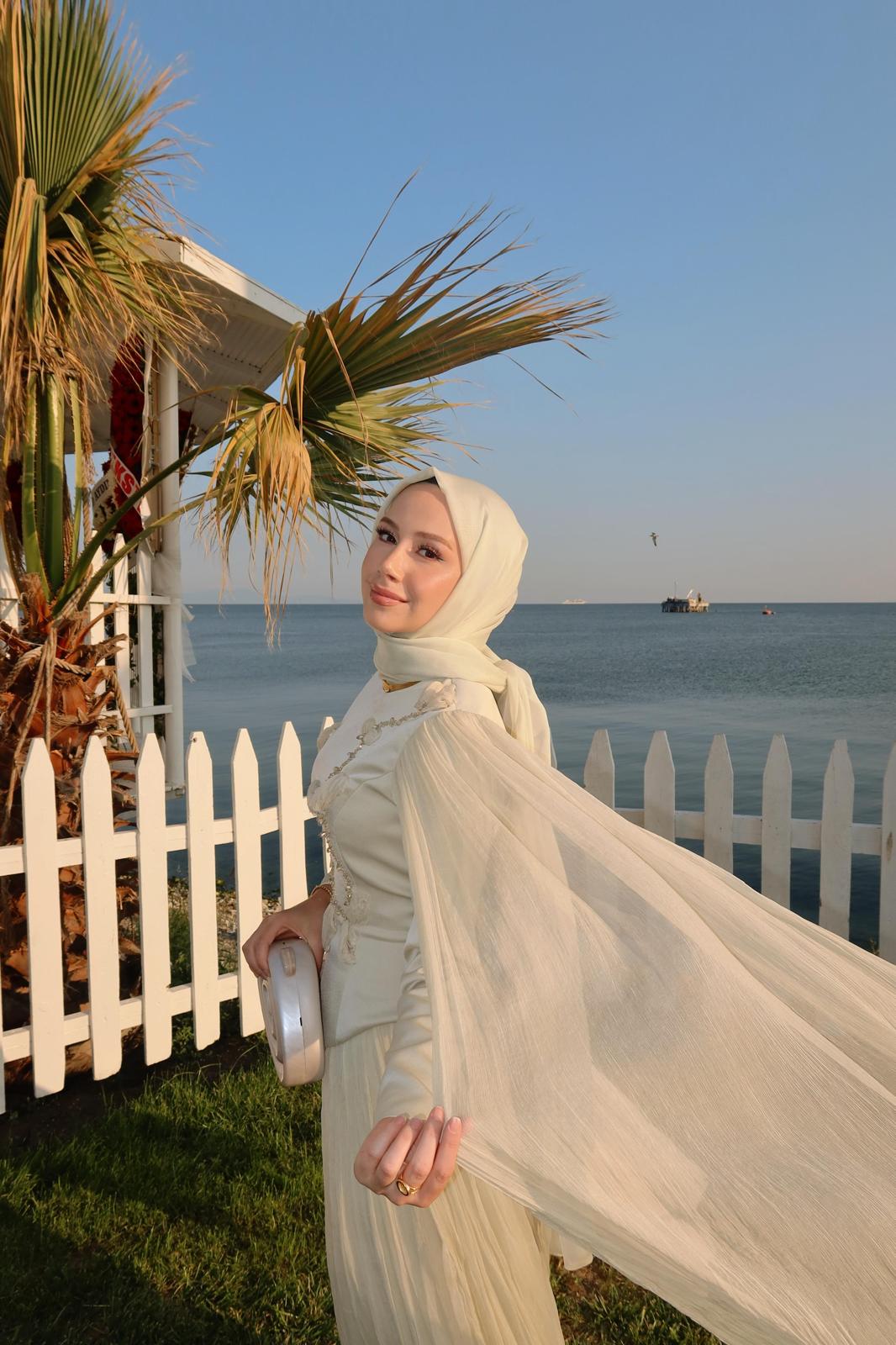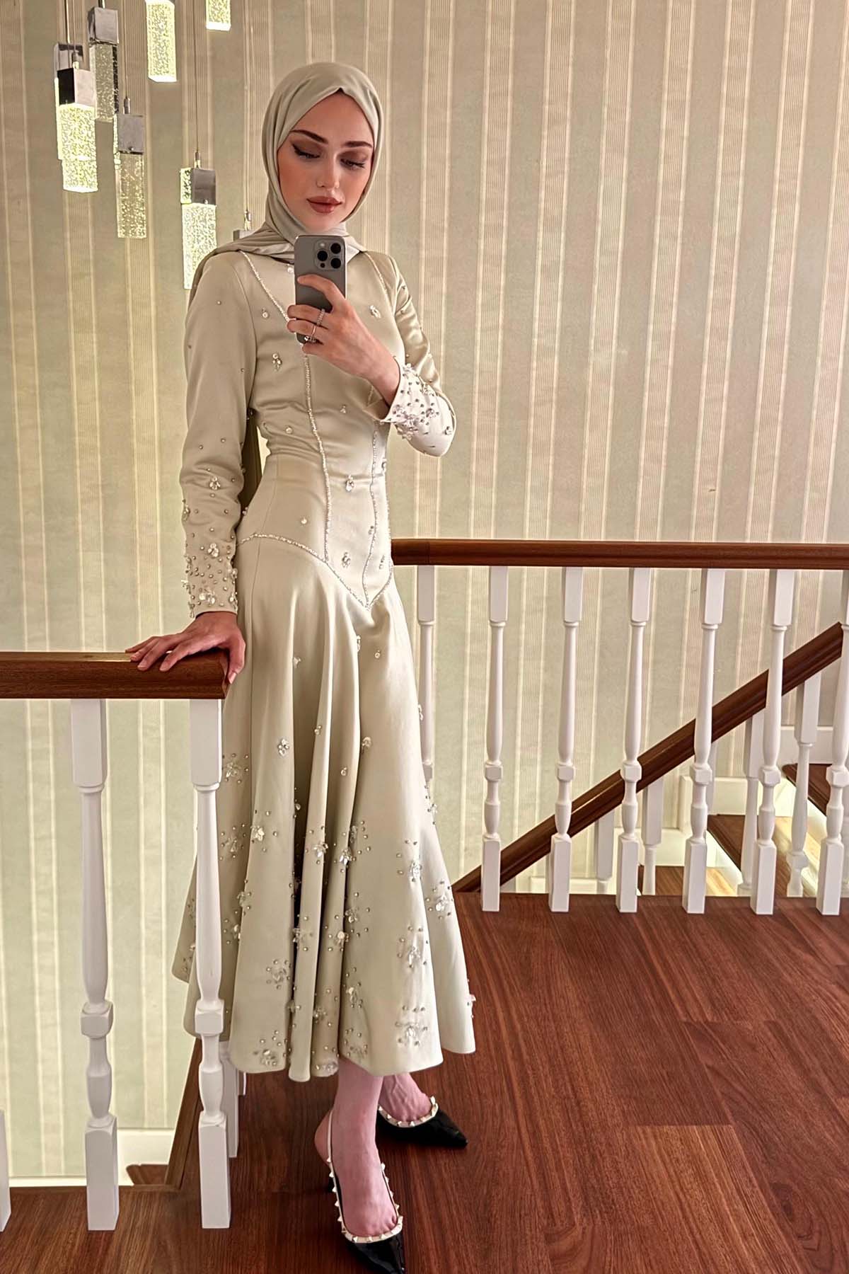 Ürün ortalama 150 cm. Ürünün arkası fermuarlıdır, astarlıdır. Özel üretilmiş ipek kumaş hazırlanmıştır. Kollar yırtmaç detaylıdır Ürün tam kalıptır. Bel detayındaki inciler el işçiliği ile hazırlanmıştır.