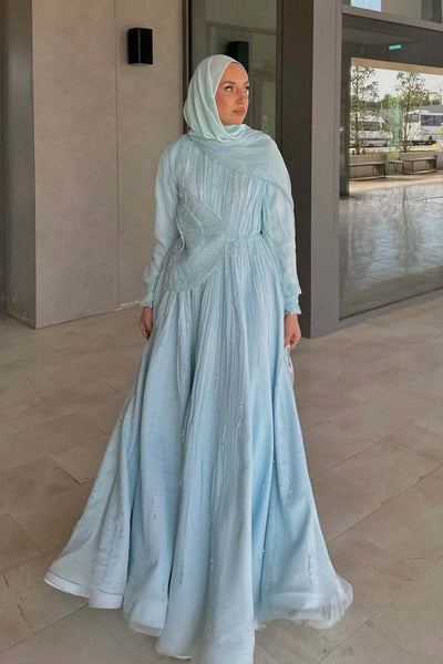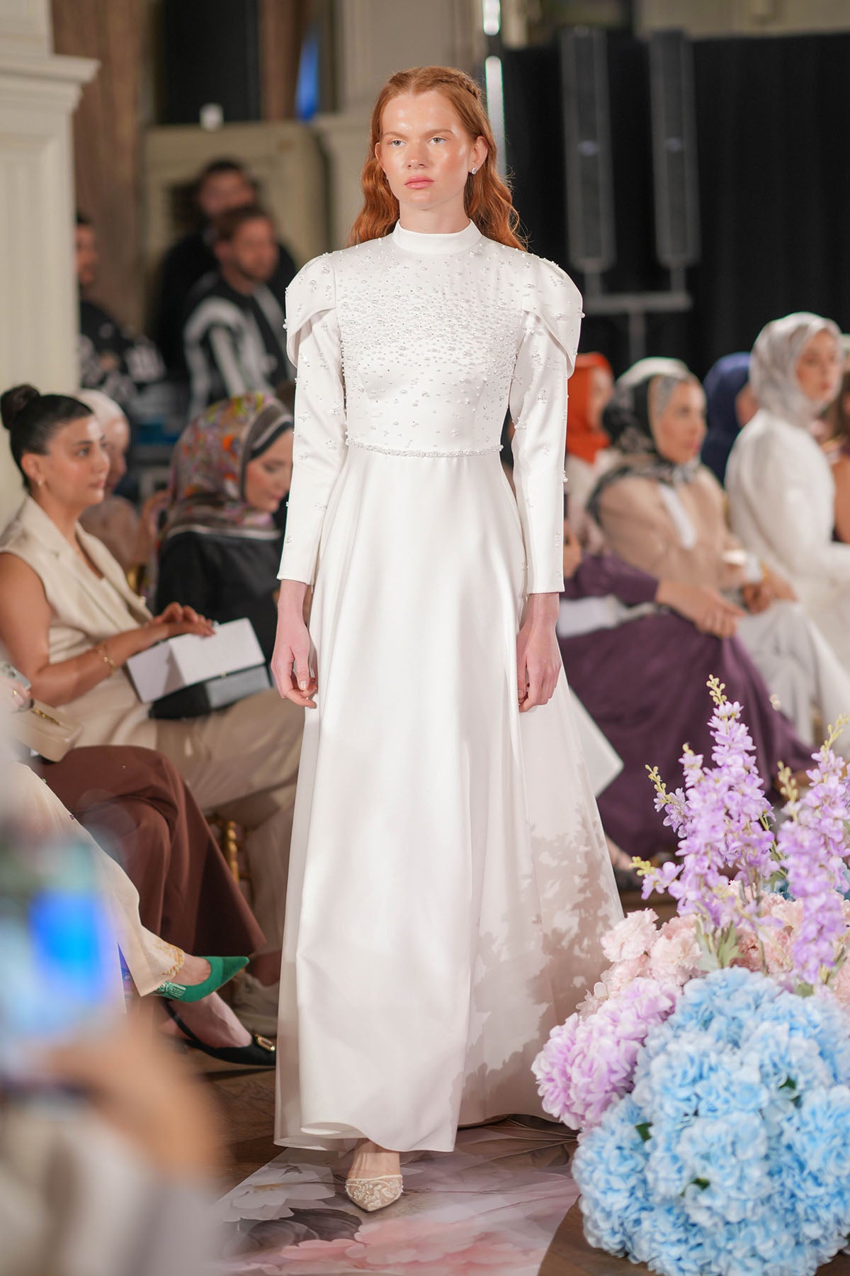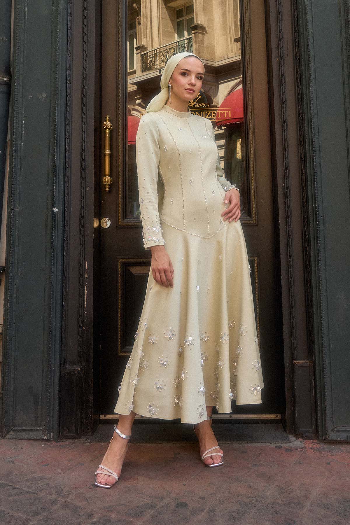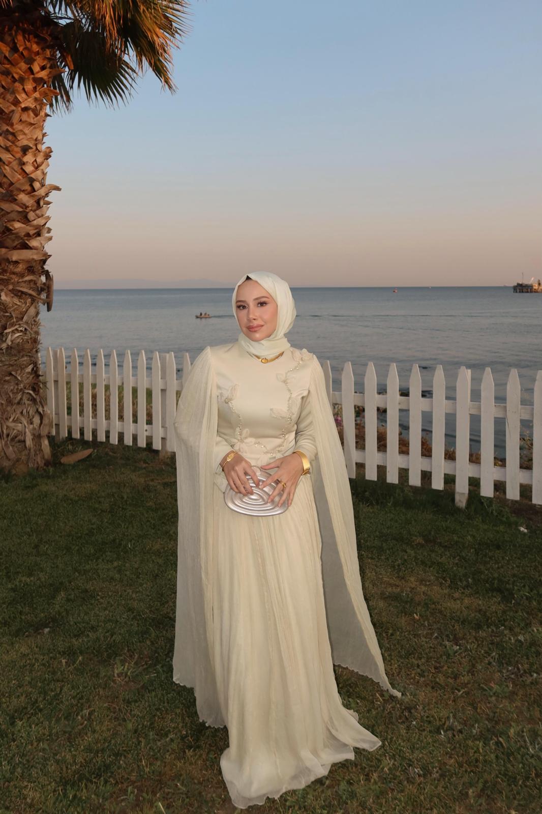 Ürün ortalama 150 cm. Ürünün arkası fermuarlıdır, astarlıdır. Özel üretilmiş ipek kumaş hazırlanmıştır. Kollar yırtmaç detaylıdır Ürün tam kalıptır. Bel detayındaki inciler el işçiliği ile hazırlanmıştır.