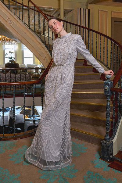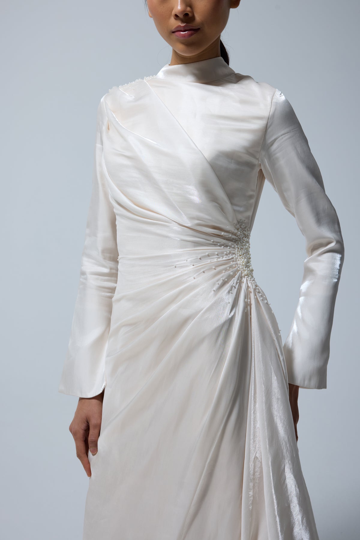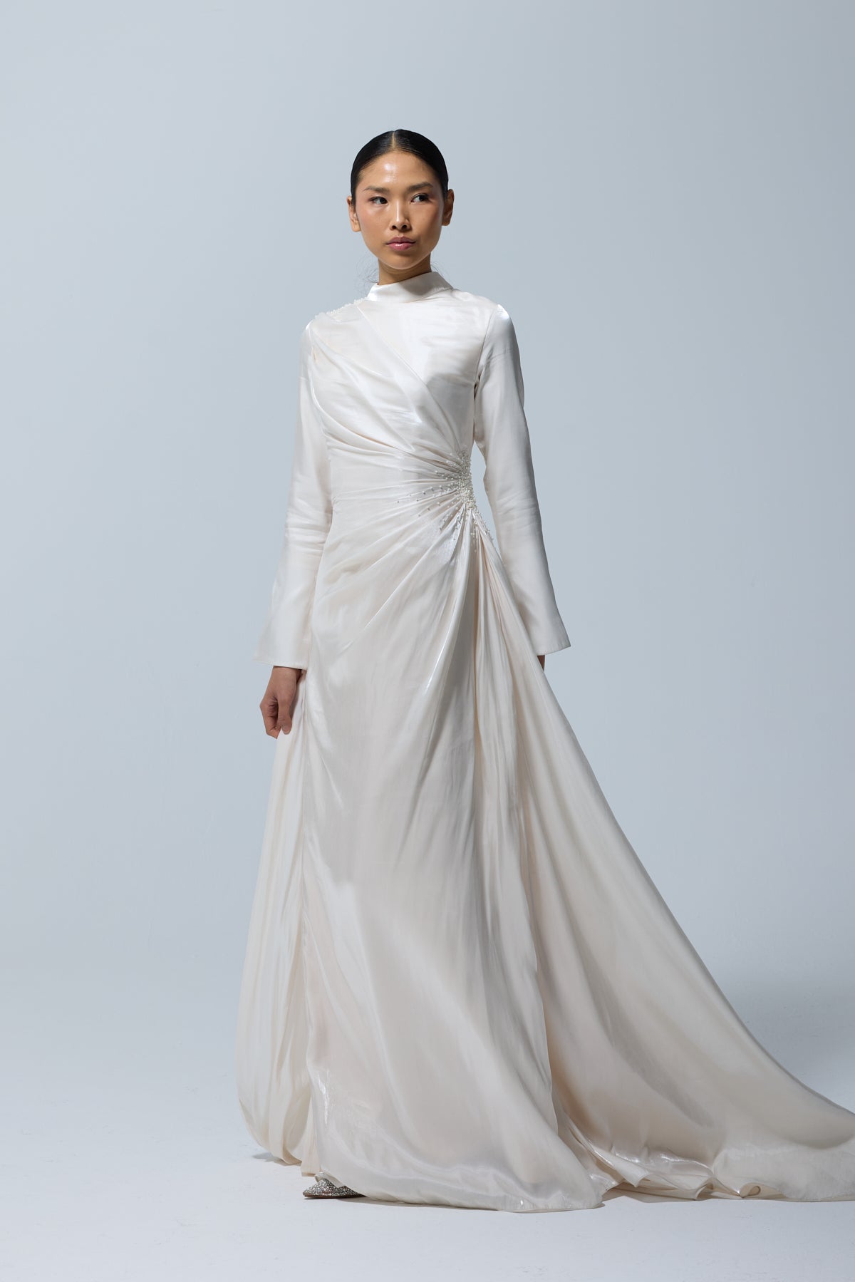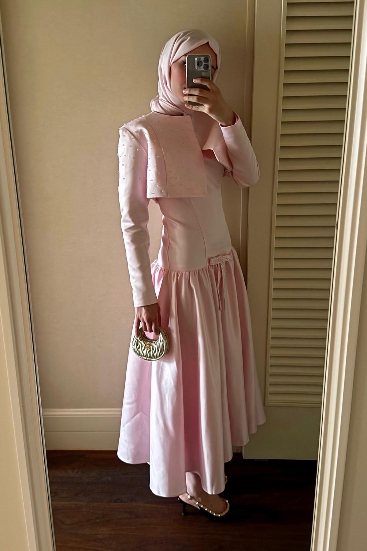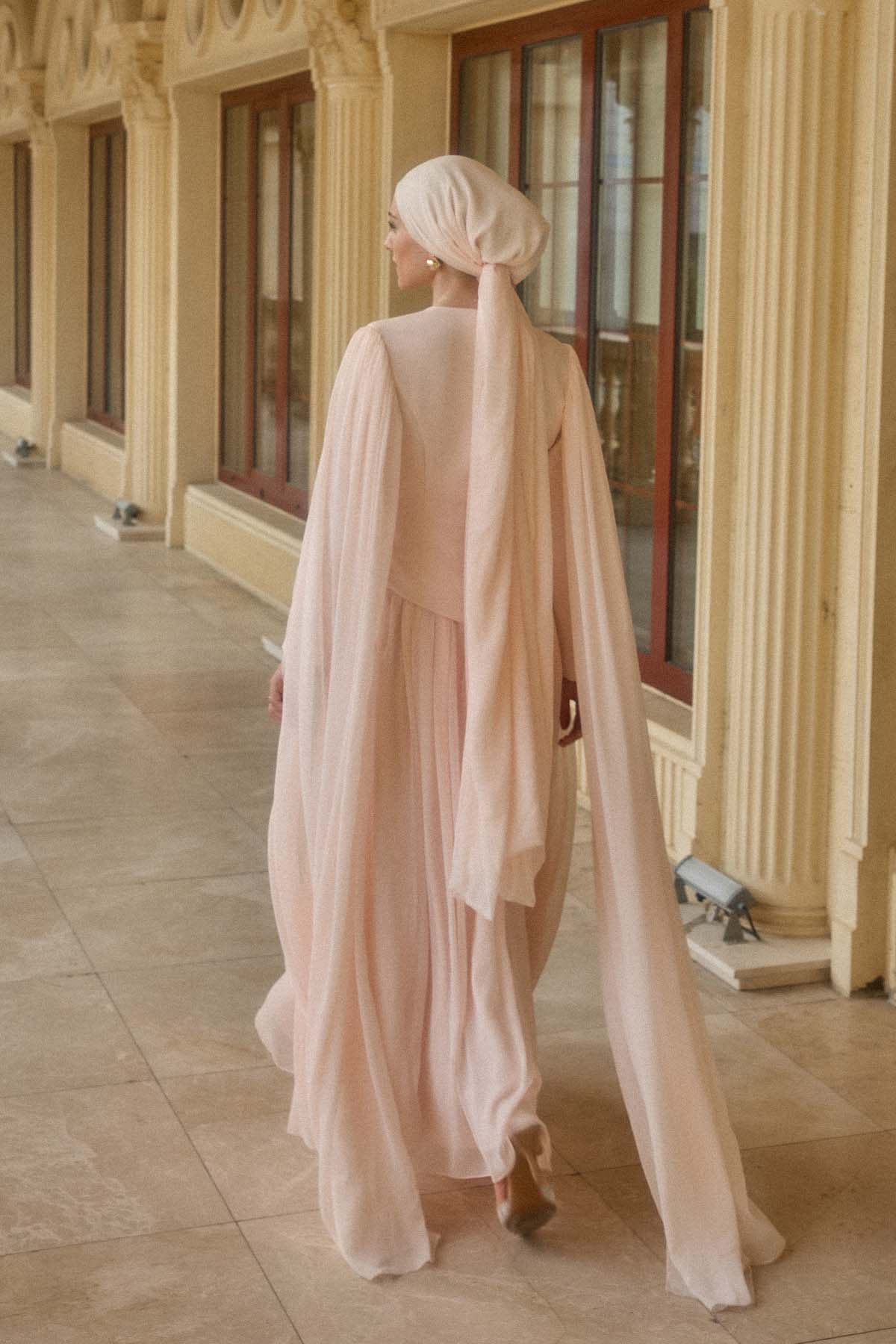 Ürün ortalama 150 cm. Ürünün arkası fermuarlıdır, astarlıdır. Özel üretilmiş ipek kumaş hazırlanmıştır. Kollar yırtmaç detaylıdır Ürün tam kalıptır. Bel detayındaki inciler el işçiliği ile hazırlanmıştır.
