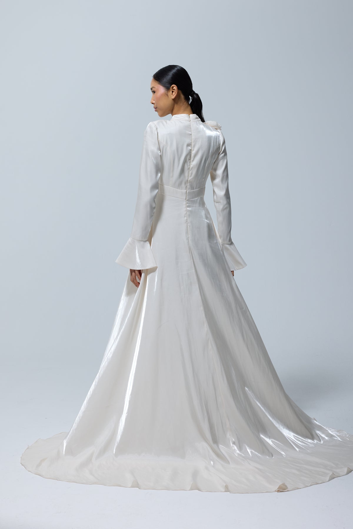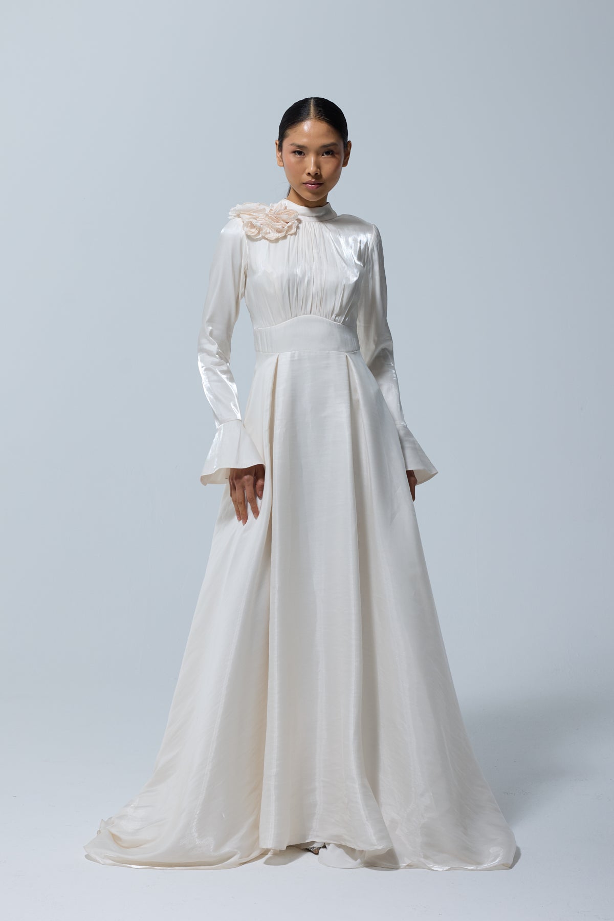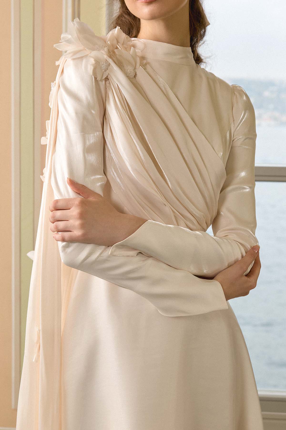 Ürün ortalama 155 cm. Ürünün arkası fermuarlıdır, astarlıdır. Özel üretilmiş ipek kumaş ile hazırlanmıştır. Kolları volanlıdır. Kloş kesimdir. Omzunda el yapımı özel çiçek detayı mevcuttur.