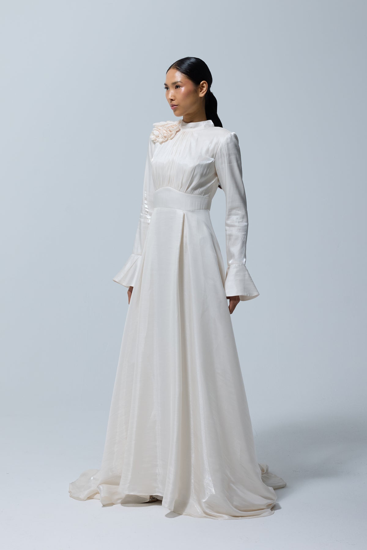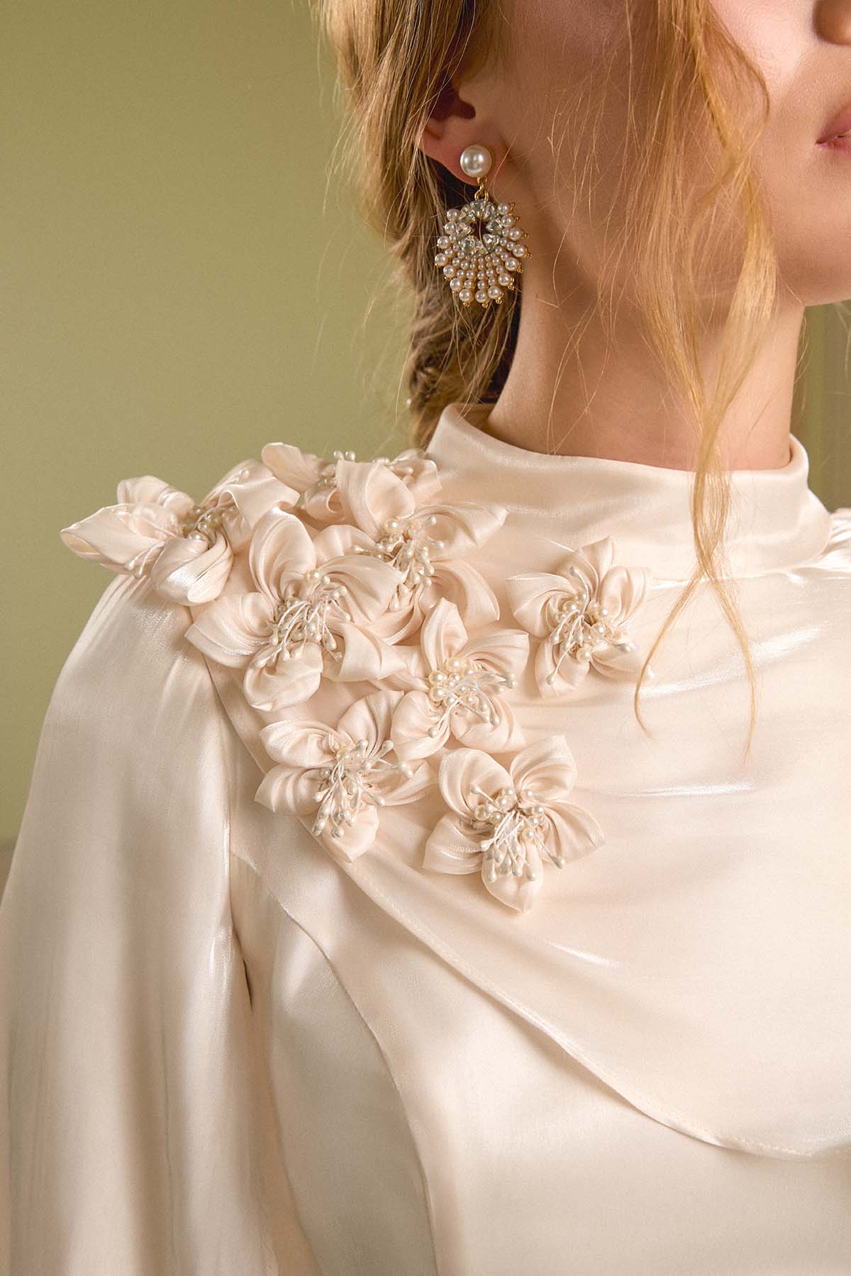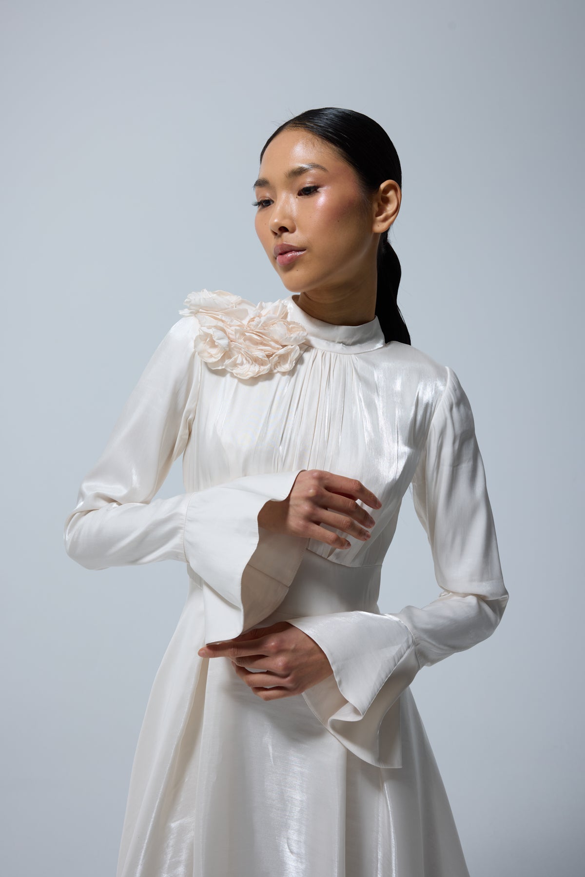 Ürün ortalama 155 cm. Ürünün arkası fermuarlıdır, astarlıdır. Özel üretilmiş ipek kumaş ile hazırlanmıştır. Kolları volanlıdır. Kloş kesimdir. Omzunda el yapımı özel çiçek detayı mevcuttur.