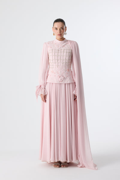 Ürün ortalama 140 cm. Elbisenin arkası fermuarlıdır, astarlıdır. Krep kumaştan hazırlanmıştır. Etek gelişi A kesim formundadır. Ön pelerin kısmı el işçiliği ile tasarlanmış çiçeklerden ve taşlardan hazırlanmıştır.