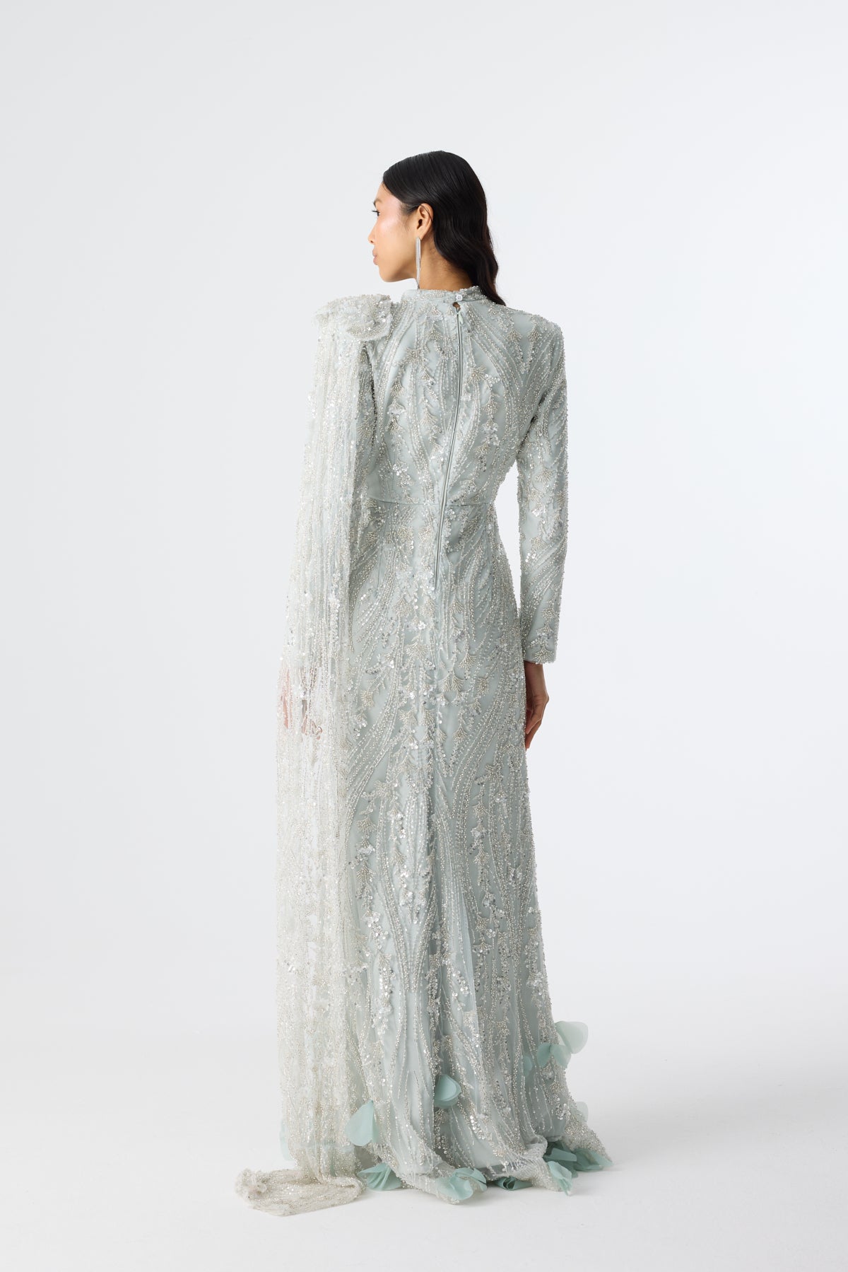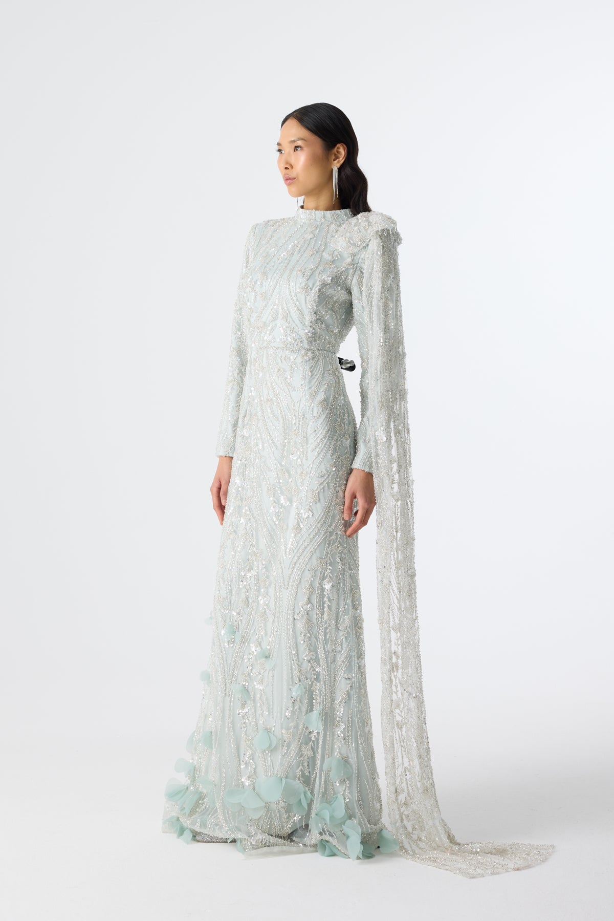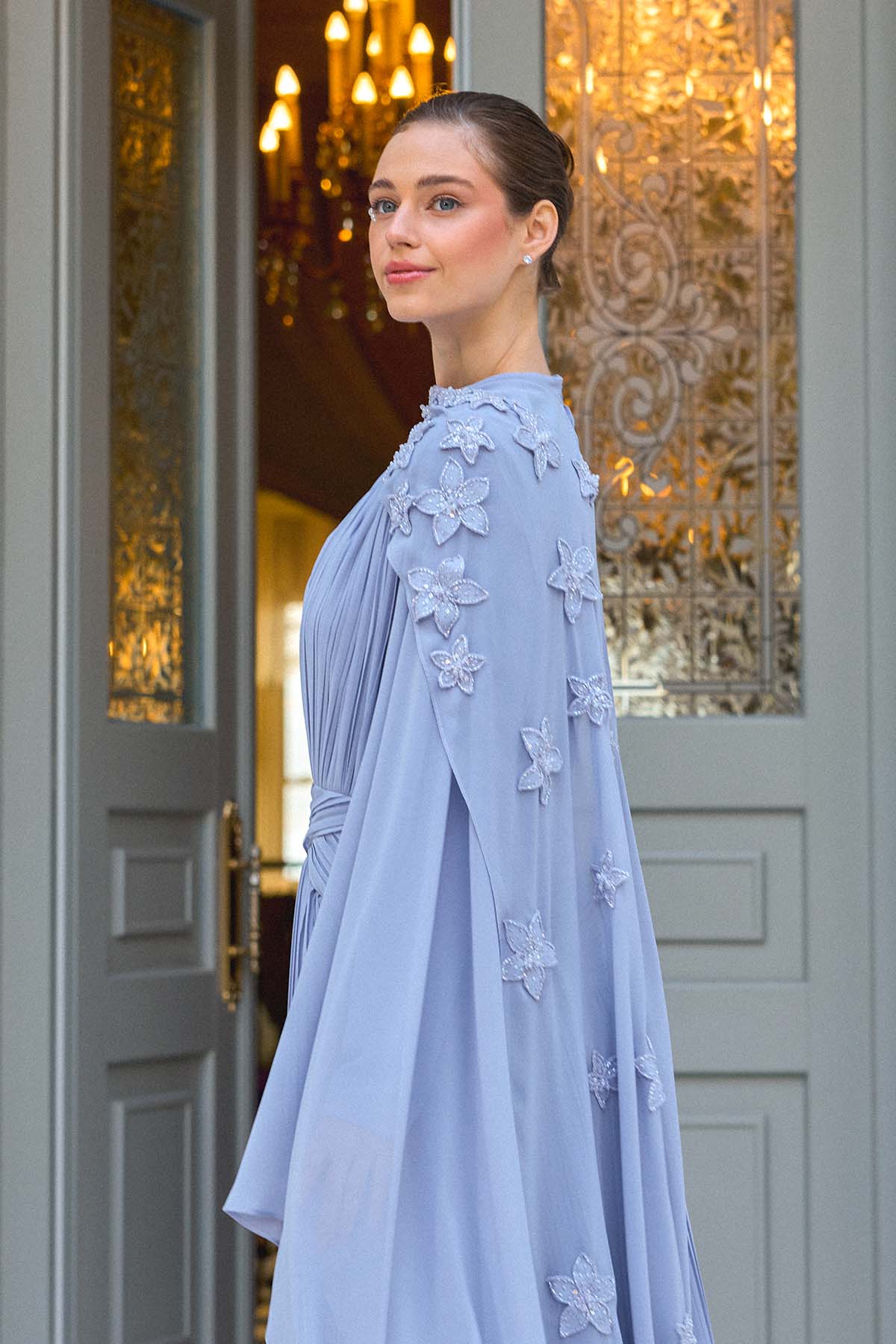 Ürün ortalama 150 cm. Ürünün arkası fermuarlıdır, astarlıdır. Özel üretilmiş ipek kumaş hazırlanmıştır. Sağ omuzdan etek ucuna inen pelerin detayı mevcuttur. Pelerindeki çiçekler kristal taşlarla özenle hazırlanmıştır. Ürün tam kalıptır.