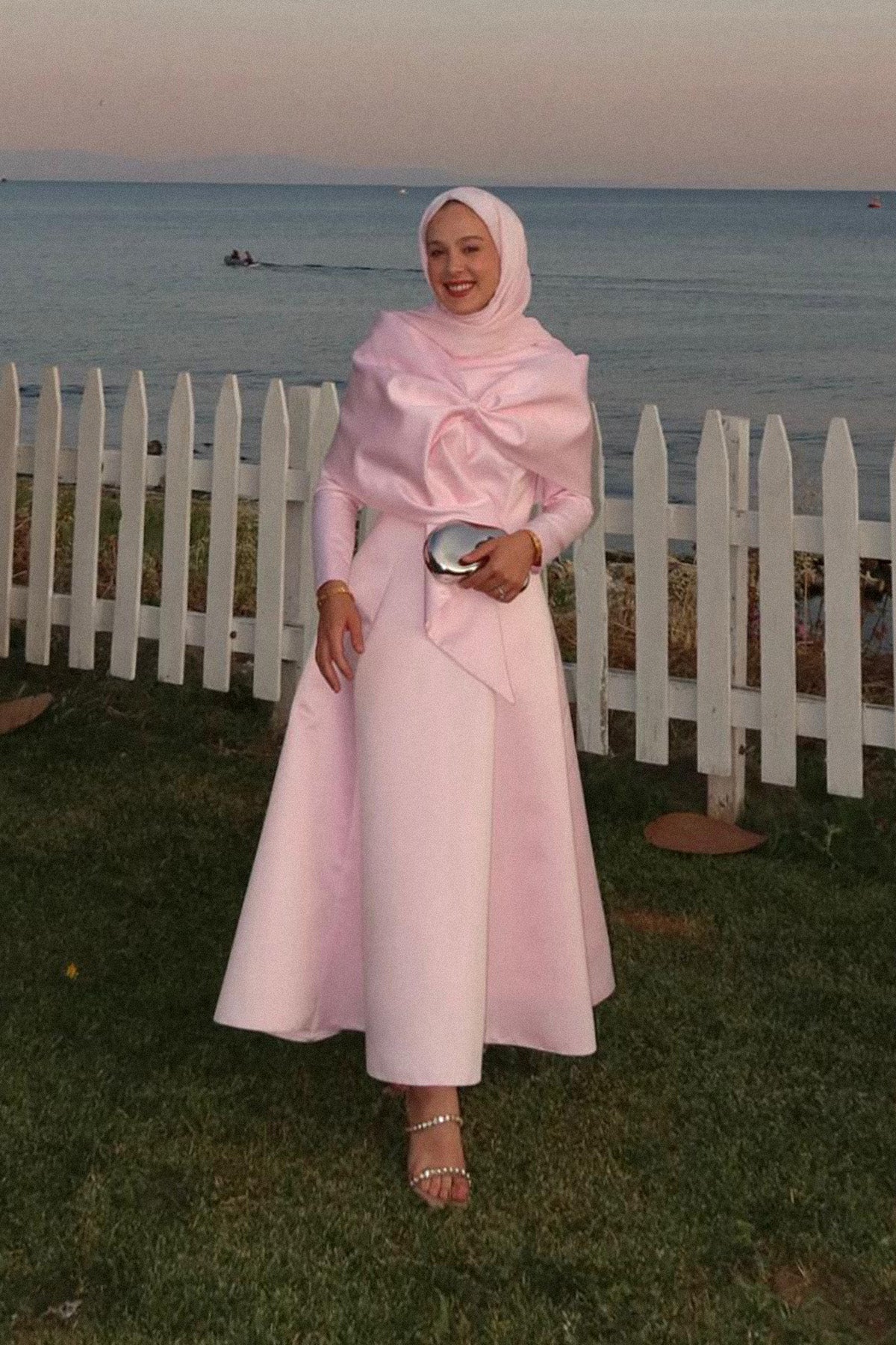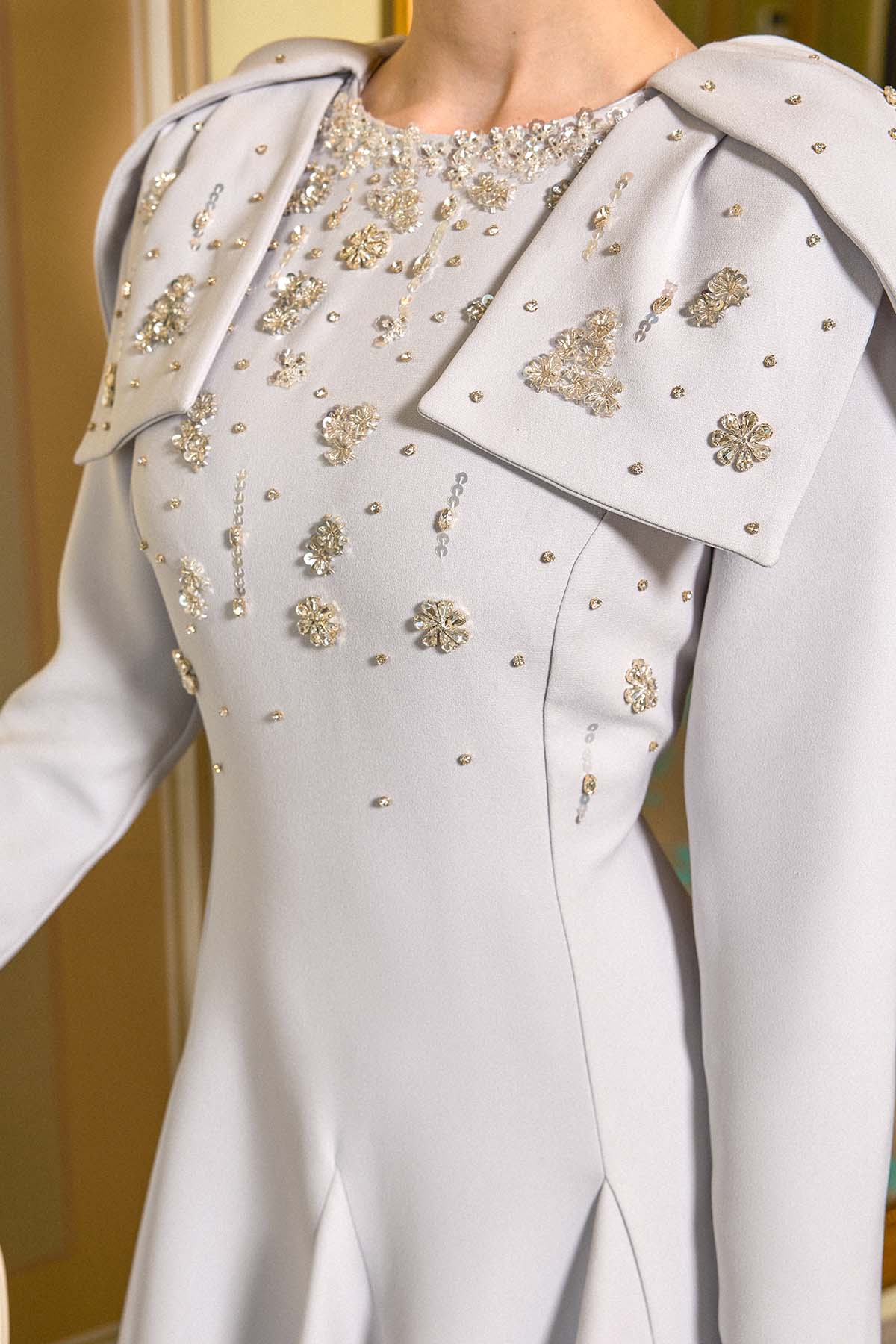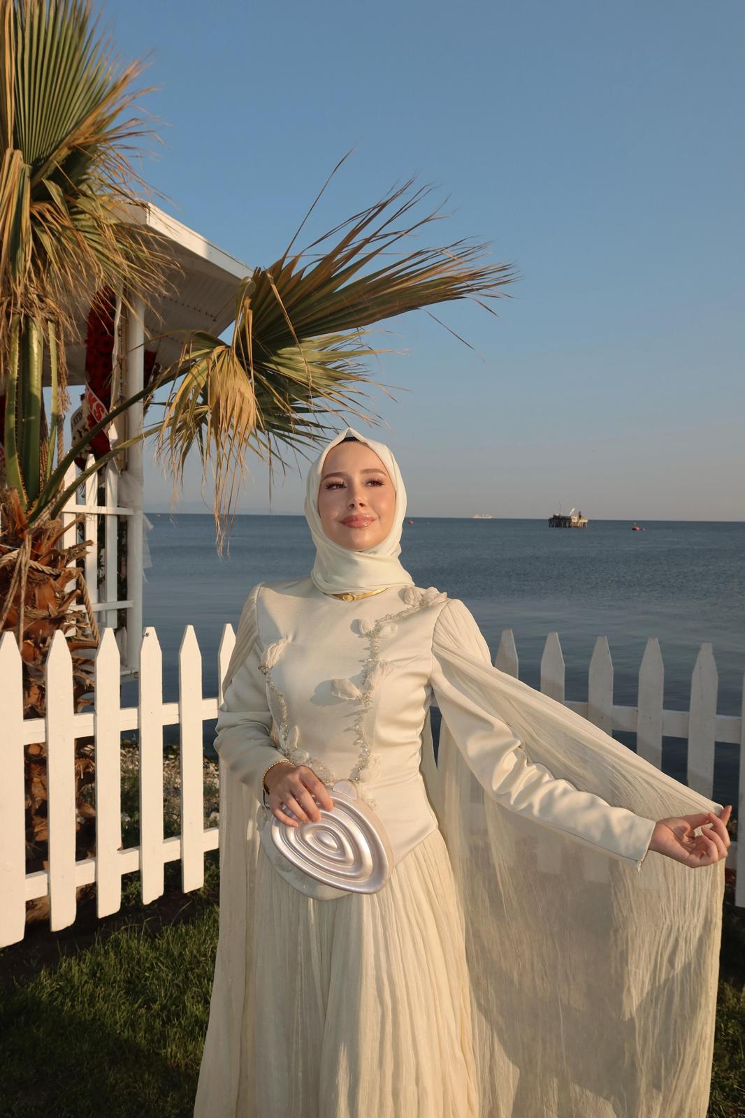 Ürün ortalama 160 cm. Elbisenin arkası fermuarlıdır, astarlıdır. Krep kumaştan hazırlanmıştır. Etek gelişi kalem formundadır. Omuz kısmından eteğe uzanan fiyonk şeklinde pelerini mevcuttur. Özel taşlarla özenle el işçiliği ile işlenmiştir.
