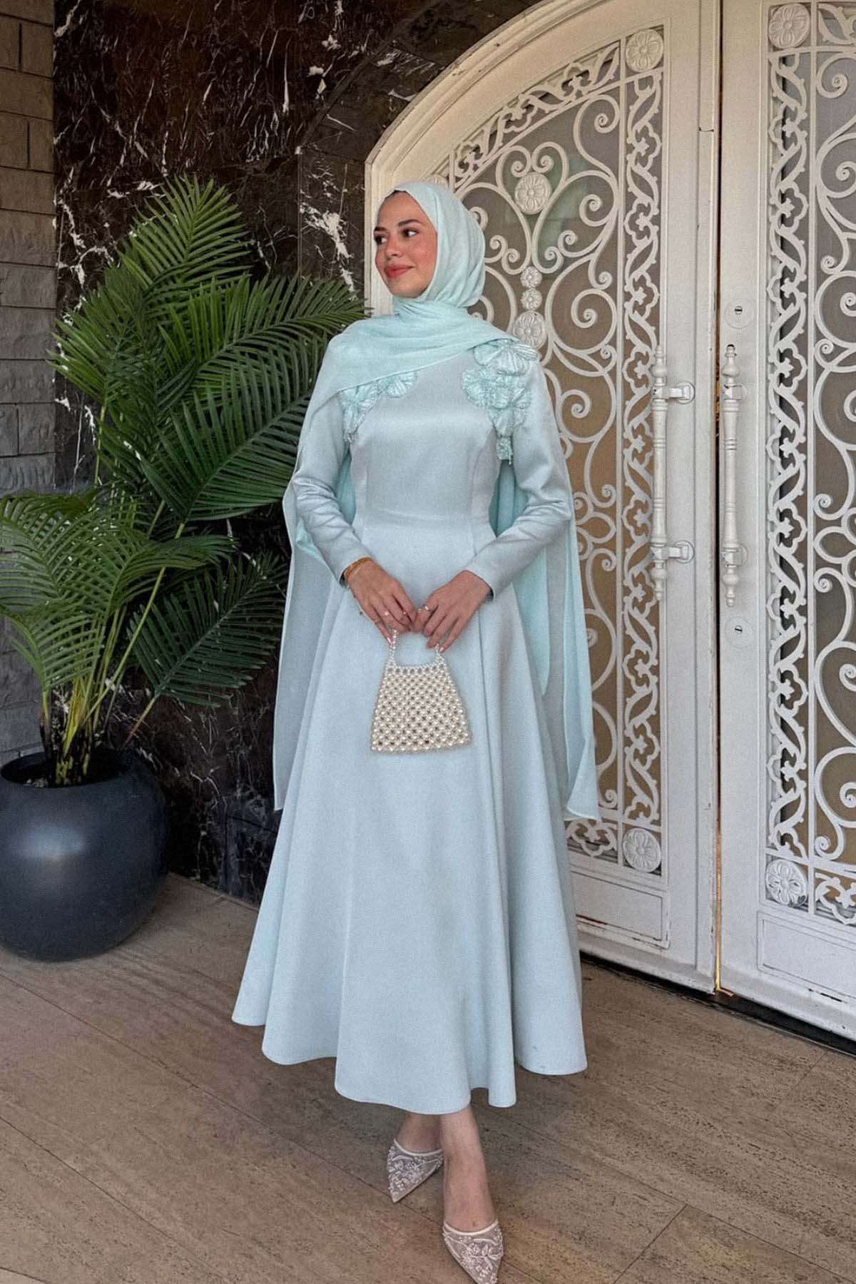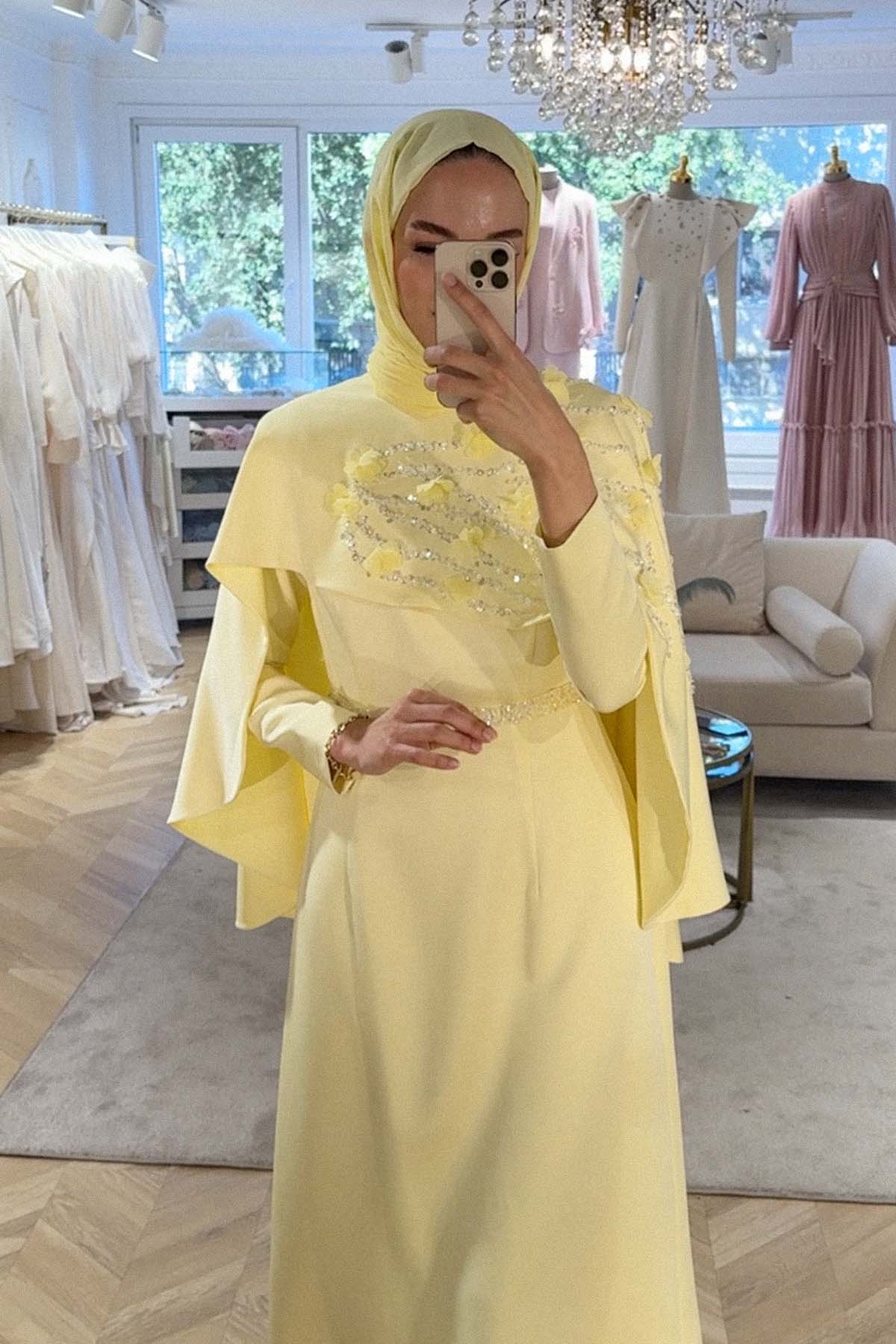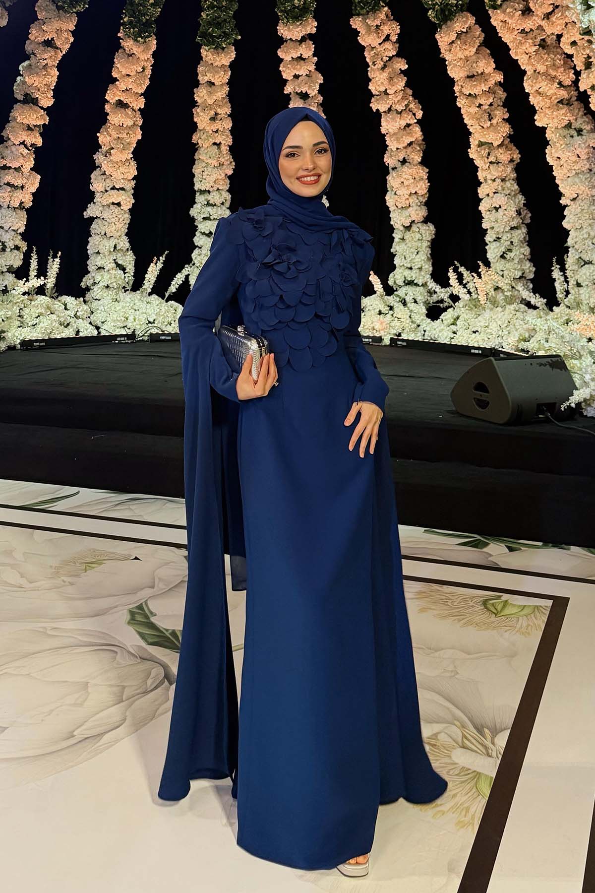 Ürün ortalama 150 cm. Elbisenin arkası fermuarlıdır, astarlıdır. Saten krep kumaştan hazırlanmıştır. Etek gelişi kalem formundadır. Omuz kısmından eteğe uzanan pelerini mevcuttur. Göğüs kısmındaki çiçekler el işçiliği ile özenle hazırlanmıştır.
