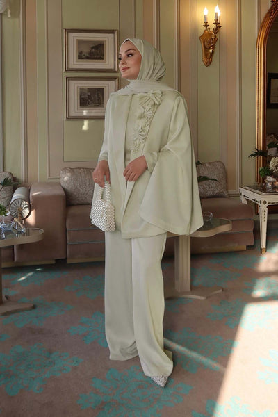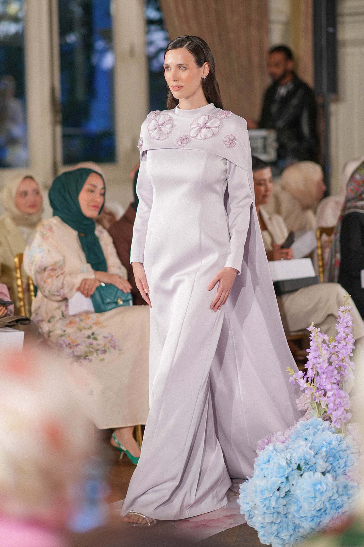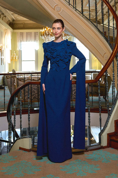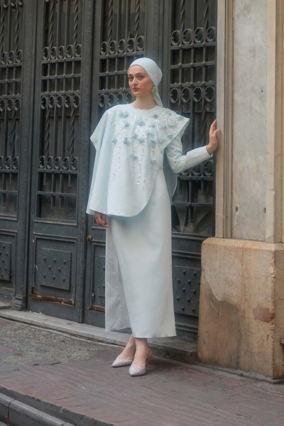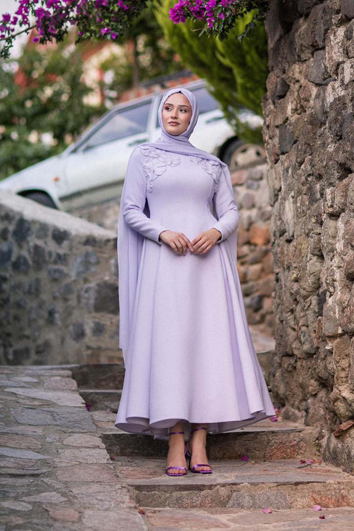 Ürün ortalama 150 cm. Elbisenin arkası fermuarlıdır, astarlıdır. Saten krep kumaştan hazırlanmıştır. Etek gelişi kalem formundadır. Omuz kısmından eteğe uzanan pelerini mevcuttur. Göğüs kısmındaki çiçekler el işçiliği ile özenle hazırlanmıştır.