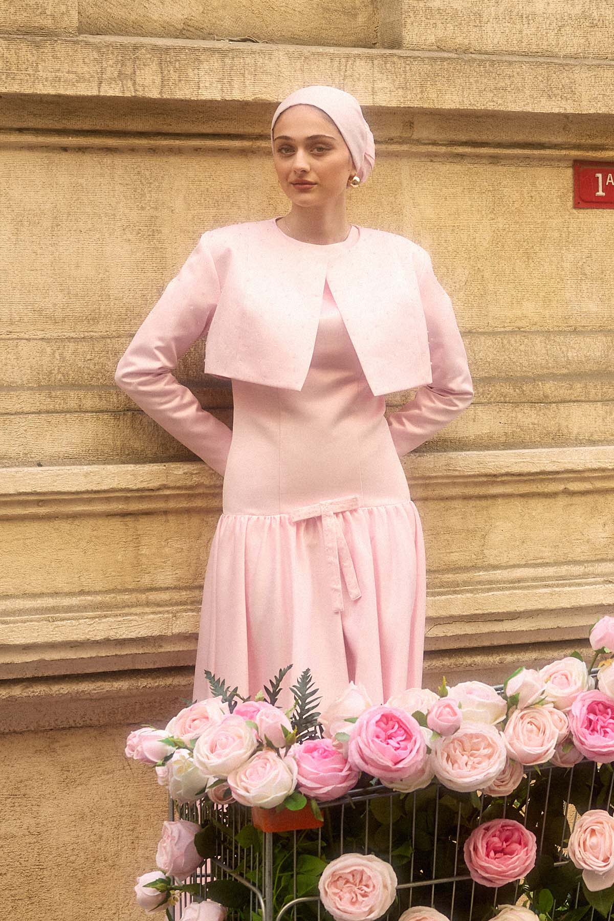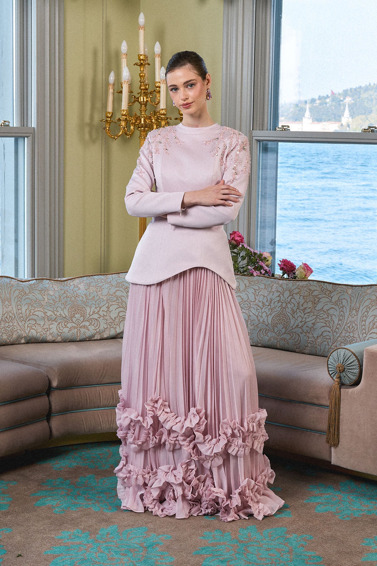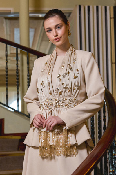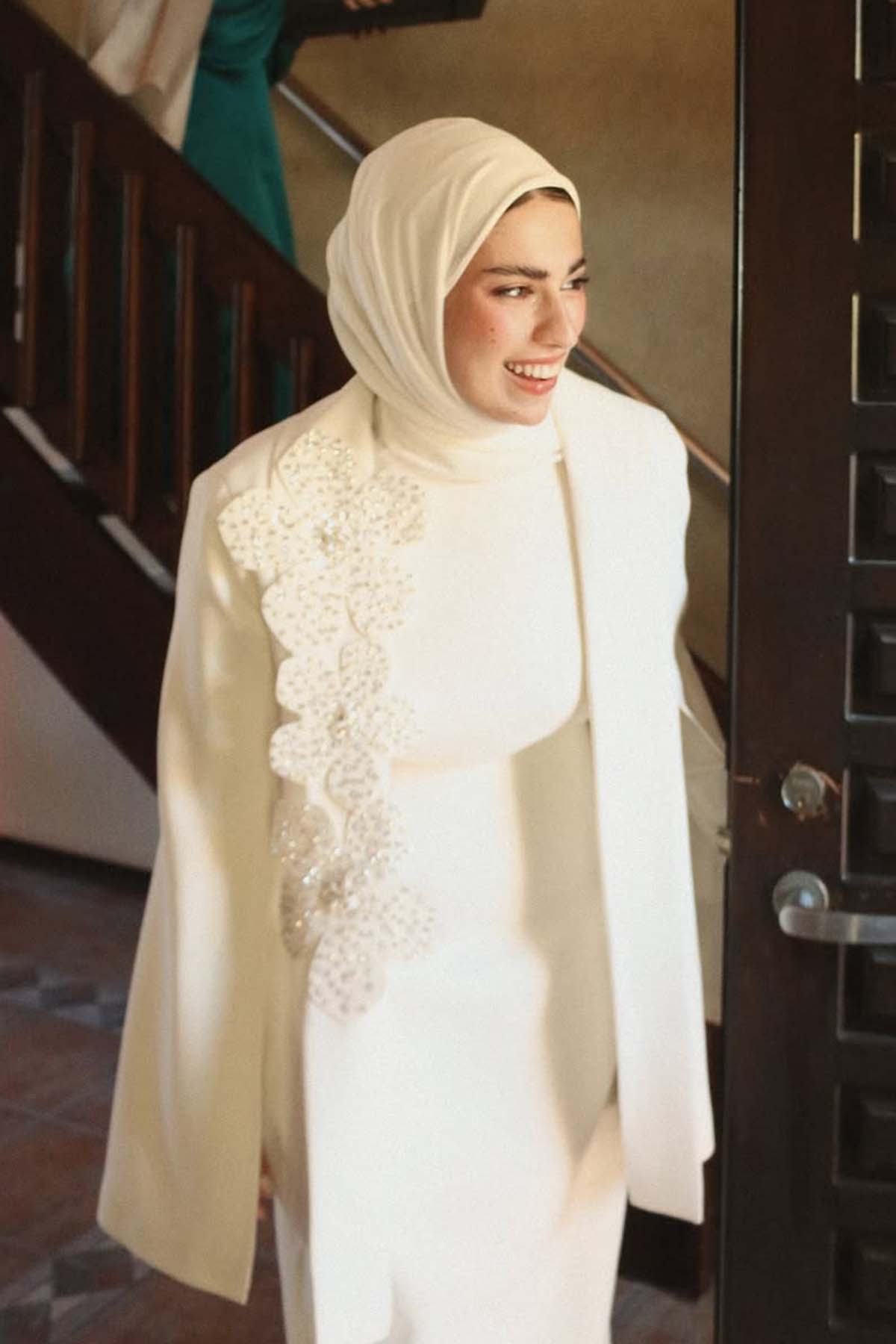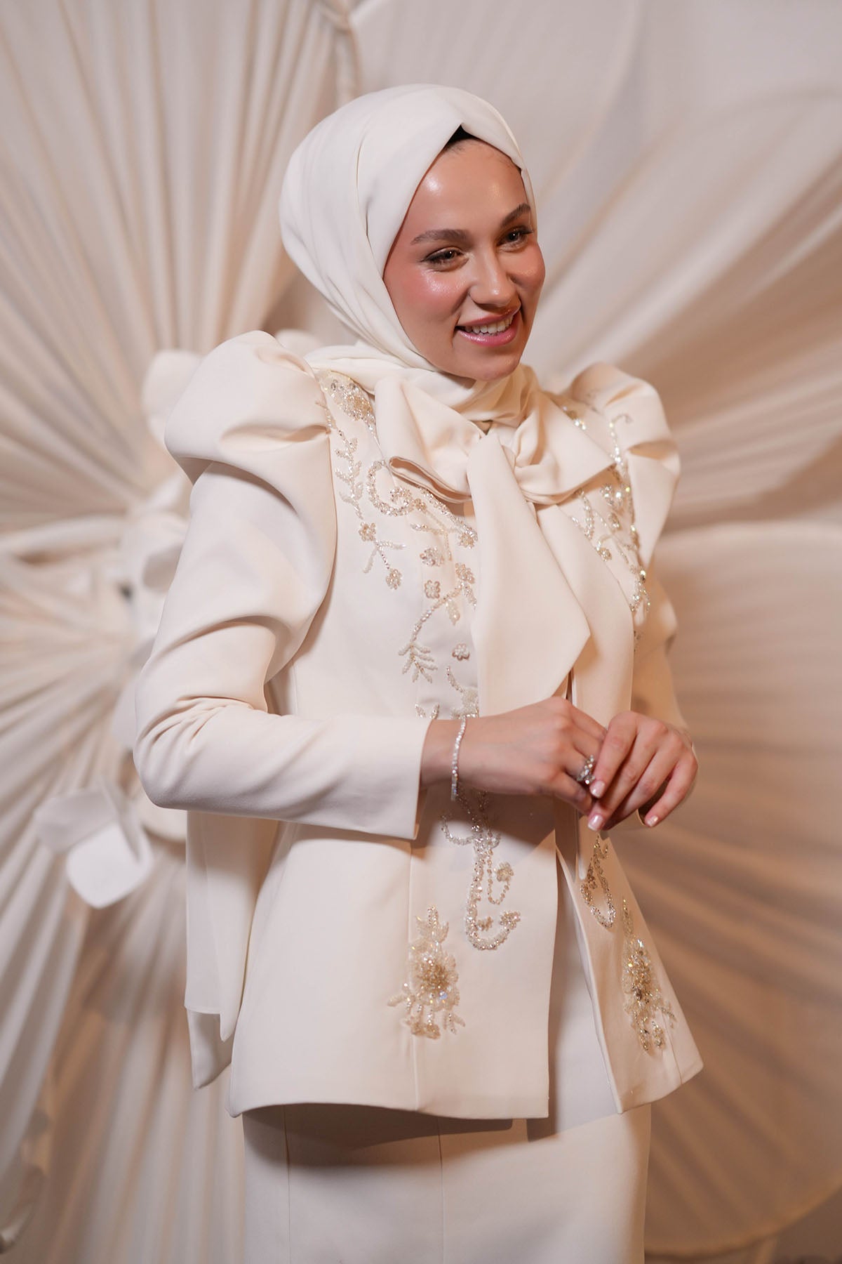 Elbise boyu ortalama 150 cm. Elbisenin arkası fermuarlıdır, astarlıdır. Krep kumaştan hazırlanmıştır. Etek gelişi kalem formundadır. Ceket boyu 68 cm. Astarlıdır, krep kumaştan hazırlanmıştır. Yakasında fiyonk detayı ile hazırlanmıştır. Ceket özel taşlarla el işçiliği olarak hazırlanmıştır.