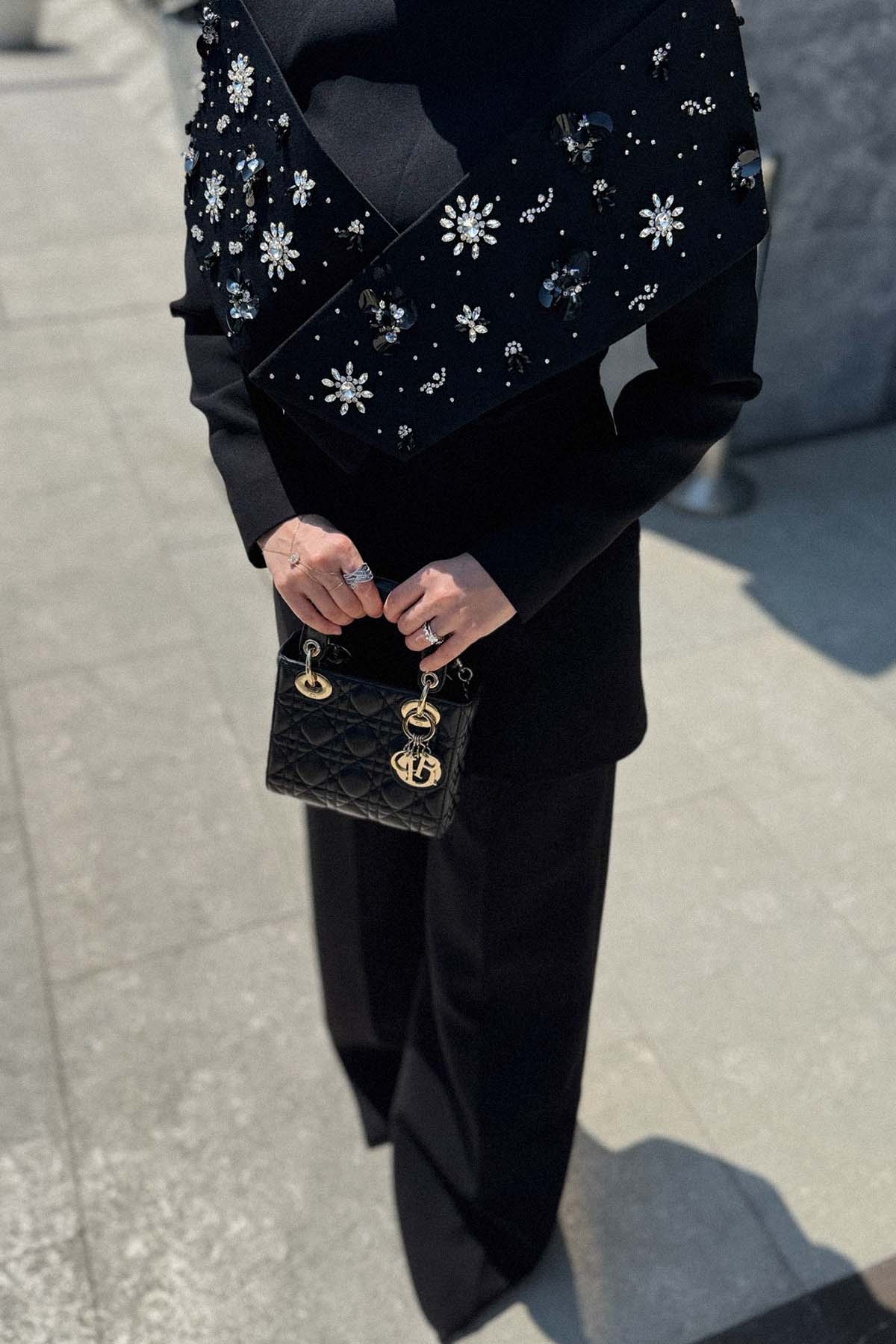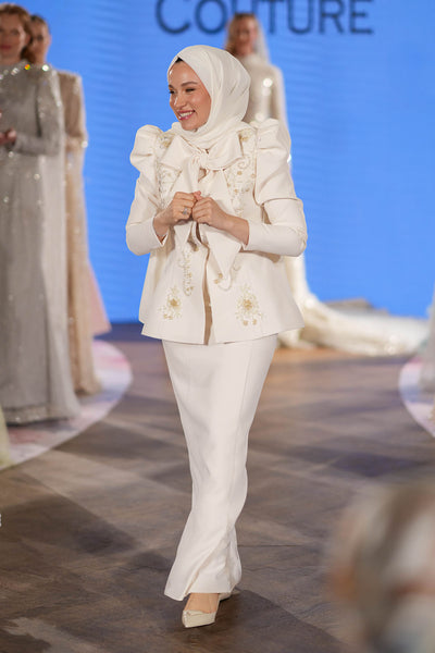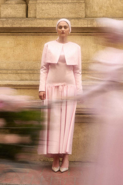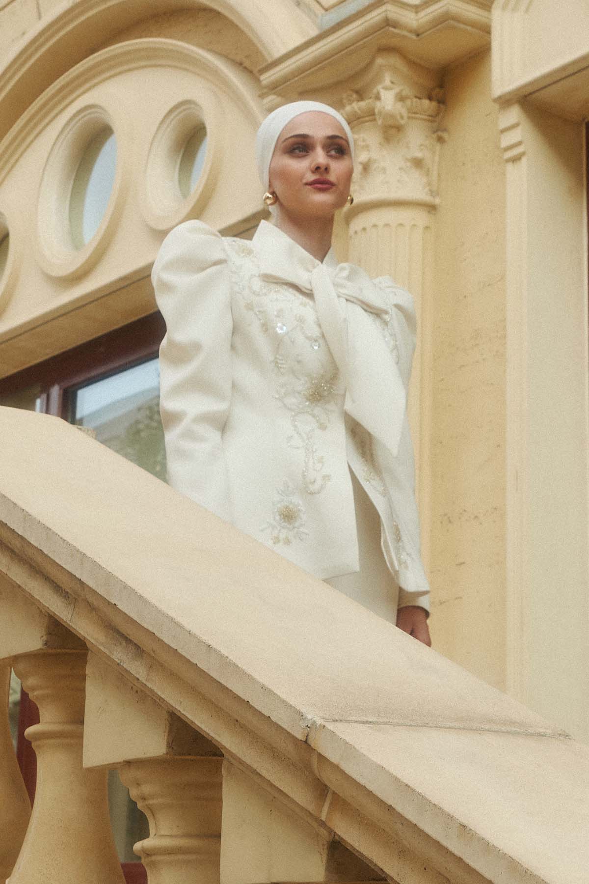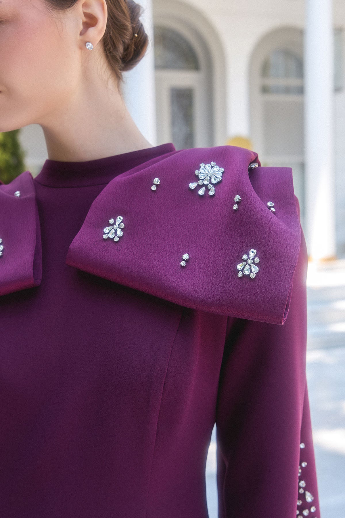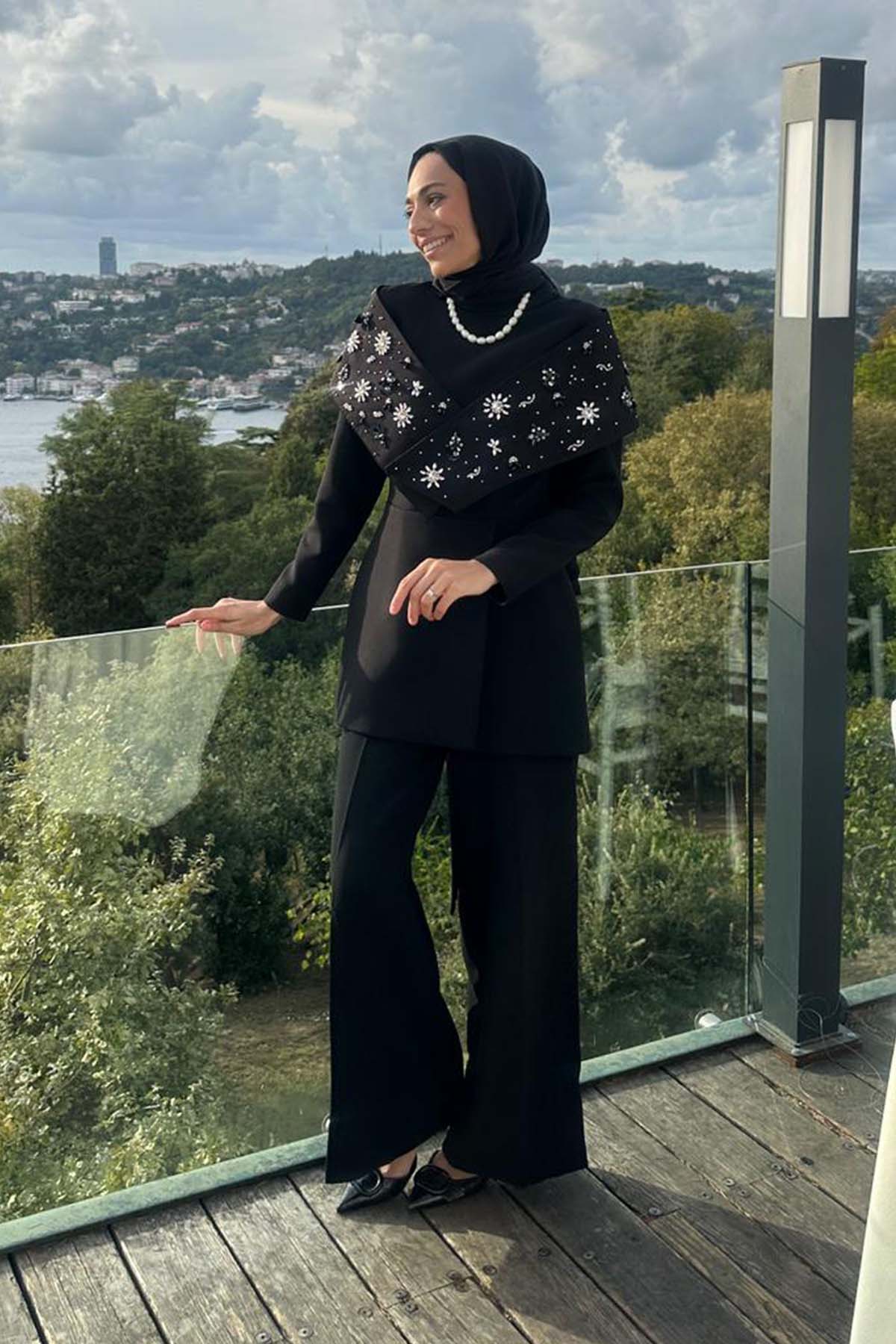 Elbise boyu ortalama 150 cm. Elbisenin arkası fermuarlıdır, astarlıdır. Krep kumaştan hazırlanmıştır. Etek gelişi kalem formundadır. Ceket boyu 68 cm. Astarlıdır, krep kumaştan hazırlanmıştır. Yakasında fiyonk detayı ile hazırlanmıştır. Ceket özel taşlarla el işçiliği olarak hazırlanmıştır.