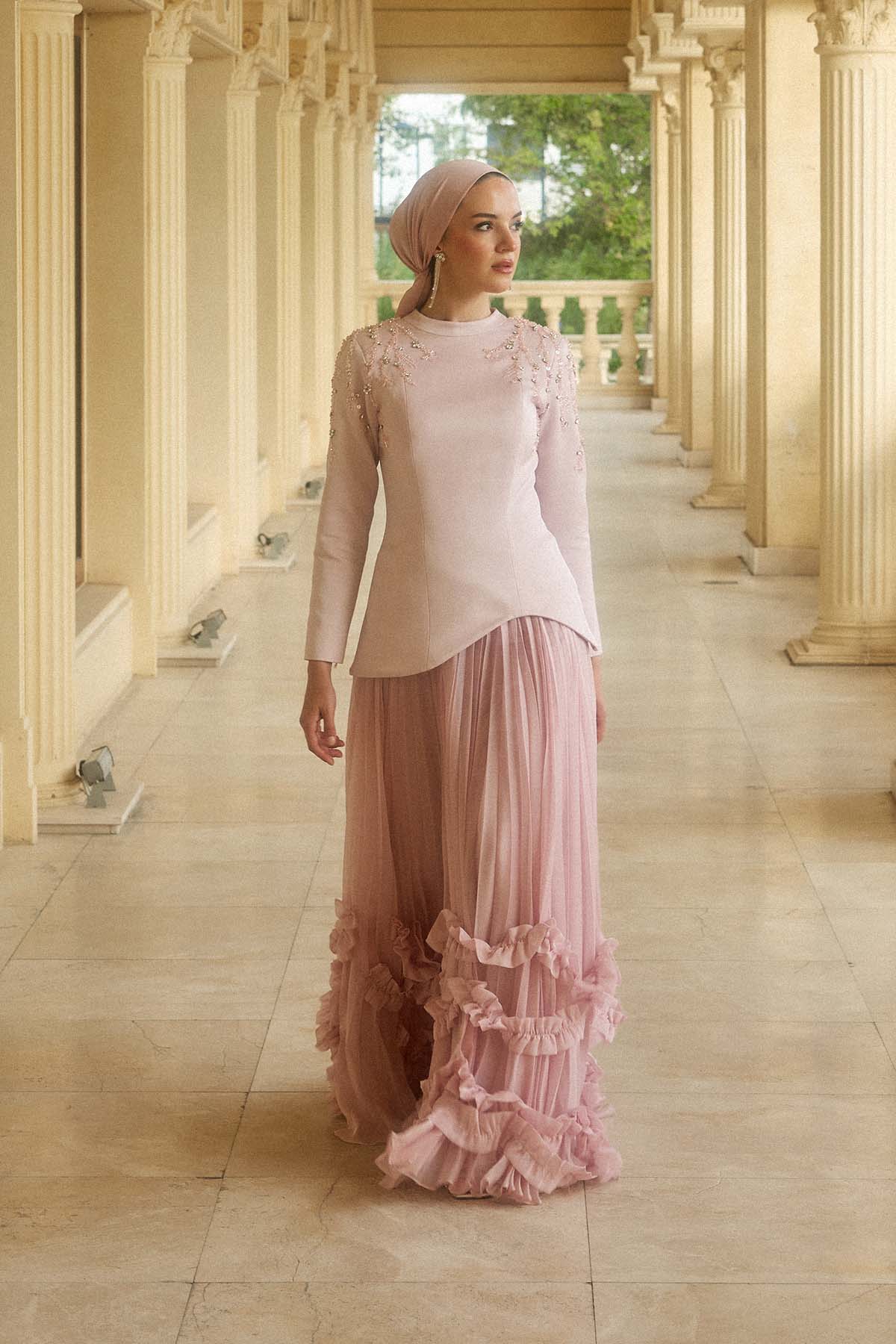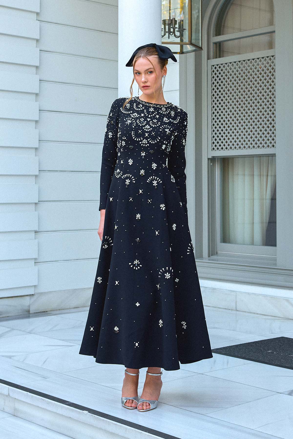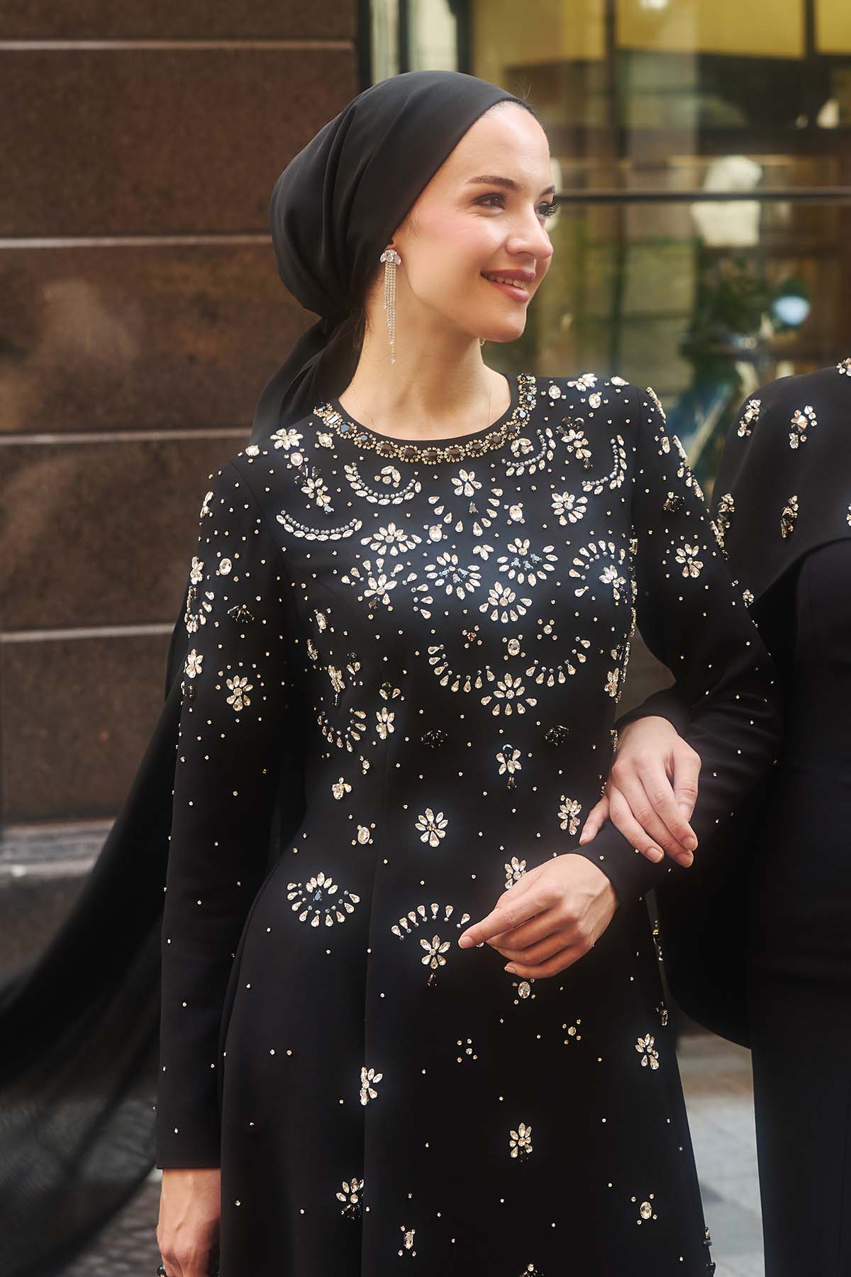 Ürün ortalama 135 cm. Elbisenin arkası fermuarlıdır, astarlıdır. Krep kumaştan hazırlanmıştır. Etek gelişi kalem formundadır. Omuz kısmından bele doğru uzanan cepken mevcuttur. Özel taşlarla özenle el işçiliği ile işlenmiştir.