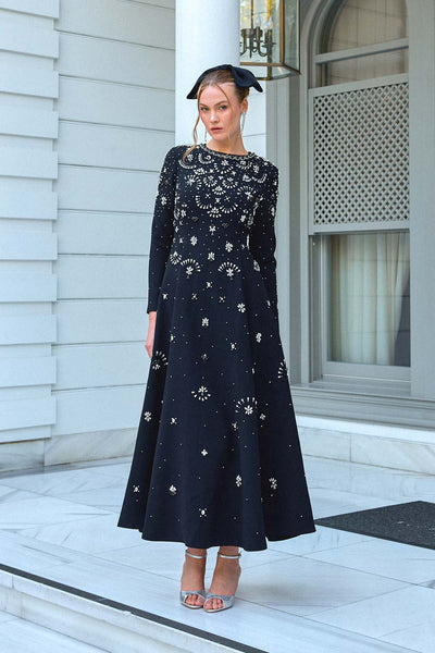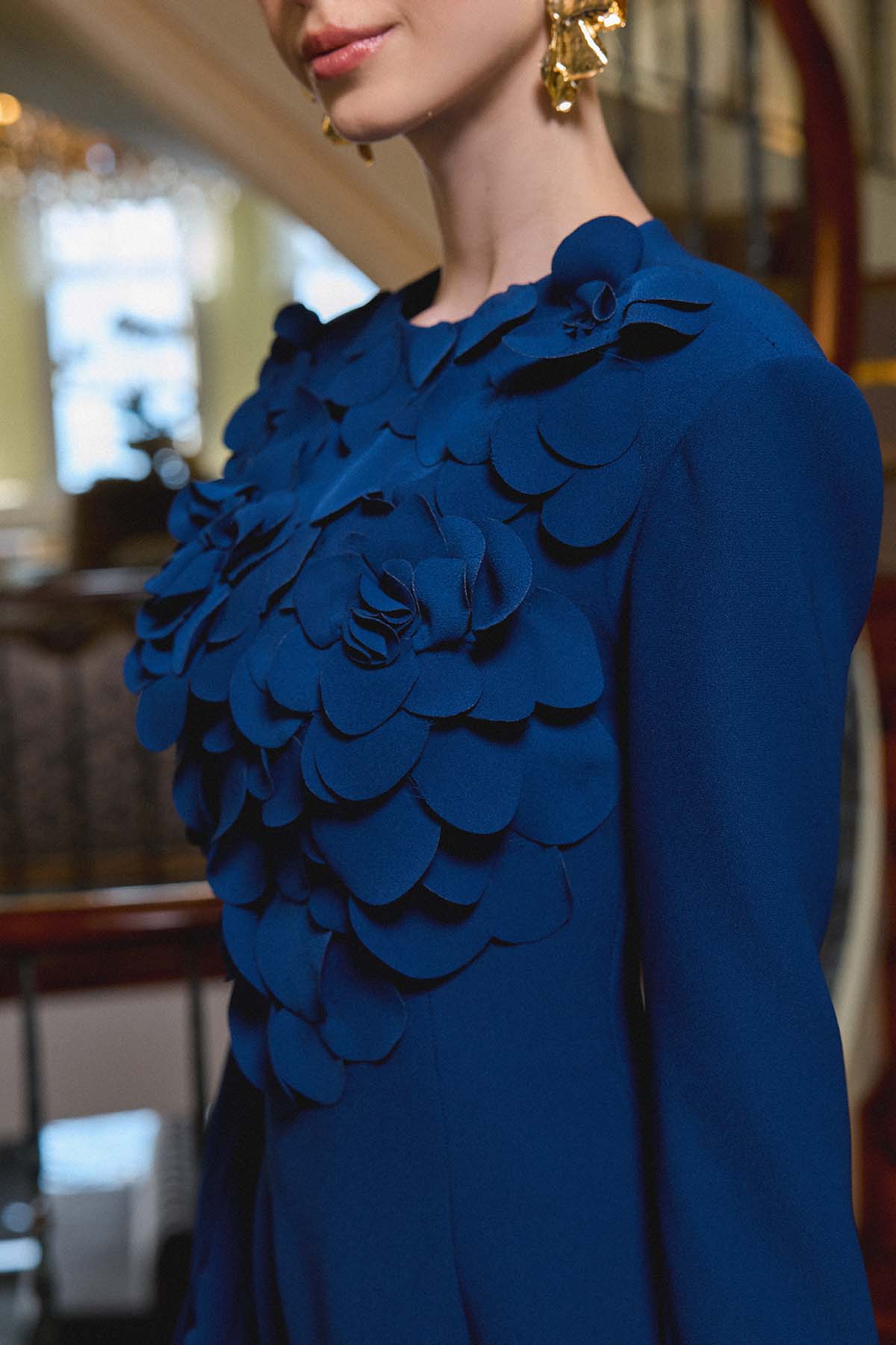 Ürün ortalama 135 cm. Ürünün arkası fermuarlıdır, astarlıdır. Krep kumaştan hazırlanmıştır. Yaka kısmında şifon detay mevcuttur. Kloş etek formuna sahiptir. Çiçek detayları el işçiliği ile işlenmiştir.