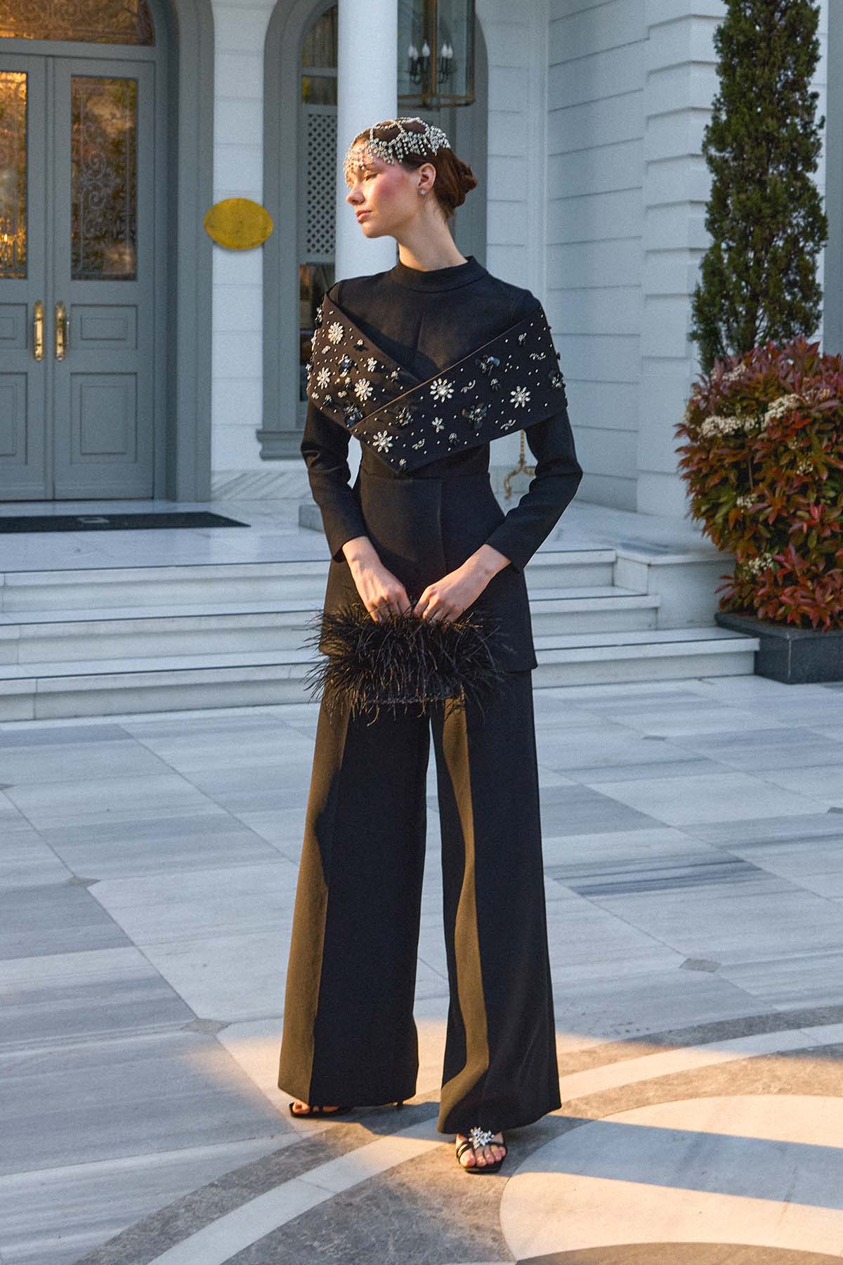 Ürün ortalama 150 cm. Tulumun arkası fermuarlıdır, astarlıdır. Krep kumaştan ve özel taşlı kumaştan hazırlanmıştır. Omuzlardan öne doğru ve arkadan yere kadar uzanan pelerini mevcuttur. Üst kısmındaki çiçek işlemeler el işçiliği ile özenle hazırlanmıştır.