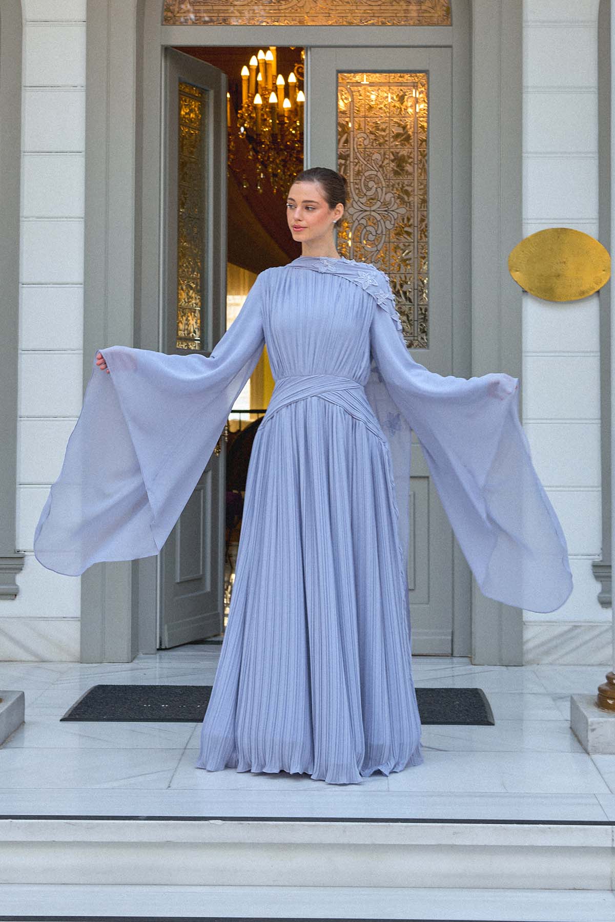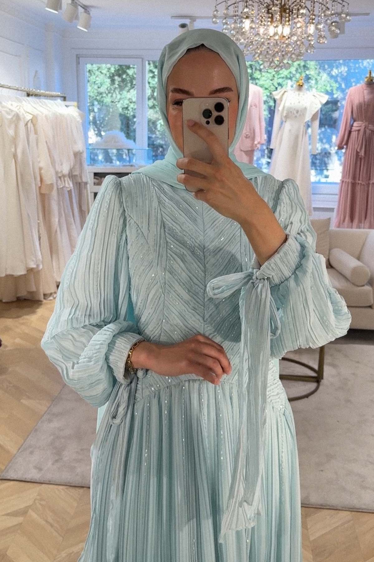 Ürün ortalama 150 cm. Ürünün arkası fermuarlıdır, astarlıdır. Şifon kumaşa pilise işlem uygulanmıştır. Kollarında bağlama detayı mevcuttur. İşleme detayları el işçiliği ile tamamlanmıştır.