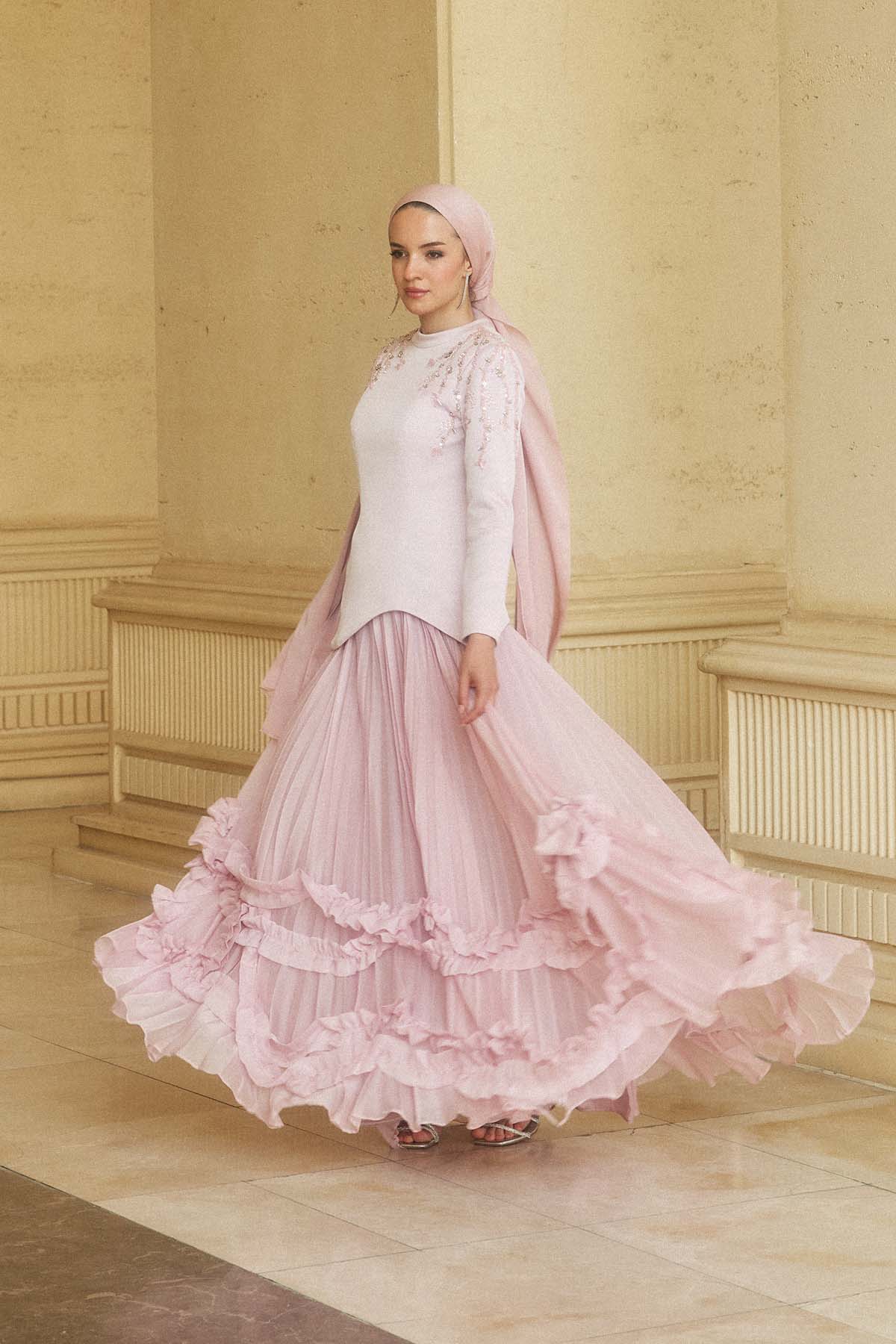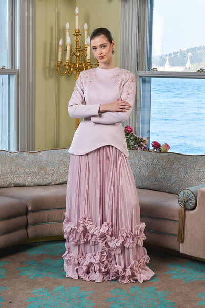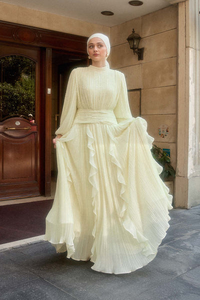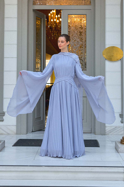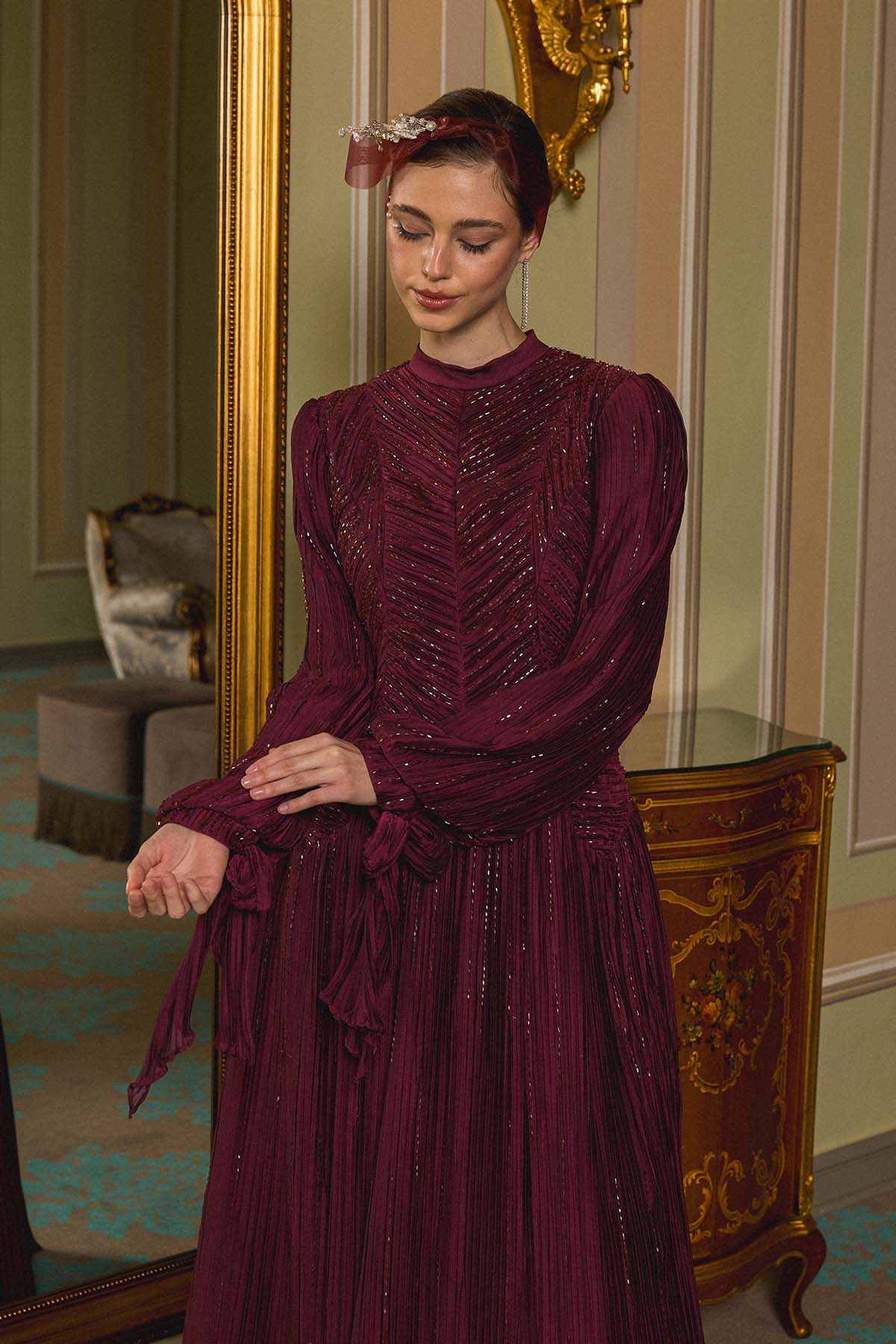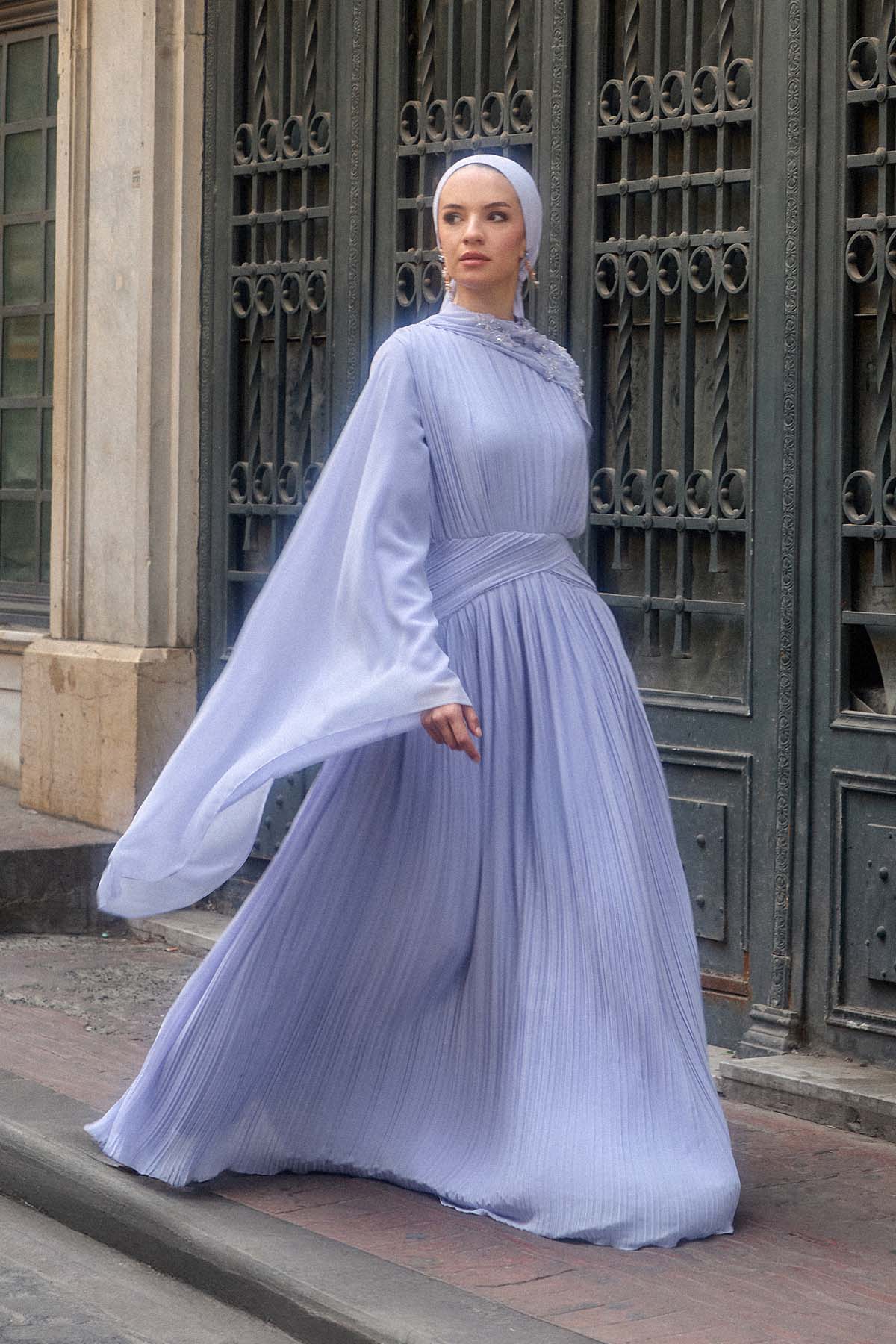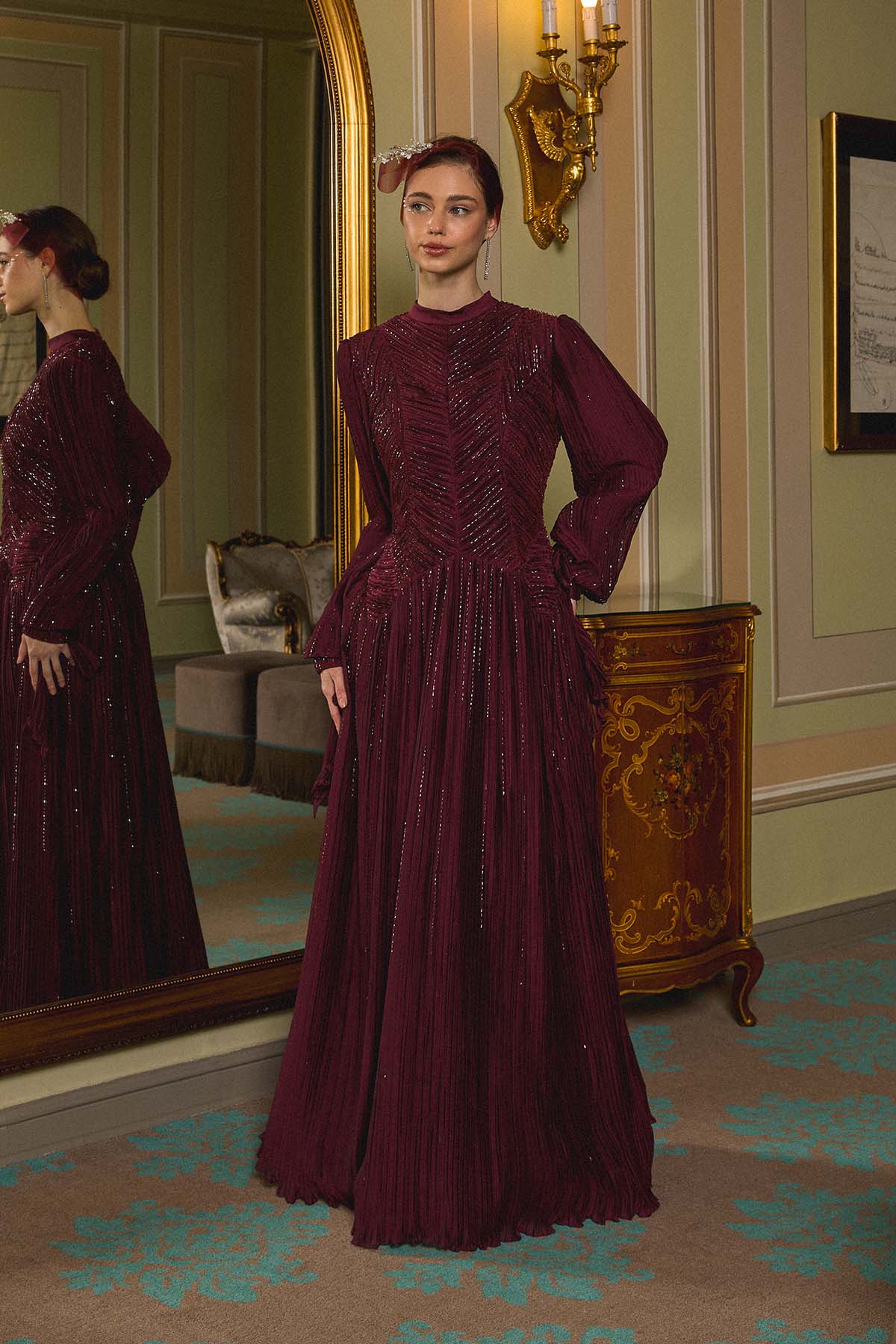 Ürün ortalama 150 cm. Ürünün arkası fermuarlıdır, astarlıdır. Şifon kumaşa pilise işlem uygulanmıştır. İşleme detayları el işçiliği ile tamamlanmıştır.