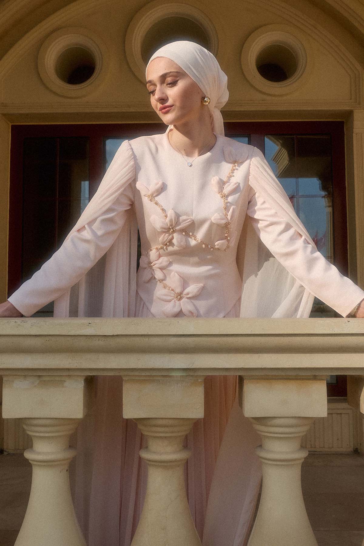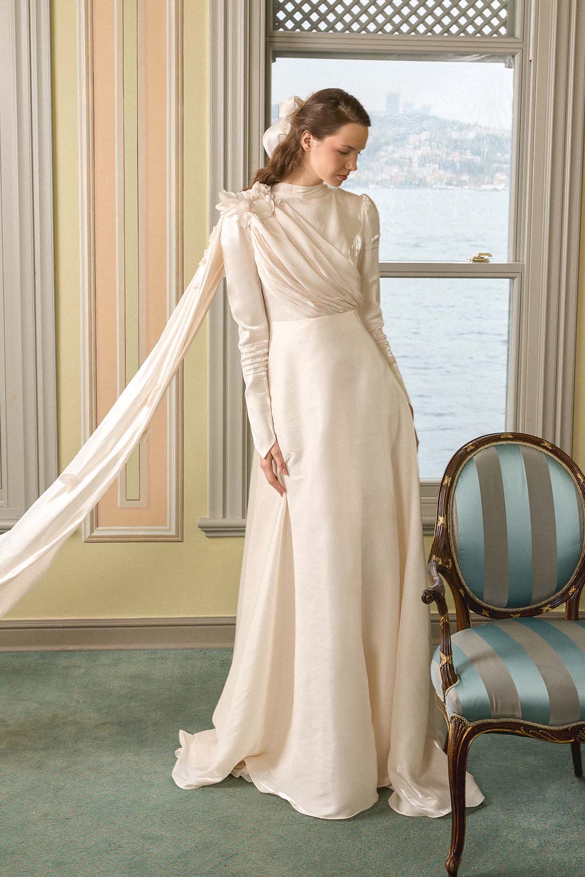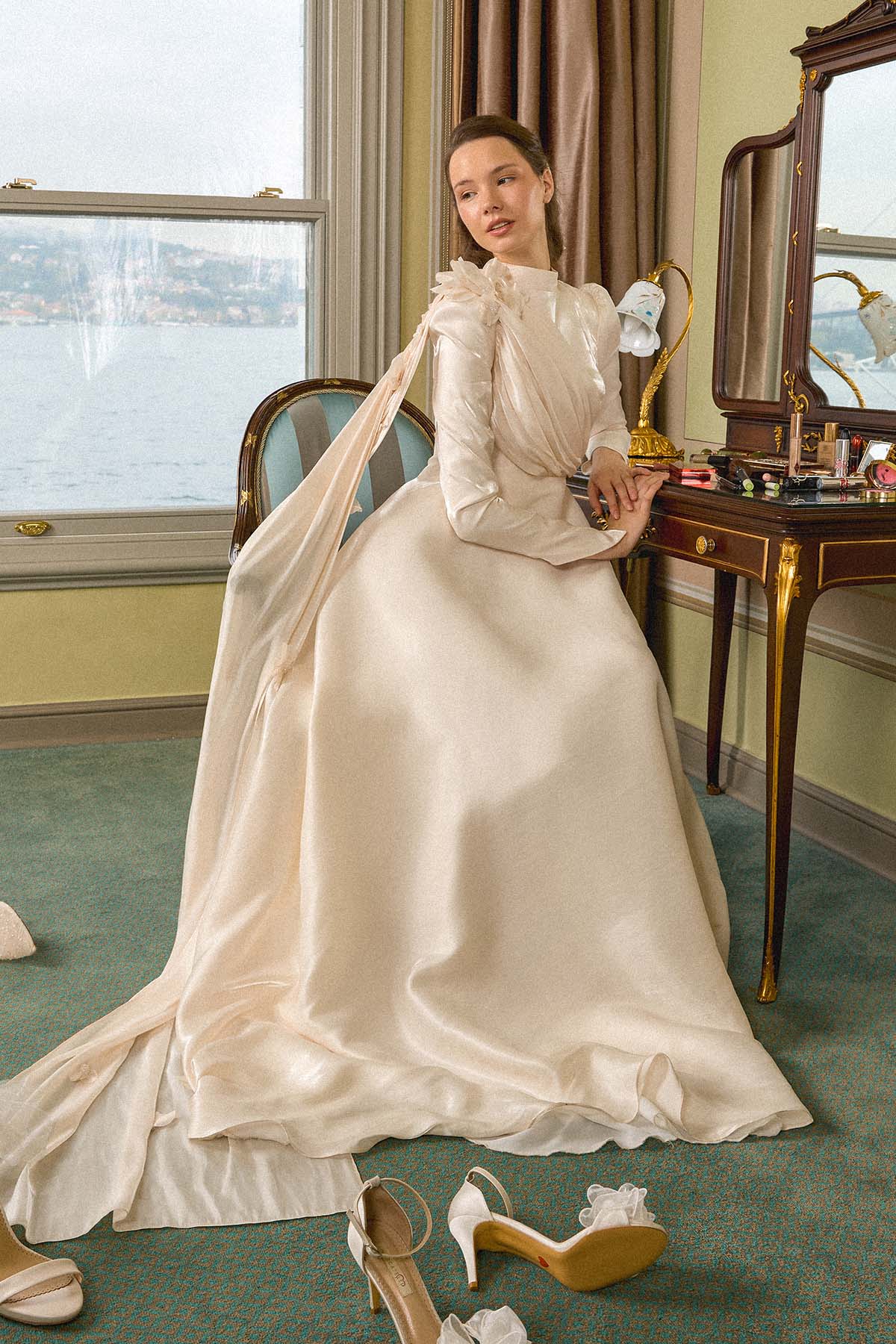 Ürün ortalama 155 cm. Ürünün arkası fermuarlıdır, astarlıdır. Özel üretilmiş ipek kumaş hazırlanmıştır. Sol omuzdan etek ucuna uzanan pelerini mevcuttur. El yapımı çiçekler ile hazırlanmıştır. Özel taşlar kullanılmıştır.