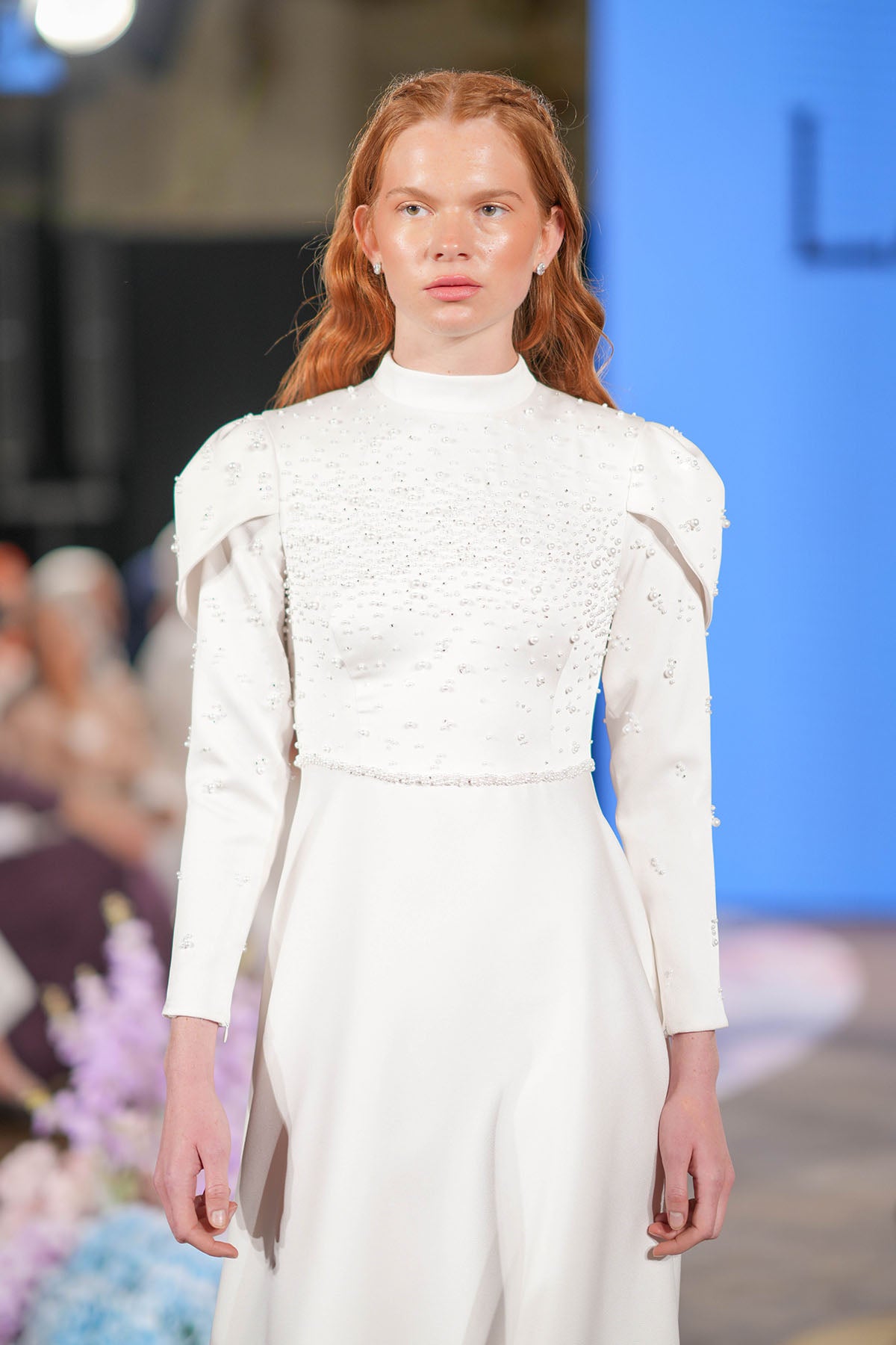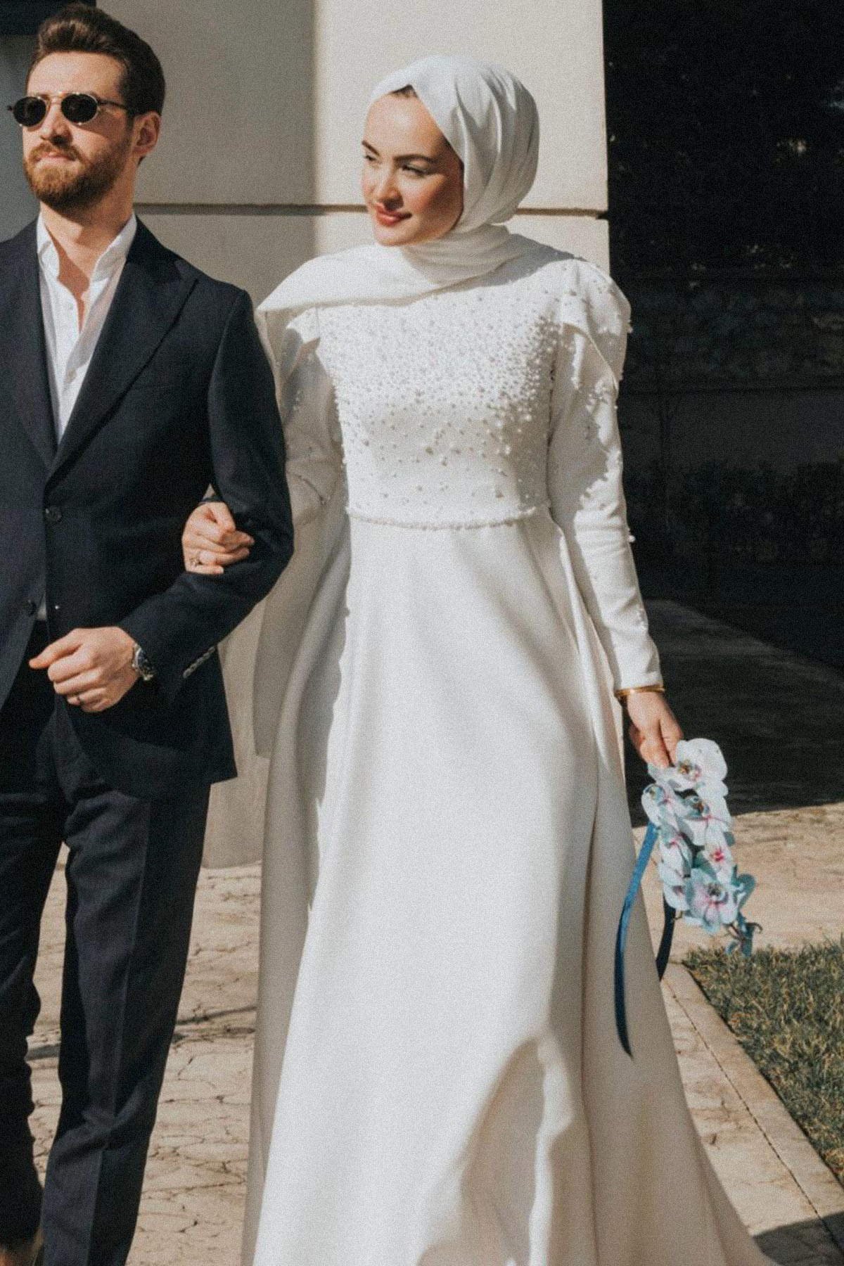Ürün ortalama 155 cm. Elbisenin arkası fermuarlıdır, astarlıdır, kuyrukludur Saten krep kumaştan hazırlanmıştır. Etek kısmı kloş formdadır. Üst kısmında ve kollarında incili özel işlemeler bulunmaktadır.