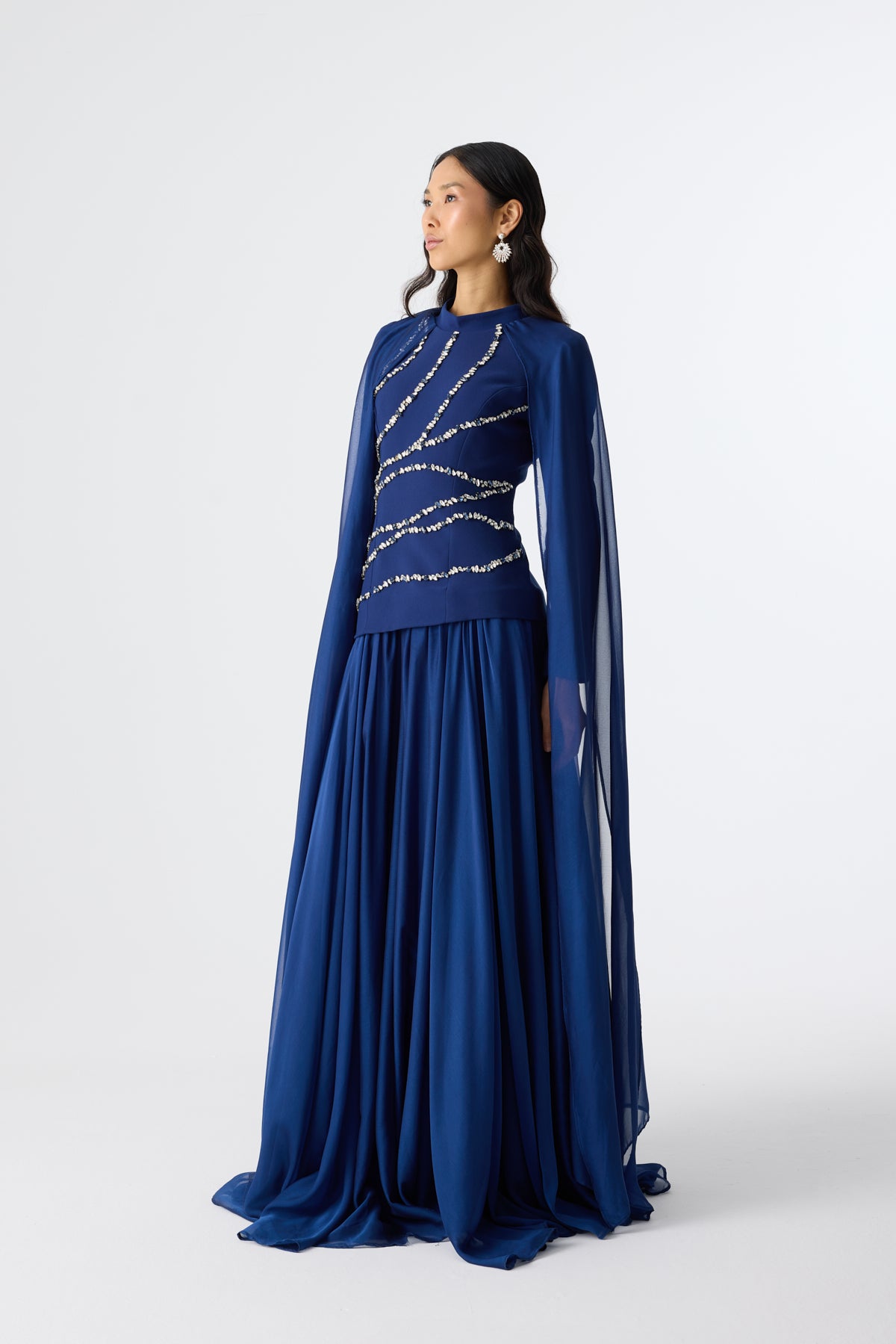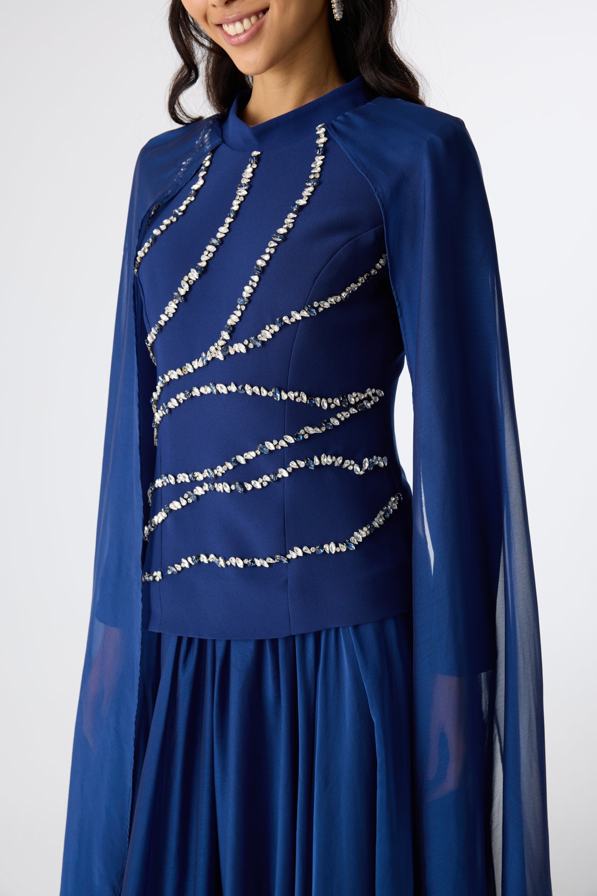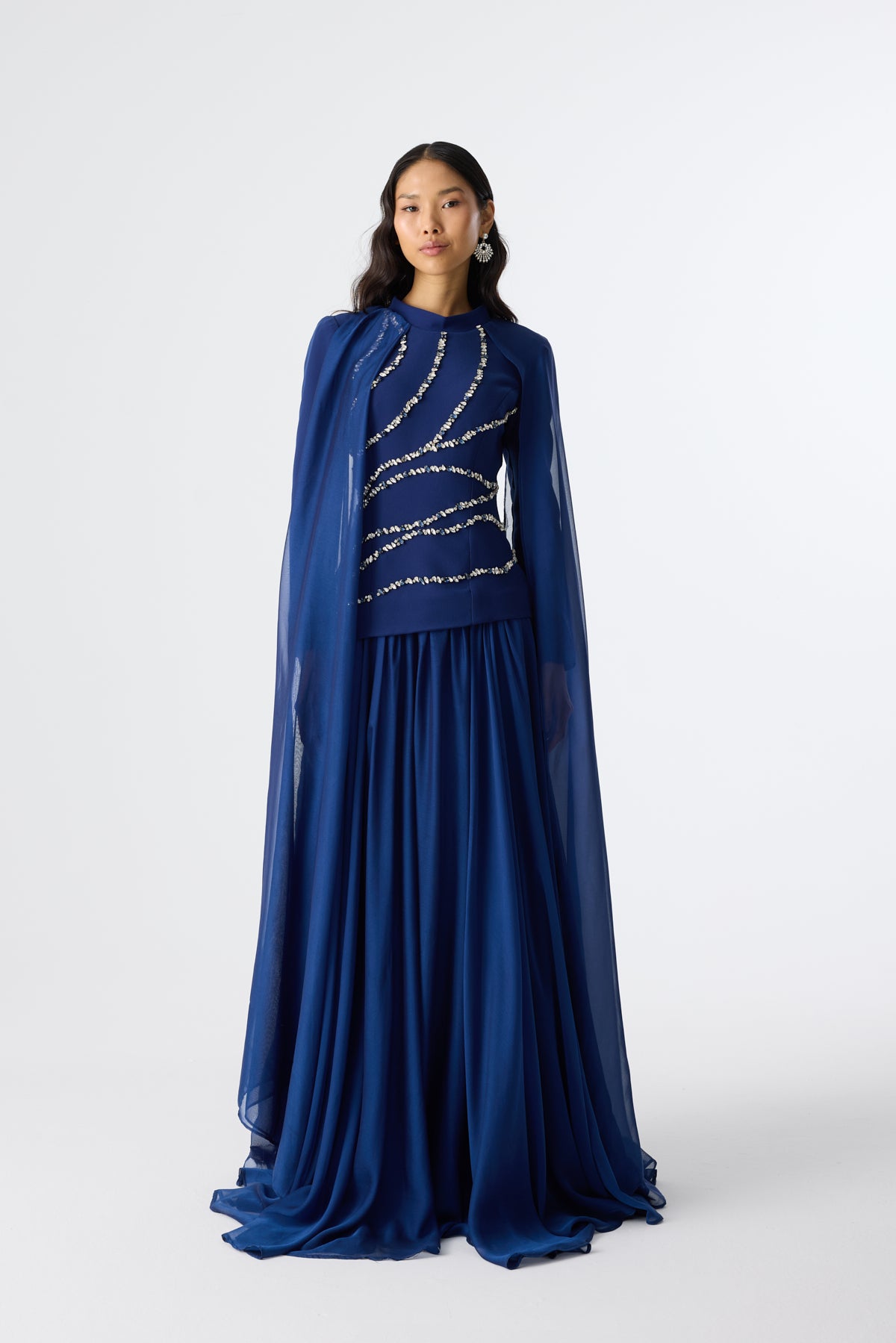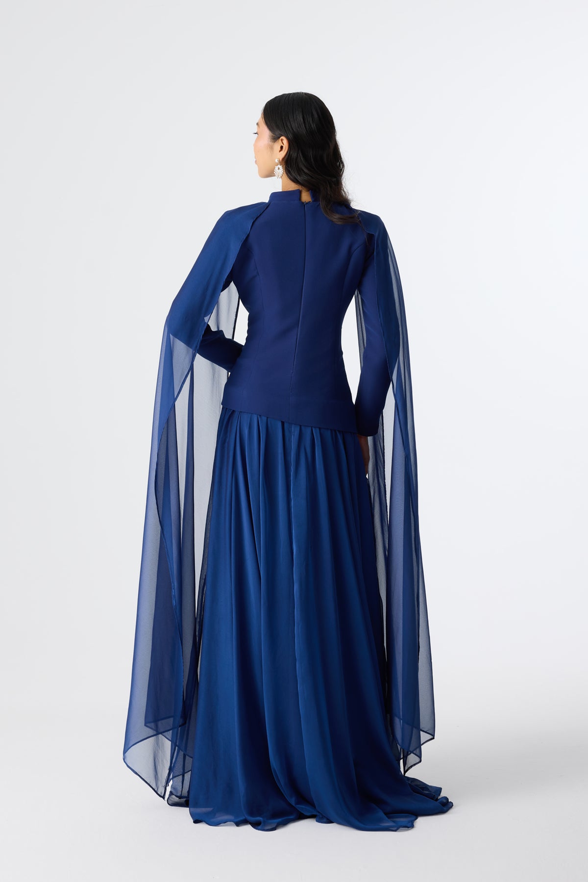 Omuzlardan eteğe doğru uzanan iki ayrı şifon parça bulunmaktadır.