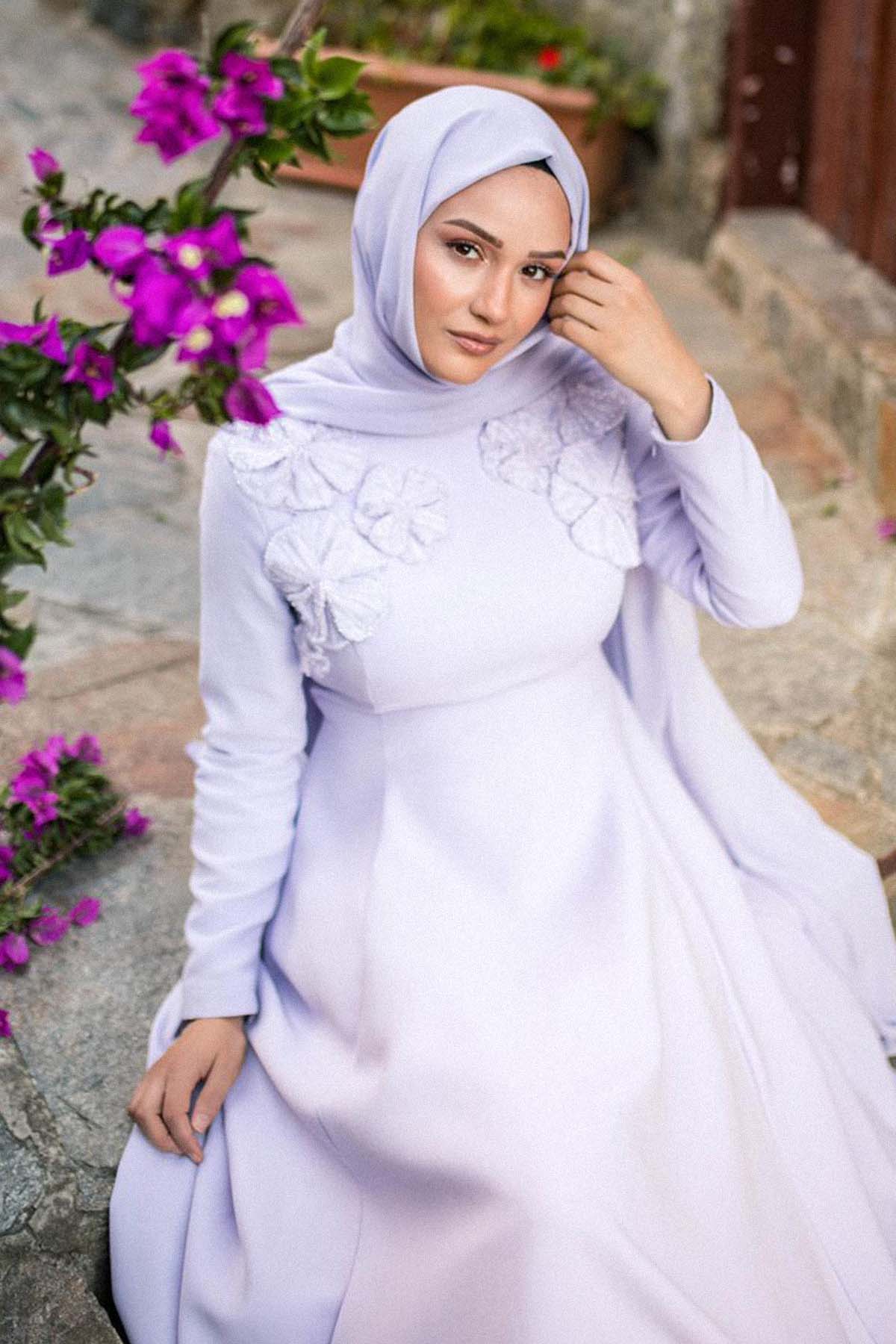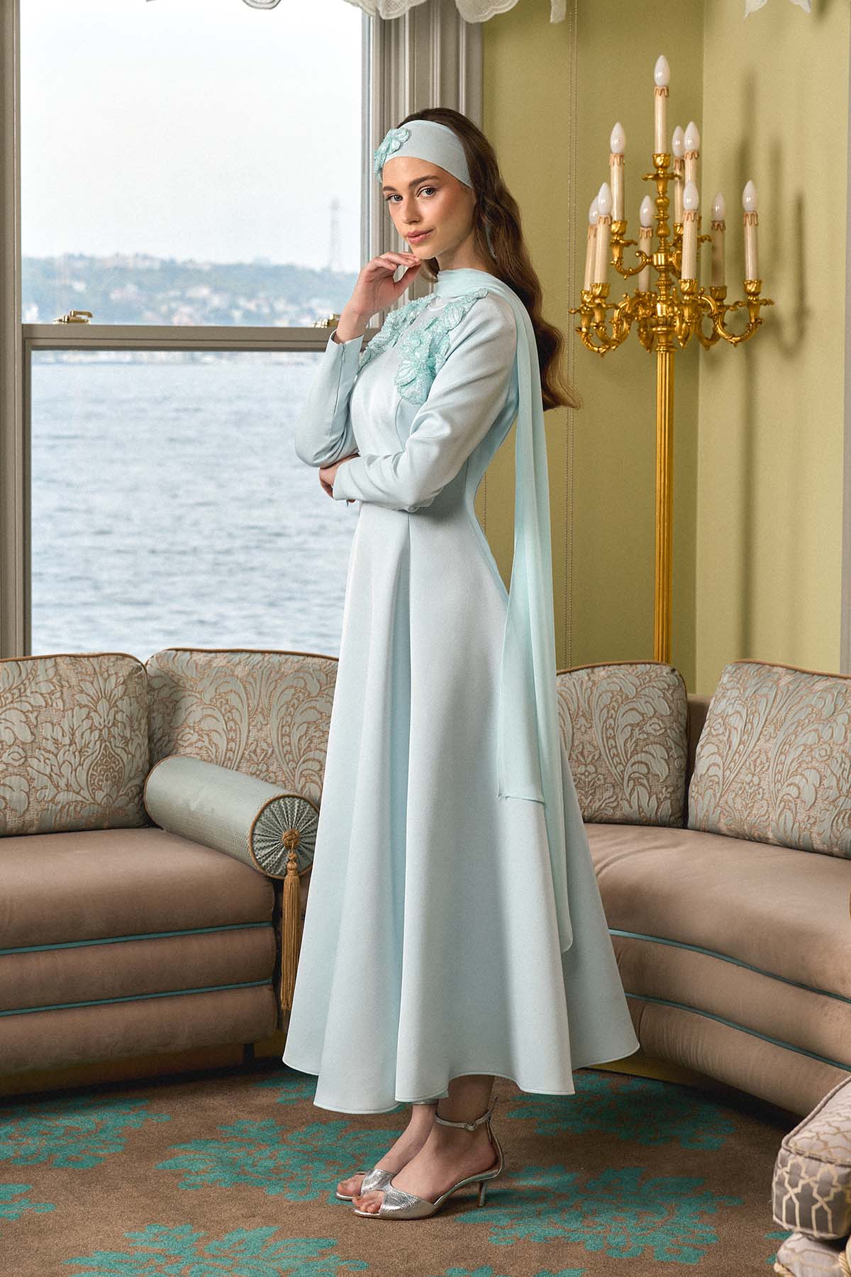 Ürün ortalama 135 cm. Ürünün arkası fermuarlıdır, astarlıdır. Krep kumaştan hazırlanmıştır. Yaka kısmında şifon detay mevcuttur. Kloş etek formuna sahiptir. Çiçek detayları el işçiliği ile işlenmiştir.