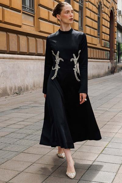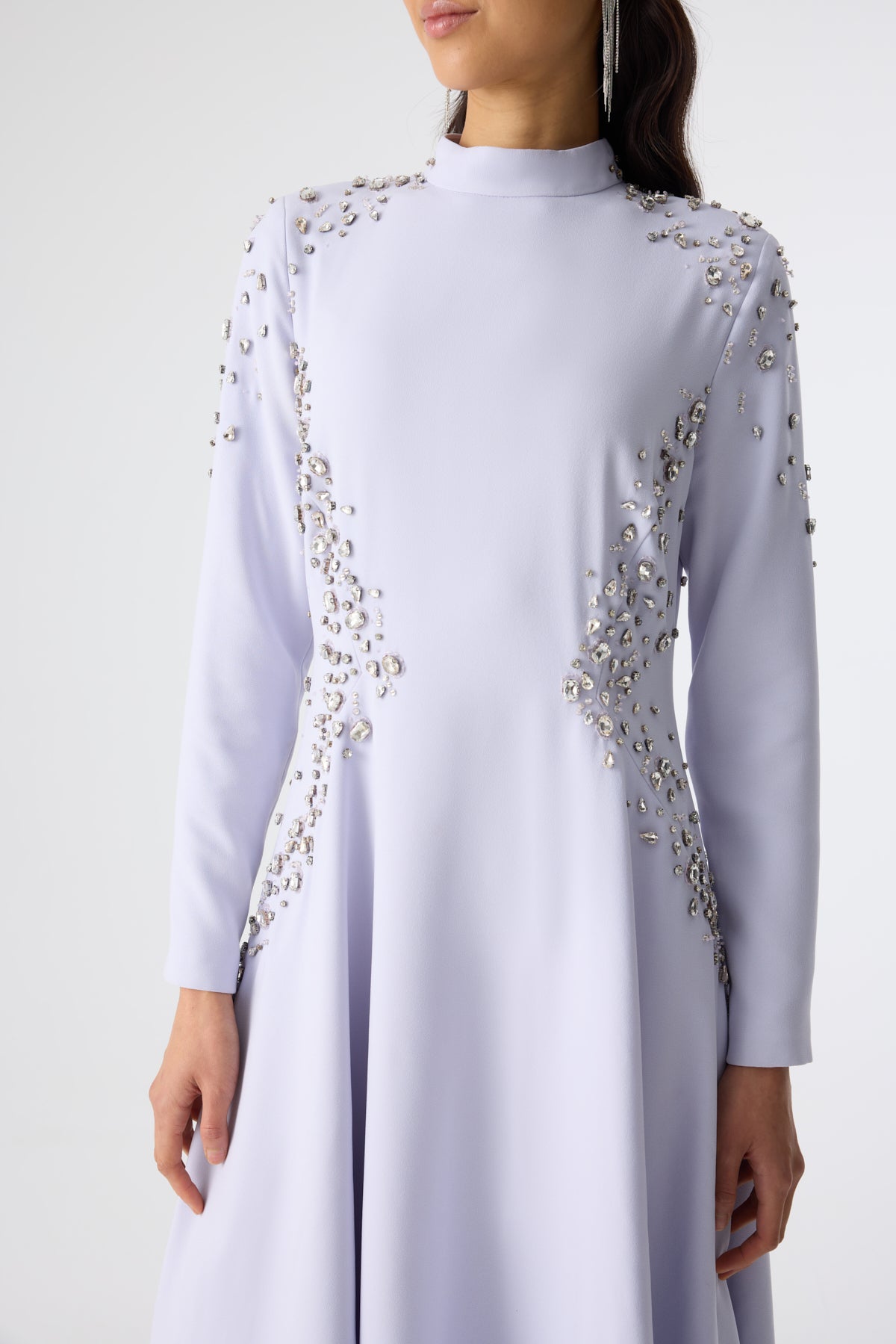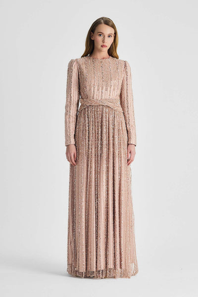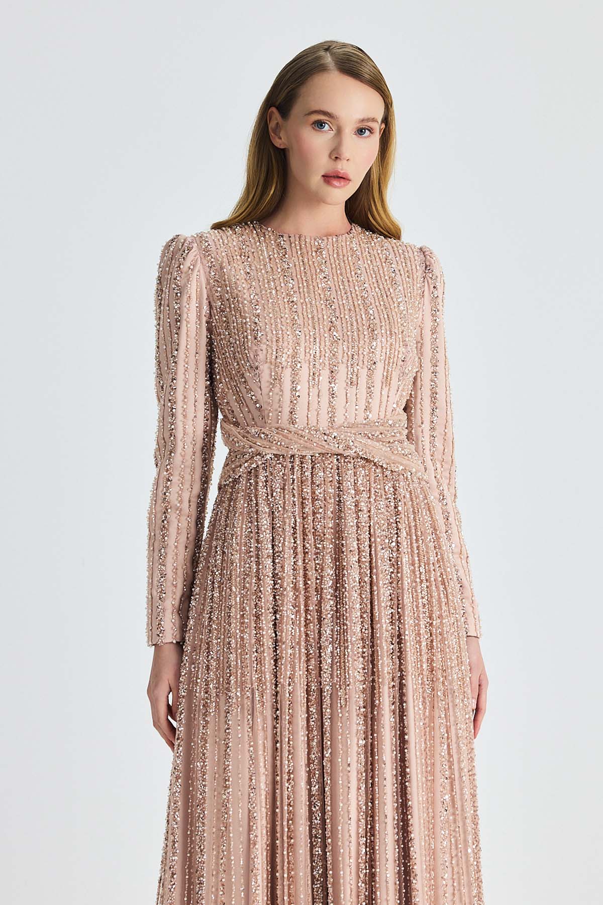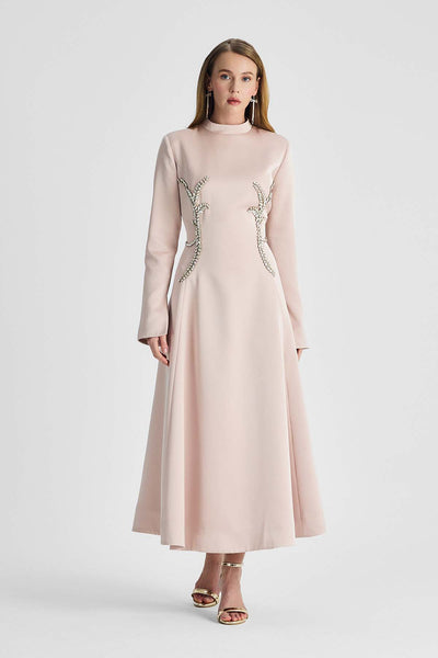 Ürün ortalama 135 cm. Elbisenin arkası fermuarlıdır, astarlıdır. Krep kumaştan hazırlanmıştır. Bel kısmındaki detaylar özel taşlarla özenle el işçiliği ile işlenmiştir.